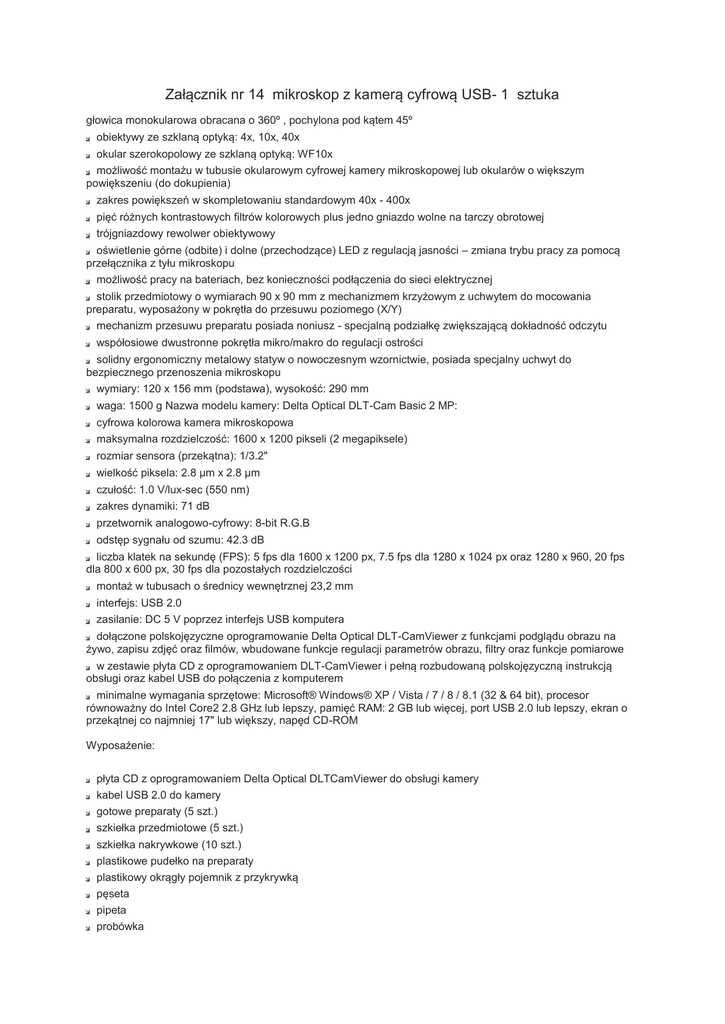 Załącznik nr 14 mikroskop z kamerą cyfrową USB- 1 sztuka głowica monokularowa obracana o 360º , pochylona pod kątem 45º obiektywy ze szklaną optyką: 4x, 10x, 40x okular szerokopolowy ze szklaną optyką: WF10x możliwość montażu w tubusie okularowym cyfrowej kamery mikroskopowej lub okularów o większym powiększeniu (do dokupienia) zakres powiększeń w skompletowaniu standardowym 40x - 400x pięć różnych kontrastowych filtrów kolorowych plus jedno gniazdo wolne na tarczy obrotowej trójgniazdowy rewolwer obiektywowy oświetlenie górne (odbite) i dolne (przechodzące) LED z regulacją jasności – zmiana trybu pracy za pomocą przełącznika z tyłu mikroskopu możliwość pracy na bateriach, bez konieczności podłączenia do sieci elektrycznej stolik przedmiotowy o wymiarach 90 x 90 mm z mechanizmem krzyżowym z uchwytem do mocowania preparatu, wyposażony w pokrętła do przesuwu poziomego (X/Y) mechanizm przesuwu preparatu posiada noniusz - specjalną podziałkę zwiększającą dokładność odczytu współosiowe dwustronne pokrętła mikro/makro do regulacji ostrości solidny ergonomiczny metalowy statyw o nowoczesnym wzornictwie, posiada specjalny uchwyt do bezpiecznego przenoszenia mikroskopu wymiary: 120 x 156 mm (podstawa), wysokość: 290 mm waga: 1500 g Nazwa modelu kamery: Delta Optical DLT-Cam Basic 2 MP: cyfrowa kolorowa kamera mikroskopowa maksymalna rozdzielczość: 1600 x 1200 pikseli (2 megapiksele) rozmiar sensora (przekątna): 1/3.2" wielkość piksela: 2.8 µm x 2.8 µm czułość: 1.0 V/lux-sec (550 nm) zakres dynamiki: 71 dB przetwornik analogowo-cyfrowy: 8-bit R.G.B odstęp sygnału od szumu: 42.3 dB liczba klatek na sekundę (FPS): 5 fps dla 1600 x 1200 px, 7.5 fps dla 1280 x 1024 px oraz 1280 x 960, 20 fps dla 800 x 600 px, 30 fps dla pozostałych rozdzielczości montaż w tubusach o średnicy wewnętrznej 23,2 mm interfejs: USB 2.0 zasilanie: DC 5 V poprzez interfejs USB komputera dołączone polskojęzyczne oprogramowanie Delta Optical DLT-CamViewer z funkcjami podglądu obrazu na żywo, zapisu zdjęć oraz filmów, wbudowane funkcje regulacji parametrów obrazu, filtry oraz funkcje pomiarowe w zestawie płyta CD z oprogramowaniem DLT-CamViewer i pełną rozbudowaną polskojęzyczną instrukcją obsługi oraz kabel USB do połączenia z komputerem minimalne wymagania sprzętowe: Microsoft® Windows® XP / Vista / 7 / 8 / 8.1 (32 & 64 bit), procesor równoważny do Intel Core2 2.8 GHz lub lepszy, pamięć RAM: 2 GB lub więcej, port USB 2.0 lub lepszy, ekran o przekątnej co najmniej 17" lub większy, napęd CD-ROM Wyposażenie: płyta CD z oprogramowaniem Delta Optical DLTCamViewer do obsługi kamery kabel USB 2.0 do kamery gotowe preparaty (5 szt.) szkiełka przedmiotowe (5 szt.) szkiełka nakrywkowe (10 szt.) plastikowe pudełko na preparaty plastikowy okrągły pojemnik z przykrywką pęseta pipeta probówka patyczek preparacyjny igła preparacyjna specjalny papier do czyszczenia optyki przylepne etykiety do opisywania preparatów przeciwkurzowy pokrowiec na mikroskop zasilacz sieciowy 4 szt. akumulatorków AA GP 2700 mAh ładowarka akumulatorków Ni-MH