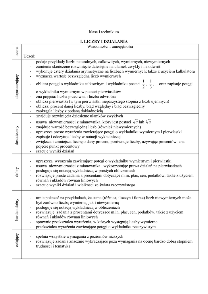 klasa I technikum I. LICZBY I DZIAŁANIA ocena Wiadomości i