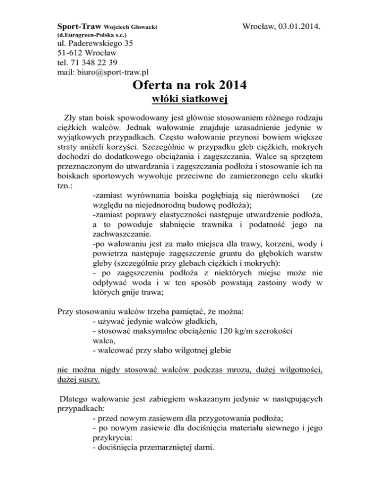 Sport-Traw Wojciech Głowacki Wrocław, 03.01.2014. (d.Eurogreen-Polska s.c.) ul. Paderewskiego 35 51-612 Wrocław tel. 71 348 22 39 mail: [email protected] Oferta na rok 2014 włóki siatkowej Zły stan boisk spowodowany jest głównie stosowaniem różnego rodzaju ciężkich walców. Jednak wałowanie znajduje uzasadnienie jedynie w wyjątkowych przypadkach. Często wałowanie przynosi bowiem większe straty aniżeli korzyści. Szczególnie w przypadku gleb ciężkich, mokrych dochodzi do dodatkowego obciążania i zagęszczania. Walce są sprzętem przeznaczonym do utwardzania i zagęszczania podłoża i stosowanie ich na boiskach sportowych wywołuje przeciwne do zamierzonego celu skutki tzn.: -zamiast wyrównania boiska pogłębiają się nierówności (ze względu na niejednorodną budowę podłoża); -zamiast poprawy elastyczności następuje utwardzenie podłoża, a to powoduje słabnięcie trawnika i podatność jego na zachwaszczanie. -po wałowaniu jest za mało miejsca dla trawy, korzeni, wody i powietrza następuje zagęszczenie gruntu do głębokich warstw gleby (szczególnie przy glebach ciężkich i mokrych): - po zagęszczeniu podłoża z niektórych miejsc może nie odpływać woda i w ten sposób powstają zastoiny wody w których gnije trawa; Przy stosowaniu walców trzeba pamiętać, że można: - używać jedynie walców gładkich, - stosować maksymalne obciążenie 120 kg/m szerokości walca, - walcować przy słabo wilgotnej glebie nie można nigdy stosować walców podczas mrozu, dużej wilgotności, dużej suszy. Dlatego wałowanie jest zabiegiem wskazanym jedynie w następujących przypadkach: - przed nowym zasiewem dla przygotowania podłoża; - po nowym zasiewie dla dociśnięcia materiału siewnego i jego przykrycia: - dociśnięcia przemarzniętej darni. Firma Sport-Traw poleca więc wprowadzenie do bieżącej pielęgnacji zamiast walców, sprowadzoną w praktyce przez wielu Klientów, WŁÓKĘ SIATKOWĄ, której systematyczne stosowanie pozwala na utrzymanie równego boiska z jednoczesnym usunięciem zniszczeń po treningach i meczach oraz przeczesywanie trawnika poprawiające warunki jego wegetacji. Włókowanie bezpośrednio po koszeniu wyczesuje z darni nie zebrany przez kosiarkę pokos, co zapobiega powstawaniu filcu. Dodatkowo przed meczem na wilgotnej trawie możliwe jest wykonanie poprzecznych pasów ułatwiających pracę sędziów liniowych, zwiększających wrażenie estetycznego wyglądu boiska u widzów. Włoka siatkowa może być użytkowana: -w połączeniu z samobieżną kosiarką; -w połączeniu z małym ciągnikiem; - może być ciągnięta przez dwie osoby Dane techniczne włóki siatkowej metalowej ocynkowanej: -powierzchnia 180cm x 240cm; -waga 35 kg.; -w stanie złożonym walec o średnicy 25cm i szerokości 180cm. Każde zastosowanie walca powoduje zniszczenie trawnika, natomiast systematyczne stosowanie włóki siatkowej wpływa korzystnie na stan trawnika. Włóka siatkowa jest sprzętem trwałym, do wykorzystania przez wiele lat. Koszt włóki siatkowej wynosi 3250,- zł brutto (w tym 23% VAT).