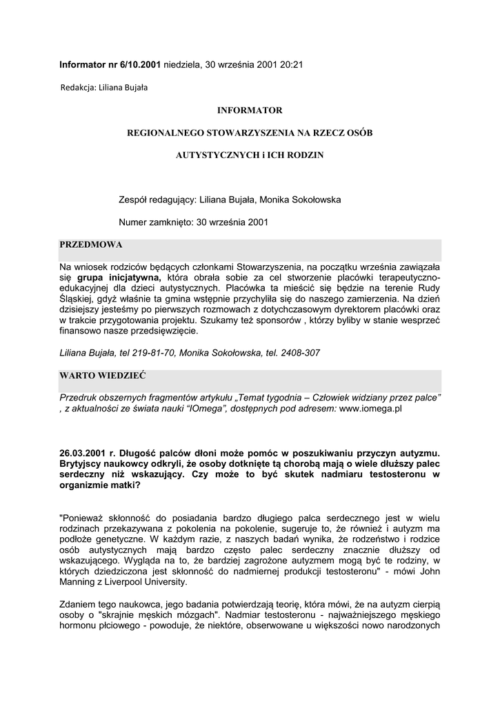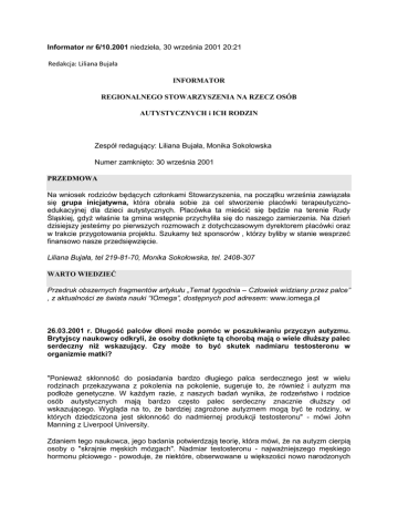 Informator nr 6/10.2001 niedziela, 30 września 2001 20:21 Redakcja: Liliana Bujała INFORMATOR REGIONALNEGO STOWARZYSZENIA NA RZECZ OSÓB AUTYSTYCZNYCH i ICH RODZIN Zespół redagujący: Liliana Bujała, Monika Sokołowska Numer zamknięto: 30 września 2001 PRZEDMOWA Na wniosek rodziców będących członkami Stowarzyszenia, na początku września zawiązała się grupa inicjatywna, która obrała sobie za cel stworzenie placówki terapeutycznoedukacyjnej dla dzieci autystycznych. Placówka ta mieścić się będzie na terenie Rudy Śląskiej, gdyż właśnie ta gmina wstępnie przychyliła się do naszego zamierzenia. Na dzień dzisiejszy jesteśmy po pierwszych rozmowach z dotychczasowym dyrektorem placówki oraz w trakcie przygotowania projektu. Szukamy też sponsorów , którzy byliby w stanie wesprzeć finansowo nasze przedsięwzięcie. Liliana Bujała, tel 219-81-70, Monika Sokołowska, tel. 2408-307 WARTO WIEDZIEĆ Przedruk obszernych fragmentów artykułu „Temat tygodnia – Człowiek widziany przez palce” , z aktualności ze świata nauki “IOmega”, dostępnych pod adresem: www.iomega.pl 26.03.2001 r. Długość palców dłoni może pomóc w poszukiwaniu przyczyn autyzmu. Brytyjscy naukowcy odkryli, że osoby dotknięte tą chorobą mają o wiele dłuższy palec serdeczny niż wskazujący. Czy może to być skutek nadmiaru testosteronu w organizmie matki? "Ponieważ skłonność do posiadania bardzo długiego palca serdecznego jest w wielu rodzinach przekazywana z pokolenia na pokolenie, sugeruje to, że również i autyzm ma podłoże genetyczne. W każdym razie, z naszych badań wynika, że rodzeństwo i rodzice osób autystycznych mają bardzo często palec serdeczny znacznie dłuższy od wskazującego. Wygląda na to, że bardziej zagrożone autyzmem mogą być te rodziny, w których dziedziczona jest skłonność do nadmiernej produkcji testosteronu" - mówi John Manning z Liverpool University. Zdaniem tego naukowca, jego badania potwierdzają teorię, która mówi, że na autyzm cierpią osoby o "skrajnie męskich mózgach". Nadmiar testosteronu - najważniejszego męskiego hormonu płciowego - powoduje, że niektóre, obserwowane u większości nowo narodzonych chłopców, zapóźnienia w rozwoju ich układu nerwowego, takie jak kłopoty w mówieniu czy wyrażaniu emocji, mogą się pogłębić do chorobliwych rozmiarów. Przypomnijmy, że - jak twierdzą eksperci - noworodek płci męskiej jest, w porównaniu z dziewczynką, opóźniony w rozwoju psychofizycznym o 4-6 tygodni. Męski płód jest także bardziej wrażliwy na uszkodzenia neurologiczne. Jednym z takich defektów jest właśnie autyzm, który - jak wiadomo - dotyka niemal wyłącznie chłopców. Liczne badania wykazały, że stosunek długości poszczególnych palców dłoni zostaje określony mniej więcej w czternastym tygodniu ciąży i pozostaje niezmieniony do końca życia człowieka. Dotychczas ukazało się wiele badań próbujących opisać i wyjaśnić to niezwykłe zjawisko. Wszystko wskazuje na to, że ma ono ścisły związek z ilością testosteronu w łonie matki - im więcej hormonu, tym palec serdeczny dłuższy. Ta sama cecha umożliwia również - jak sugerują liczne badania - rozpoznanie ludzi zagrożonych dysleksją, zawałem czy rakiem piersi. Pozwala także na rozpoznanie osób o wybitnych zdolnościach muzycznych oraz zidentyfikowanie mężczyzn charakteryzujących się wysoką płodnością (dłuższy palec serdeczny - wyższe stężenie testosteronu - większa liczba plemników.w.nasieniu). "Palce dłoni wykształcają się pod koniec pierwszego trymestru ciąży. Jest to przełomowy moment w rozwoju płodu. Skład koktajlu hormonalnego, w jakim jest on zanurzony, odgrywa w tym okresie bardzo ważną rolę. Testosteron wydłuża palec serdeczny i wzmacnia męskie cechy układu nerwowego. W skrajnych, lecz niestety wcale nie tak rzadkich przypadkach może to prowadzić do autyzmu" - konkluduje Manning. Gwoli sprawiedliwości dodajmy, że wcześniej podobne badania wykonali Simon BaronCohen i Svetlana Lutchmaya z Uniwersytetu Cambridge. Najpierw zmierzyli oni stężenie rozmaitych hormonów płciowych w łonach ciężarnych matek, a kiedy urodzone przez nie dzieci skończyły pierwszy rok, przeprowadzili testy psychofizyczne, zwracając uwagę na takie przejawy zachowań autystycznych, jak unikanie przez nie kontaktu wzrokowego czy opóźnienie w mówieniu. Najgorzej wypadły dzieci, których matki miały w pierwszych miesiącach ciąży.największe.stężenie.testosteronu. Badacze z Cambridge uważają, że na podstawie pomiarów długości palców dzieci można będzie już w pierwszych tygodniach życia określać grupę podwyższonego zagrożenia autyzmem i w razie stwierdzenia pierwszych symptomów choroby, natychmiast podjąć leczenie i zapobiec rozwojowi tej tajemniczej dolegliwości. ŚDSy Specjalistyczne usługi opiekuńcze mogą być świadczone nie tylko „na miejscu u klienta”, ale również w formie dziennego pobytu w ŚDSach. Dla niektórych z Państwa ten skrót zapewne brzmi tajemniczo – oto, co oznacza: Środowiskowy Dom Samopomocy dla Osób z Zaburzeniami Psychicznymi. Autyzm wg międzynarodowej klasyfikacji chorób jest zaburzeniem psychicznym. Może to, więc, być miejsce dla naszych pełnoletnich dzieci, chociaż wymogi są nie dla wszystkich możliwe do spełnienia. W większości, pacjentami Domów Samopomocy są osoby cierpiące na schizofrenię oraz depresję (mające swój początek dopiero w wieku dorosłym), stąd też często są one w stanie samodzielnie napisać podanie i przyjść do pracownika socjalnego. Jednak może to zrobić również opiekun, szczególnie, jeśli podopieczny jest ubezwłasnowolniony. Domy te zapewniają atrakcyjne wypełnienie dnia w godzinach roboczych, mogą stać się miejscem zawierania przyjaźni, zaś rodzicom dają pół dnia na odsapnięcie. Bardzo cieszy mnie ten artykuł, dotyczący osób dorosłych, bow