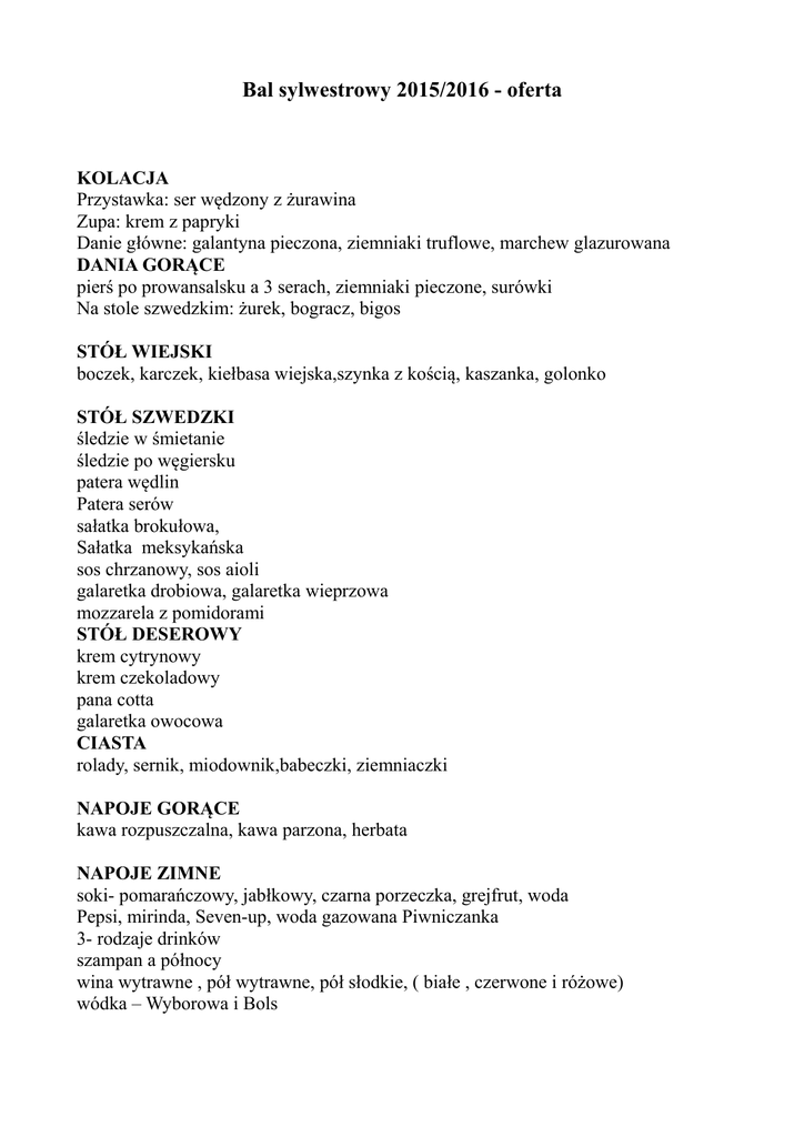 Bal sylwestrowy 2015/2016 - oferta KOLACJA Przystawka: ser wędzony z żurawina Zupa: krem z papryki Danie główne: galantyna pieczona, ziemniaki truflowe, marchew glazurowana DANIA GORĄCE pierś po prowansalsku a 3 serach, ziemniaki pieczone, surówki Na stole szwedzkim: żurek, bogracz, bigos STÓŁ WIEJSKI boczek, karczek, kiełbasa wiejska,szynka z kością, kaszanka, golonko STÓŁ SZWEDZKI śledzie w śmietanie śledzie po węgiersku patera wędlin Patera serów sałatka brokułowa, Sałatka meksykańska sos chrzanowy, sos aioli galaretka drobiowa, galaretka wieprzowa mozzarela z pomidorami STÓŁ DESEROWY krem cytrynowy krem czekoladowy pana cotta galaretka owocowa CIASTA rolady, sernik, miodownik,babeczki, ziemniaczki NAPOJE GORĄCE kawa rozpuszczalna, kawa parzona, herbata NAPOJE ZIMNE soki- pomarańczowy, jabłkowy, czarna porzeczka, grejfrut, woda Pepsi, mirinda, Seven-up, woda gazowana Piwniczanka 3- rodzaje drinków szampan a północy wina wytrawne , pół wytrawne, pół słodkie, ( białe , czerwone i różowe) wódka – Wyborowa i Bols