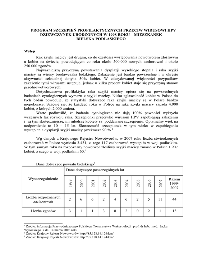 PROGRAM SZCZEPIEŃ PROFILAKTYCZNYCH PRZECIW WIRUSOWI HPV DZIEWCZYNEK URODZONYCH W 1998 ROKU – MIESZKANEK BIELSKA PODLASKIEGO Wstęp Rak szyjki macicy jest drugim, co do częstości występowania nowotworem złośliwym u kobiet na świecie, powodującym co roku około 500.000 nowych zachorowań i około 250.000 zgonów. Najważniejszą przyczyną powstawania dysplazji wysokiego stopnia i raka szyjki macicy są wirusy brodawczaka ludzkiego. Zakażenie jest bardzo powszechne i w okresie aktywności seksualnej dotyka 50% kobiet. W zdecydowanej większości przypadków zakażenie tymi wirusami ustępuje, jednak u kilku procent kobiet staje się przyczyną stanów przednowotworowych. Dotychczasowa profilaktyka raka szyjki macicy opiera się na powszechnych badaniach cytologicznych wymazu z szyjki macicy. Niska zgłaszalność kobiet w Polsce do tych badań powoduje, że statystyki dotyczące raka szyjki macicy są w Polsce bardzo niepokojace. Szacuje się, że każdego roku w Polsce na raka szyjki macicy zapada 4.000 kobiet, z których 2.000 umiera. Warto podkreślić, że badania cytologiczne nie dają 100% pewności wykrycia wczesnych faz rozwoju raka. Szczepionki przeciwko wirusom HPV zapobiegają zakażeniu i są tym skuteczniejsze, im młodsze kobiety są poddawane szczepieniu. Optymalny wiek na uodpornienie to 10 – 15 lat. Skuteczność szczepionek w tym wieku w zapobieganiu wystąpienia dysplazji szyjki macicy przekracza 90 %.1 Wg danych z Krajowego Rejestru Nowotworów, w 2007 roku liczba stwierdzonych zachorowań w Polsce wyniosła 3.431, z tego 117 zachorowań wystąpiło w woj. podlaskim. W tym samym roku na rozpoznany nowotwór złośliwy szyjki macicy zmarło w Polsce 1.907 kobiet, z czego w woj. podlaskim 60.2 Dane dotyczące powiatu bielskiego3 Dane dotyczące poszczególnych lat 1 1999 2000 2001 2002 2003 2004 2005 2006 2007 Wyszczególnienie Razem 19992007 Liczba rozpoznanych zachorowań 2 6 6 2 4 6 2 5 11 44 Liczba zgonów 3 1 1 3 0 2 0 2 1 13 Źródło: informacja Przewodniczącego Polskiego Towarzystwa Wakcynologii prof. dr hab. med. Jacka Wysockiego z dn. 14 marca 2008 roku. 2 Źródło: Krajowy Rejestr Nowotworów http://85.128.14.124/krn/ 3 Źródło: Krajowy Rejestr Nowotworów http://85.128.14.124/krn/ I. Podstawa prawna programu Podstawę prawną programu stanowi art. 7 ust 1, pkt 1 ustawy z dnia 27 sierpnia 2004 r. o świadczeniach opieki zdrowotnej finansowanych ze środków publicznych (Dz. U. z 2008 r. Nr 164, poz. 1027 z późn. zm.), zgodnie z którym do zadań własnych gminy w zakresie zapewnienia równego dostępu do świadczeń opieki zdrowotnej należy w szczególności opracowanie i realizacja oraz ocena efektów programów zdrowotnych wynikających z rozpoznanych potrzeb zdrowotnych i stanu zdrowia mieszkańców gminy. W ramach realizacji programu zakłada się: 1) prowadzenie akcji informacyjno - edukacyjnej wśród rodziców (opiekunów prawnych) uczennic szkół podstawowych objętych programem, 2) przeprowadzenie szczepień profilaktycznych przeciw rakowi szyjki macicy dziewczynek urodzonych w 1998 roku – mieszkanek Bielska Podlaskiego. II. Cel programu Głównym celem programu jest zapobieganie zachorowaniom na raka szyjki macicy wśród populacji dziewczynek urodzonych w 1998 roku poprzez wykonanie szczepień ochronnych w celu zaspokojenia zbiorowych potrzeb mieszkańców miasta Bielsk Podlaski. Ponadto realizacja programu ma na celu uświadomienie społeczności lokalnej znaczenia pierwotnej profilaktyki raka szyjki macicy oraz w późniejszym etapie badań cytologicznych. III. Beneficjenci programu Beneficjentami końcowymi programu (osoby, których bezpośrednio dotyczy program) są dziewczynki - mieszkanki Bielska Podlaskiego. W 2010 roku programem zostanie objęta populacja dziewczynek urodzonych w 1998 roku. Zakłada się, iż w 2010 roku przy zapewnieniu równego dostępu do świadczeń, przewidywana liczba uprawnionych do objęcia programem wyniesie 118 osób.4 IV. Sposób realizacji i finansowania programu Organem przygotowującym i koordynującym program jest Burmistrz Miasta Bielsk Podlaski. Odpowiedzialnym za realizację programu jest Referat Oświaty i Kultury Urzędu Miasta Bielsk Podlaski. Program będzie realizowany we współpracy ze szkołami podstawowymi w Bielsku Podlaskim. Finansowanie programu: ze środków budżetu miasta zaplanowanych w dziale 851 rozdział 85195. Realizatorzy programu – podmioty upoważnione na podstawie odrębnych przepisów do świadczenia usług zdrowotnych dysponujące punktem szczepień na terenie miasta Bielsk Podlaski zostaną wyłonione w drodze konkursu ofert. Realizacja programu polega na: • przeprowadzeniu akcji informacyjno – edukacyjnej • uzyskaniu pisemnej zgody od rodzica lub opiekuna prawnego na wykonanie cyklu szczepień • badaniu lekarskim i kwalifikacji do szczepienia • wykonaniu pełnego cyklu szczepienia • dokonaniu stosownych wpisów potwierdzających wykonanie szczepień w dokumentacji medycznej. 4 Źródło: Dane z Referatu Spraw Obywatelskich UM Bielsk Podlaski V. Harmonogram realizacji programu Lp. Zadanie 1. Przyjęcie programu 2. Ogłoszenie i rozstrzygnięcie konkursu ofert 3. Przeprowadzenie akcji informacyjnoedukacyjnej 4. Szczepienia ochronne 5. Rozliczenie merytoryczne i finansowe programu Termin realizacji marzec 2010 r. lipiec – sierpień 2010 r. wrzesień 2010 r. wrzesień 2010 r. – kwiecień 2011 r. maj 2011 r. VI. Monitoring programu Realizacja programu będzie na bieżąco monitorowana przez Referat Oświaty i Kultury Urzędu Miasta Bielsk Podlaski. Zakresem monitoringu zostaną objęte: • przebieg akcji informacyjno-edukacyjnej, w tym rzetelnego informowania i uświadamiania beneficjentów programu, że szczepienia nie eliminują ani nie zmniejszają potrzeby wykonania regularnych cytologicznych badań profilaktycznych zgodnie z obecnie obowiązującymi zaleceniami, • szczepienia ochronne, • dokumentacja medyczna po zakończeniu szczepień