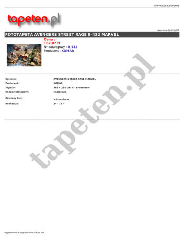 Informacje o produkcie Utworzono 04-03-2017 FOTOTAPETA AVENGERS STREET RAGE 8-432 MARVEL Cena : 167,87 zł AVENGERS STREET RAGE MARVEL Producent: KOMAR Wymiar: 368 X 254 cm 8 - elementów Rodzaj fototapety: Papierowa Zalecany klej: w komplecie 24 - 72 h ta Realizacja: pe te n Kolekcja: .p l Nr katalogowy : 8-432 Producent : KOMAR Wygenerowano w programie www.oscGold.com