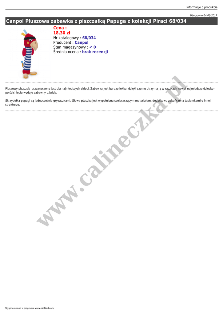 Informacje o produkcie Utworzono 04-03-2017 Canpol Pluszowa zabawka z piszczałką Papuga z kolekcji Piraci 68/034 Cena : 18,30 zł pl Nr katalogowy : 68/034 Producent : Canpol Stan magazynowy : < 0 Średnia ocena : brak recenzji Pluszowy piszczek przeznaczony jest dla najmłodszych dzieci. Zabawka jest bardzo lekka, dzięki czemu utrzyma ją w rączkach nawet najmłodsze dziecko po ściśnięciu wydaje zabawny dźwięk. w w w .c al in ec zk a. Skrzydełka papugi są jednocześnie gryzaczkami. Głowa ptaszka jest wypełniona szeleszczącym materiałem, dodatkowo zakończona tasiemkami o innej strukturze. Wygenerowano w programie www.oscGold.com