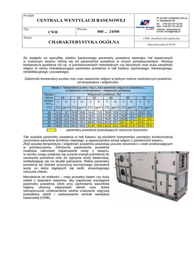 Produkt CENTRALA WENTYLACJI BASENOWEJ Typ: Wersja: CWB 800 ... 24500 Temat: CWB- charakterystyka ogólna.doc CHARAKTERYSTYKA OGÓLNA Data utworzenia 04-03-05 Ze względu na specyfikę obiektu basenowego parametry powietrza wewnątrz hal basenowych w znacznym stopniu różnią się od parametrów powietrza w innych pomieszczeniach. Wyższa temperatura powietrza niż np. w pomieszczeniach mieszkalnych czy biurowych oraz duża zawartość wilgoci to cechy charakteryzujące parametry powietrza w hali basenu (sportowego, rekreacyjnego, rehabilitacyjnego i prywatnego). Zależność temperatury punktu rosy oraz zawartości wilgoci w jednym metrze sześciennym powietrza od temperatury i wilgotności. - parametry powietrza powodujących odczucie duszności. Tak wysokie parametry powietrza w hali basenu są wynikiem kompromisu pomiędzy koniecznością utrzymania warunków komfortu cieplnego, a ograniczeniem emisji wilgoci z powierzchni basenu. Zbyt wysoka temperatura i wilgotność powietrza powodują uczucie duszności u osób przebywających w pomieszczeniu. Obniżenie parametrów powietrza zwiększa natomiast odparowanie wody z basenu, w wyniku czego zwiększy się zużycie energii potrzebnej do osuszenia powietrza oraz do ogrzania wody basenowej, ochładzającej się na skutek parowania. Niskie parametry powietrza są również przyczyną wzmożonego parowania wody ze skóry kąpiących się osób, powodującego odczucie chłodu. Niezależnie od wielkości – mały prywatny basen czy duży obiekt z zespołem basenów, aby zapewniać wymagane parametry powietrza, które przy zachowaniu warunków higieny utworzą odpowiedni klimat oraz dobre samopoczucie użytkowników istotne znaczenie odgrywa prawidłowy dobór i zastosowanie centrali wentylacji basenowej (CWB). Podstawowe funkcje centrali wentylacji basenowej: oczyszczanie (filtracja) powietrza, osuszanie powietrza, ogrzewanie (chłodzenie) hali basenowej, odzysk ciepła z powietrza usuwanego z hali basenu. Parametry oferowanych central wentylacji basenowej: Wysoka sprawność i niezawodność działania, Precyzyjna mikroprocesorowa regulacja wilgotności w hali basenu. Automatyczna regulacja strumienia powietrza zewnętrznego i recyrkulacyjnego w zależności od zapotrzebowania. Możliwość ustawienia minimalnego strumienia powietrza zewnętrznego w dzień i w nocy wg zegara czasu rzeczywistego. Udział powietrza zewnętrznego w lecie – 0 do 100%, udział powietrza zewnętrznego w zimie – 0 do 40%. Precyzyjna mikroprocesorowa regulacja temperatury powietrza nawiewanego i temperatury powietrza w pomieszczeniu (temperatura nawiewu jest funkcją zapotrzebowania na ciepło w pomieszczeniu). Automatyczna regulacja sprawności wymiennika krzyżowego (od zera do nominalnej) w okresie przejściowym i w lecie. Możliwość uzyskania odpowiedniej temperatury nawiewu dzięki płynnej regulacji stopnia otwarcia przepustnicy by-pass przy zbyt dużych zyskach ciepła w pomieszczeniu basenu. Wzmożone wentylowanie w lecie z pominięciem wymiennika krzyżowego w celu usunięcia zbyt dużych zysków ciepła. Ochrona przed szronieniem wymiennika krzyżowego realizowana bez wykorzystania przepustnicy by-pass (nie wymaga zapasu mocy cieplnej nagrzewnicy). Na potrzeby tej funkcji zamontowana dodatkowa przepustnica recyrkulacyjna. Podwójna ochrona przed zamarznięciem nagrzewnicy. Osuszanie powietrza w pomieszczeniu realizowane jest za pomocą powietrza zewnętrznego. Po osiągnięciu zadanych parametrów (temperatura, wilgotność) automatyczne przełączenie centrali na pracę „dyżurną” (wentylatory przełączane są na wolniejszy bieg). Centrala przełączy się w pracę „dyżurną” tylko wówczas, gdy nagrzewnica dysponuje odpowiednim zapasem mocy cieplnej przy zmniejszonym wydatku powietrza. Brak roszenia przegród wewnętrznych centrali podczas pracy w specyficznych warunkach panujących w środowisku basenowym. Doboru centrali wentylacyjnej dla hali basenowej : W celu prawidłowego doboru centrali klimatyzacyjnej dla hali basenowej należy uwzględnić w obliczeniach: zyski wilgoci, ilość powietrza, które należy dostarczyć do hali basenowej, aby zapewnić właściwą asymilację zysków wilgoci, ilość powietrza, które należy nawiać w celu odpowiedniej wymiany i ujednolicenia parametrów powietrza w całej kubaturze hali, ilość powietrza, które należy nawiać pionowo wzdłuż okien hali basenowej, aby uniknąć parowania szyb i okuć okiennych, ilość powietrza, które należy dostarczyć do hali basenowej, aby zapewnić właściwą ilość świeżego powietrza dla osób przebywających w hali basenu. Uwagi końcowe: Szczegółowe dane dotyczące poszczególnych modeli central wentylacji basenowej znajdują się w osobnych kartach katalogowych.