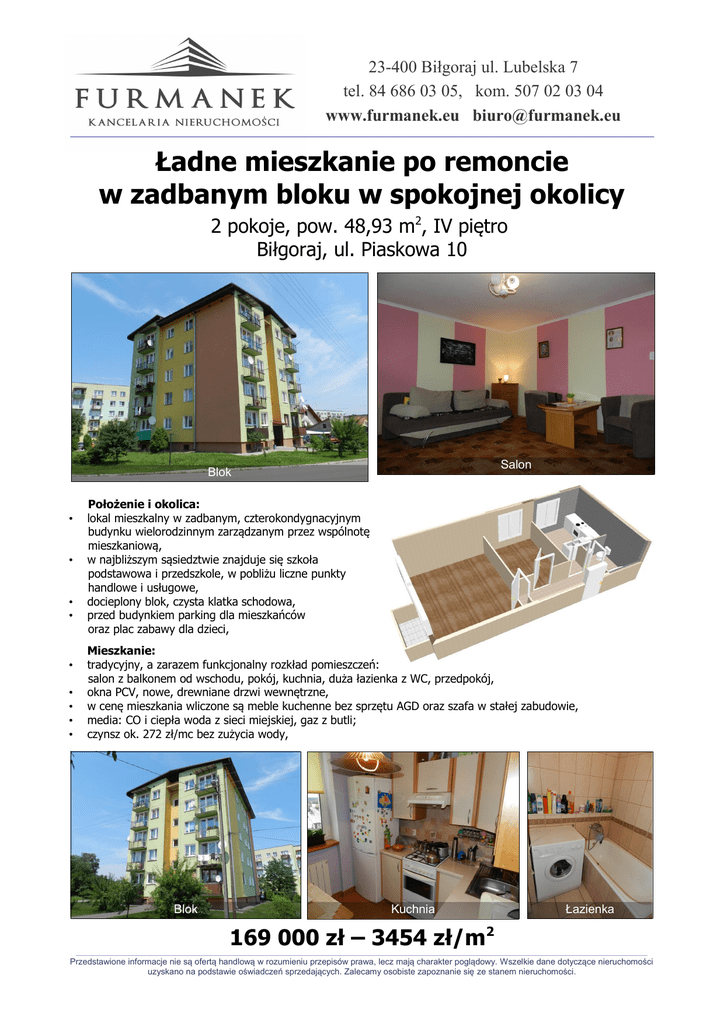 23-400 Biłgoraj ul. Lubelska 7 tel. 84 686 03 05, kom. 507 02 03 04 www.furmanek.eu [email protected] ________________________________________________________________________________________________________________________ Ładne mieszkanie po remoncie w zadbanym bloku w spokojnej okolicy 2 pokoje, pow. 48,93 m2, IV piętro Biłgoraj, ul. Piaskowa 10 Salon Blok • • • • • • • • • Położenie i okolica: lokal mieszkalny w zadbanym, czterokondygnacyjnym budynku wielorodzinnym zarządzanym przez wspólnotę mieszkaniową, w najbliższym sąsiedztwie znajduje się szkoła podstawowa i przedszkole, w pobliżu liczne punkty handlowe i usługowe, docieplony blok, czysta klatka schodowa, przed budynkiem parking dla mieszkańców oraz plac zabawy dla dzieci, Mieszkanie: tradycyjny, a zarazem funkcjonalny rozkład pomieszczeń: salon z balkonem od wschodu, pokój, kuchnia, duża łazienka z WC, przedpokój, okna PCV, nowe, drewniane drzwi wewnętrzne, w cenę mieszkania wliczone są meble kuchenne bez sprzętu AGD oraz szafa w stałej zabudowie, media: CO i ciepła woda z sieci miejskiej, gaz z butli; czynsz ok. 272 zł/mc bez zużycia wody, Blok Kuchnia Łazienka 169 000 zł – 3454 zł/m2 ___________________________________________________________________________________________________________________________________________________________________________________________________________________________________________ Przedstawione informacje nie są ofertą handlową w rozumieniu przepisów prawa, lecz mają charakter poglądowy. Wszelkie dane dotyczące nieruchomości uzyskano na podstawie oświadczeń sprzedających. Zalecamy osobiste zapoznanie się ze stanem nieruchomości.