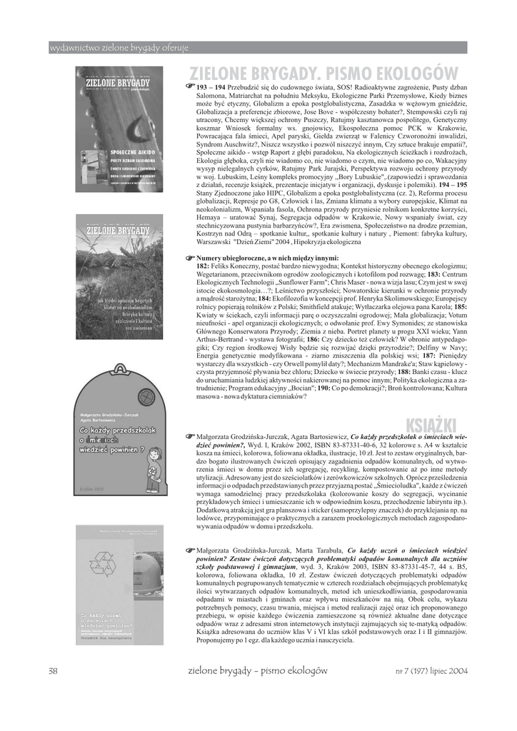 wydawnictwo zielone brygady oferuje ZIELONE BRYGADY. PISMO EKOLOGÓW 193 – 194 Przebudziæ siê do cudownego œwiata, SOS! Radioaktywne zagro¿enie, Pusty dzban Salomona, Matriarchat na po³udniu Meksyku, Ekologiczne Parki Przemys³owe, Kiedy biznes mo¿e byæ etyczny, Globalizm a epoka postglobalistyczna, Zasadzka w wê¿owym gnieŸdzie, Globalizacja a preferencje zbiorowe, Jose Bove - wspó³czesny bohater?, Stempowski czyli raj utracony, Chcemy wiêkszej ochrony Puszczy, Ratujmy kasztanowca pospolitego, Genetyczny koszmar Wniosek formalny ws. gnojowicy, Ekospo³eczna pomoc PCK w Krakowie, Powracaj¹ca fala œmieci, Apel paryski, Gie³da zwierz¹t w Falenicy Czworono¿ni inwalidzi, Syndrom Auschwitz?, Niszcz wszystko i pozwól niszczyæ innym, Czy sztuce brakuje empatii?, Spo³eczne aikido - wstêp Raport z g³êbi paradoksu, Na ekologicznych œcie¿kach i rozdro¿ach, Ekologia g³êboka, czyli nie wiadomo co, nie wiadomo o czym, nie wiadomo po co, Wakacyjny wysyp nielegalnych cyrków, Ratujmy Park Jurajski, Perspektywa rozwoju ochrony przyrody w woj. Lubuskim, Leœny kompleks promocyjny ,,Bory Lubuskie",.(zapowiedzi i sprawozdania z dzia³añ, recenzje ksi¹¿ek, prezentacje inicjatyw i organizacji, dyskusje i polemiki). 194 – 195 Stany Zjednoczone jako HIPC, Globalizm a epoka postglobalistyczna (cz. 2), Reforma procesu globalizacji, Represje po G8, Cz³owiek i las, Zmiana klimatu a wybory europejskie, Klimat na neokolonializm, Wspania³a fasola, Ochrona przyrody przyniesie rolnikom konkretne korzyœci, Hemaya – uratowaæ Synaj, Segregacja odpadów w Krakowie, Nowy wspania³y œwiat, czy stechnicyzowana pustynia barbarzyñców?, Era zwismena, Spo³eczeñstwo na drodze przemian, Kostrzyn nad Odr¹ – spotkanie kultur,, spotkanie kultury i natury , Piemont: fabryka kultury, Warszawski "Dzieñ Ziemi" 2004 , Hipokryzja ekologiczna Numery ubieg³oroczne, a w nich miêdzy innymi: 182: Feliks Koneczny, postaæ bardzo niewygodna; Kontekst historyczny obecnego ekologizmu; Wegetarianom, przeciwnikom ogrodów zoologicznych i kotofilom pod rozwagê; 183: Centrum Ekologicznych Technologii „Sunflower Farm"; Chris Maser - nowa wizja lasu; Czym jest w swej istocie ekokosmologia…?; Leœnictwo przysz³oœci; Nowatorskie kierunki w ochronie przyrody a m¹droœæ staro¿ytna; 184: Ekofilozofia w koncepcji prof. Henryka Skolimowskiego; Europejscy rolnicy popieraj¹ rolników z Polski; Smithfield atakuje; Wyt³aczarka olejowa pana Karola; 185: Kwiaty w œciekach, czyli informacji parê o oczyszczalni ogrodowej; Ma³a globalizacja; Votum nieufnoœci - apel organizacji ekologicznych; o odwo³anie prof. Ewy Symonides; ze stanowiska G³ównego Konserwatora Przyrody; Ziemia z nieba. Portret planety u progu XXI wieku; Yann Arthus-Bertrand - wystawa fotografii; 186: Czy dziecko te¿ cz³owiek? W obronie antypedagogiki; Czy region œrodkowej Wis³y bêdzie siê rozwijaæ dziêki przyrodzie?; Delfiny w Navy; Energia genetycznie modyfikowana - ziarno zniszczenia dla polskiej wsi; 187: Pieniêdzy wystarczy dla wszystkich - czy Orwell pomyli³ daty?; Mechanizm Mandrake'a; Staw k¹pielowy czysta przyjemnoœæ p³ywania bez chloru; Dziecko w œwiecie przyrody; 188: Banki czasu - klucz do uruchamiania ludzkiej aktywnoœci nakierowanej na pomoc innym; Polityka ekologiczna a zatrudnienie; Program edukacyjny „Bocian"; 190: Co po demokracji?; Broñ kontrolowana; Kultura masowa - nowa dyktatura ciemniaków? KSI¥¯KI Ma³gorzata Grodziñska-Jurczak, Agata Bartosiewicz, Co ka¿dy przedszkolak o œmieciach wiedzieæ powinien?, Wyd. I, Kraków 2002, ISBN 83-87331-40-6, 32 kolorowe s. A4 w kszta³cie kosza na œmieci, kolorowa, foliowana ok³adka, ilustracje, 10 z³. Jest to zestaw oryginalnych, bardzo bogato ilustrowanych æwiczeñ opisuj¹cy zagadnienia odpadów komunalnych, od wytworzenia œmieci w domu przez ich segregacjê, recykling, kompostowanie a¿ po inne metody utylizacji. Adresowany jest do szeœciolatków i zerówkowiczów szkolnych. Oprócz przeœledzenia informacji o odpadach przedstawianych przez przyjazn¹ postaæ „Œmiecioludka", ka¿de z æwiczeñ wymaga samodzielnej pracy przedszkolaka (kolorowanie koszy do segregacji, wycinanie przyk³adowych œmieci i umieszczanie ich w odpowiednim koszu, przechodzenie labiryntu itp.). Dodatkow¹ atrakcj¹ jest gra planszowa i sticker (samoprzylepny znaczek) do przyklejania np. na lodówce, przypominaj¹ce o praktycznych a zarazem proekologicznych metodach zagospodarowywania odpadów w domu i przedszkolu. Ma³gorzata Grodziñska-Jurczak, Marta Tarabu³a, Co ka¿dy uczeñ o œmieciach wiedzieæ powinien? Zestaw æwiczeñ dotycz¹cych problematyki odpadów komunalnych dla uczniów szko³y podstawowej i gimnazjum, wyd. 3, Kraków 2003, ISBN 83-87331-45-7, 44 s. B5, kolorowa, foliowana ok³adka, 10 z³. Zestaw æwiczeñ dotycz¹cych problematyki odpadów komunalnych pogrupowanych tematycznie w czterech rozdzia³ach obejmuj¹cych problematykê iloœci wytwarzanych odpadów komunalnych, metod ich unieszkodliwiania, gospodarowania odpadami w miastach i gminach oraz wp³ywu mieszkañców na ni¹. Obok celu, wykazu potrzebnych pomocy, czasu trwania, miejsca i metod realizacji zajêæ oraz ich proponowanego przebiegu, w opisie ka¿dego æwiczenia zamieszczone s¹ równie¿ aktualne dane dotycz¹ce odpadów wraz z adresami stron internetowych instytucji zajmuj¹cych siê te-matyk¹ odpadów. Ksi¹¿ka adresowana do uczniów klas V i VI klas szkó³ podstawowych oraz I i II gimnazjów. Proponujemy po 1 egz. dla ka¿dego ucznia i nauczyciela. 38 zielone brygady - pismo ekologów nr 7 (197) lipiec 2004 wydawnictwo zielone brygady oferuje Ma³gorzata Grodziñska-Jurczak, Marta Tarabu³a, Co ka¿dy uczeñ o œmieciach wiedzieæ powinien? Zestaw æwiczeñ dotycz¹cych problematyki odpadów komunalnych - poradnik dla nauczyciela, wyd. 3, Kraków 2003, ISBN 83-87331-46-5, 60 s. B5, kolorowa, foliowana ok³adka, 10 z³. Materia³ zawarty w zestawie zawiera podstawowe definicje i 