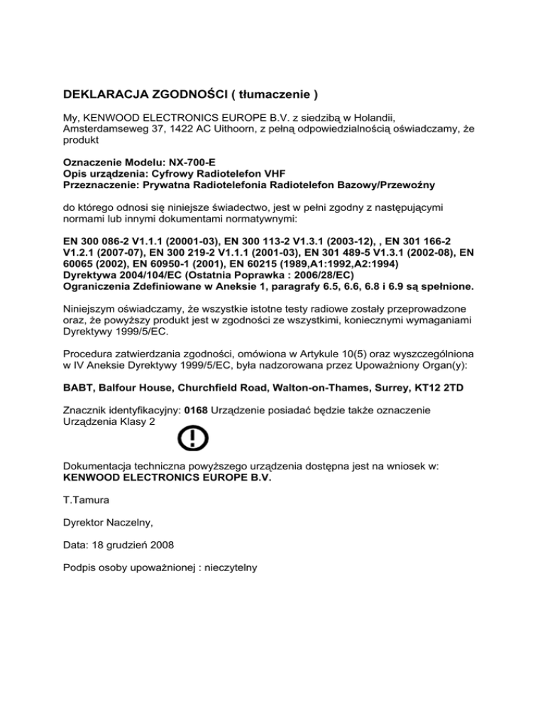 DEKLARACJA ZGODNOŚCI ( tłumaczenie ) My, KENWOOD ELECTRONICS EUROPE B.V. z siedzibą w Holandii, Amsterdamseweg 37, 1422 AC Uithoorn, z pełną odpowiedzialnością oświadczamy, że produkt Oznaczenie Modelu: NX-700-E Opis urządzenia: Cyfrowy Radiotelefon VHF Przeznaczenie: Prywatna Radiotelefonia Radiotelefon Bazowy/Przewoźny do którego odnosi się niniejsze świadectwo, jest w pełni zgodny z następującymi normami lub innymi dokumentami normatywnymi: EN 300 086-2 V1.1.1 (20001-03), EN 300 113-2 V1.3.1 (2003-12), , EN 301 166-2 V1.2.1 (2007-07), EN 300 219-2 V1.1.1 (2001-03), EN 301 489-5 V1.3.1 (2002-08), EN 60065 (2002), EN 60950-1 (2001), EN 60215 (1989,A1:1992,A2:1994) Dyrektywa 2004/104/EC (Ostatnia Poprawka : 2006/28/EC) Ograniczenia Zdefiniowane w Aneksie 1, paragrafy 6.5, 6.6, 6.8 i 6.9 są spełnione. Niniejszym oświadczamy, że wszystkie istotne testy radiowe zostały przeprowadzone oraz, że powyższy produkt jest w zgodności ze wszystkimi, koniecznymi wymaganiami Dyrektywy 1999/5/EC. Procedura zatwierdzania zgodności, omówiona w Artykule 10(5) oraz wyszczególniona w IV Aneksie Dyrektywy 1999/5/EC, była nadzorowana przez Upoważniony Organ(y): BABT, Balfour House, Churchfield Road, Walton-on-Thames, Surrey, KT12 2TD Znacznik identyfikacyjny: 0168 Urządzenie posiadać będzie także oznaczenie Urządzenia Klasy 2 Dokumentacja techniczna powyższego urządzenia dostępna jest na wniosek w: KENWOOD ELECTRONICS EUROPE B.V. T.Tamura Dyrektor Naczelny, Data: 18 grudzień 2008 Podpis osoby upoważnionej : nieczytelny