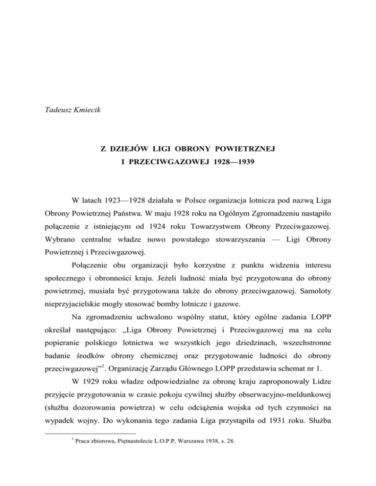 Tadeusz Kmiecik Z DZIEJÓW LIGI OBRONY POWIETRZNEJ I PRZECIWGAZOWEJ 1928—1939 W latach 1923—1928 działała w Polsce organizacja lotnicza pod nazwą Liga Obrony Powietrznej Państwa. W maju 1928 roku na Ogólnym Zgromadzeniu nastąpiło połączenie z istniejącym od 1924 roku Towarzystwem Obrony Przeciwgazowej. Wybrano centralne władze nowo powstałego stowarzyszania — Ligi Obrony Powietrznej i Przeciwgazowej. Połączenie obu organizacji było korzystne z punktu widzenia interesu społecznego i obronności kraju. Jeżeli ludność miała być przygotowana do obrony powietrznej, musiała być przygotowana także do obrony przeciwgazowej. Samoloty nieprzyjacielskie mogły stosować bomby lotnicze i gazowe. Na zgromadzeniu uchwalono wspólny statut, który ogólne zadania LOPP określał następująco: „Liga Obrony Powietrznej i Przeciwgazowej ma na celu popieranie polskiego lotnictwa we wszystkich jego dziedzinach, wszechstronne badanie środków obrony chemicznej oraz przygotowanie ludności do obrony przeciwgazowej”1. Organizację Zarządu Głównego LOPP przedstawia schemat nr 1. W 1929 roku władze odpowiedzialne za obronę kraju zaproponowały Lidze przyjęcie przygotowania w czasie pokoju cywilnej służby obserwacyjno-meldunkowej (służba dozorowania powietrza) w celu odciążenia wojska od tych czynności na wypadek wojny. Do wykonania tego zadania Liga przystąpiła od 1931 roku. Służba 1 Praca zbiorowa, Piętnastolecie L.O.P.P, Warszawa 1938, s. 28. obserwacyjno-meldunkowa umożliwiająca wczesne uprzedzenie o nieprzyjacielskim napadzie lotniczym jednostek wojskowych dysponujących czynnymi środkami obrony przeciwlotniczej, a także ludności miast i osiedli w celu umożliwienia jej biernego zastosowania biernych środków obrony została właściwie do tych zadań przygotowana. W związku z zadaniami LOPP dotyczącymi zagadnień lotniczych i obrony przeciwgazowej w łonie Zarządu Głównego i komitetów wojewódzkich powstały dwa odrębne wydziały: lotniczy i gazowy2. Od 1928 roku rozpoczyna się celowa polityka lotnicza polskich władz państwowych. Zadania Ligi ujęte w rocznych programach dostosowane zostały do aktualnych zagadnień lotniczych. Powstanie Instytutu Aerodynamicznego i Katedry Lotniczej na Politechnice Warszawskiej umożliwiło młodym inżynierom podjęcie prac w dziedzinie konstrukcji lotniczych. Z inicjatywy ligi podjęto na Okęciu budowę Doświadczalnych Warsztatów Lotniczych dla potrzeb Sekcji Lotniczej studentów Politechniki Warszawskiej. Po wybudowaniu Instytutu Aerodynamicznego w Warszawie Liga subwencjonowała budowę Instytutu Aerodynamicznego we Lwowie, który został ukończony w 1930 roku. Powstało tam też Studium Lotnicze. Z inicjatywy i przy pomocy Ligi zbudowano także tunel aerodynamiczny przy Podlaskiej Wytwórni Samolotów. Liga subwencjonowała również działalność aeroklubów akademickich, przekształconych później na terytorialne. Spowodowała także wspólnie z Departamentem Aeronautyki Ministerstwa Spraw Wojskowych powołanie do życia Aeroklubu Rzeczypospolitej Polskiej. Przejął on od Ligi ogólną koordynację prac aeroklubów i reprezentowanie polskiego lotnictwa na zewnątrz. W 1928 roku Liga rozpoczęła budowę cywilnej szkoły pilotów w Radomiu, mającą stanowić pomnik dla uczczenia dziesięciolecia niepodległości Polski. Budowę szkoły kosztem około 700.000 zł ukończono w 1932 roku i na życzenie władz 2 LOPP w terenie obejmowała okręgi wojewódzkie (które nie w pełni pokrywały się z ich granicami administracyjnymi); białostocki, kielecki, krakowski, lubelski, lwowski, łódzki, nowogródzki, poleski, pomorski, poznański, stanisławowski, śląski, tarnopolski, miasta stołecznego Warszawy, warszawski, wileński, wołyński oraz okręgi kolejowe: krakowski, poznański, radomski, warszawski i wileński. lotniczych przekazano ją do użytkowania Departamentowi Lotnictwa Ministerstwa Spraw Wojskowych. Rozwiązana została szkoła pilotów przy fabryce „Samolot” w Poznaniu, w której szkolenie odbywało się na koszt LOPP. Powstały ośrodki Przysposobienia Wojskowo-Lotniczego ufundowane przez LOPP w Łodzi i Łucku, gdzie szkolono pilotów. Prowadzone one były przez władze wojskowe. Rezygnacja LOPP ze szkolenia pilotów we własnym zakresie uzasadniona była powstaniem aeroklubów, które przejęły te zadania. Rezultatem zainteresowania się tą dziedziną sportu lotniczego było powołanie kół Szybowcowych LOPP i szkoły szybowcowej w Polichnie. Z inicjatywy Ligi budowane były szkoły mechaników lotniczych. W 1928 roku zakończona została budowa szkoły w Bydgoszczy, a w następnym roku we Lwowie3. Niezależnie od tych szkół z subwencji Ligi zorganizowano w Warszawie, Wilnie i Lidzie skrócone kursy dla mechaników lotniczych4. W obronie przeciwgazowej na przełomie lat dwudziestych i trzydziestych rozpoczęto prace organizacyjne i szkoleniowe. Jednocześnie przystąpiono do zaopatrywania ludności w sprzęt przeciwgazowy. Na ogólnym Zgromadzeniu w 1928 roku uchwalono utworzenie Inspektoratu Obrony Przeciwgazowej, jako organu fachowego kierującego pracami związanymi z obroną przeciwgazową. Przy komitetach wojewódzkich LOPP ustanowiono inspektoraty obrony przeciwgazowej a w komitetach powiatowych i miejskich przewidziano stanowiska inspektorów. Nadzorowali oni prace w zakresie obrony przeciwgazowej kół miejscowych Ligi. W latach 1929—1932 LOPP prowadziła szkolenie z obrony przeciwgazowej w policji, straży pożarnej, wśród pracowników instytucji państwowych, zakładach przemysłowych i szkołach. Udział Ligi w ćwiczeniach obrony przeciwgazowej, organizowanie marszów w maskach, pokazy gaszenia pożaru i ratownictwa sanitarnego uświadamiały społeczeństwu problem zagrożenia gazowego, rozwijały 3 Cywilna szkoła mechaników w Bydgoszczy obliczona była na 100 uczniów a we Lwowie na 60 uczniów. Kurs nauki w tych szkołach trwał 18 miesięcy. Pro