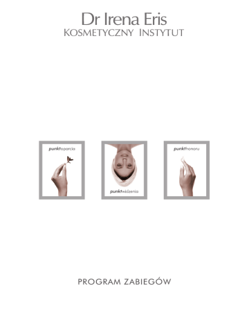 PROGRAM ZABIEGÓW Bogata oferta zabiegowa Kosmetycznych Instytutów Dr Irena Eris obejmuje kompleksową diagnozę skóry i dobór ekskluzywnych kosmetyków Dr Irena Eris Prosystem Home Care. Każdy zabieg twarzy dodatkowo zawiera bezpłatną regulację brwi i podstawowy makijaż. I. ZABIEGI PIELĘGNACYJNE TWARZY, SZYI, DEKOLTU I OKOLIC OCZU 1. RETINOL&GLICOL 40% - stymulacja i odmładzanie zabieg na twarz, szyję i okolice oczu .................................................. 420 2. VITAMIN C 30% - bio-odnawianie i rewitalizacja skóry twarzy, szyi i okolic oczu .................................................................... 420 3. COLLAGÈNE meso-TECHNOLOGIE - intensywny zabieg stymulująco-naprawczy ............................. 275 4. HIALURONIC - volumeryczny zabieg przeciwzmarszczkowy ...... 275 5. SENSITIVE&DRY Intensive Program – mezozabieg nawilżająco -kojący .................................................................................. 270 6. Redness Nano Relief – innowacyjny program z NANOTECHNOLOGIĄ wzmacniająco - kojący cerę naczynkową ................................ 270 7. Face Intensive Detox – bio-detoksykujący zabieg oczyszczania skóry twarzy ........................................................................... 250 8. Orchidee Essence – wielopoziomowa stymulacja przeciwzmarszczkowo-wygładzająca ....................................... 250 9. Express Lifting – 3-stopniowy program modelujący owal twarzy o przedłużonym działaniu regenerującym ............................... 250 10. SkinMat Control – program normalizujący dla cery tłustej i mieszanej ...................................................... 245 11. Żurawinowa harmonia – zabieg przeciwzmarszczkowowygładzający ......................................................................... 230 12. Zabieg dotleniająco-witalizujący ............................................ 230 13. opti meso-COLLAGÈNE - technologia naprawczo-stymulująca zabieg na okolice oczu (Skin Master) ....................................... 180 14. opti meso-COLLAGÈNE - technologia naprawczo-stymulująca zabieg na okolice oczu (Ionto Ice&Heat) .................................. 150 15. optiVOLUMERIC - hialuronowy zabieg przeciwzmarszczkoworewitalizujący na okolice oczu (Skin Master) ............................. 180 16. optiVOLUMERIC - hialuronowy zabieg przeciwzmarszczkoworewitalizujący na okolice oczu (Ionto Ice&Heat) ........................ 150 17. Masaż Firmowy Dr Irena Eris z pielęgnacją skóry ..................... 130 18. Magia spojrzenia - kriozabieg z drenażem limfatycznym na okolice oczu / w zabiegu ........................................... 130/120 19. M-Sesja ultraoczyszczająca ................................................... 210 Zabiegi pielęgnacyjne dla mężczyzn 20. M-Sesja odmładzająca ......................................................... 210 21. M-Sesja antystresowa ........................................................... 210 22. Zabieg oczyszczający podstawowy .......................................... 140 23. Złuszczanie Azelac, Lactipeel - skóra twarzy, szyi i dekoltu ........ 200 24. Złuszczanie Azelac, Lactipeel - skóra twarzy lub dekoltu ............ 170 25. Mezoterapia bezigłowa – terapia odmłodzenia i głębokiej regeneracji skóry ................................................................... 280 26. Mezoterapia bezigłowa – hialuronowa regeneracja i nawilżanie skóry ................................................................... 255 27. Mikrodermabrazja twarzy, szyi i dekoltu / w zabiegu ......... 370/320 28. Mikrodermabrazja twarzy lub szyi lub dekoltu / w zabiegu ... 220/180 29. Peeling kawitacyjny z nawilżaniem / w zabiegu ................ 240/140 Zabiegi oczyszczające i złuszczające Zabiegi High-Tech na twarz II. ZABIEGI PIELĘGNACYJNE CIAŁA 1. Mineral Detox Skin – oczyszczająco detoksykujący program odnowy skóry na twarz i ciało ................................................. 430 2. Mineral Detox Skin – oczyszczająco detoksykujący program odnowy skóry na ciało/ w kapsule .................................. 290/330 3. Algae Total Effect – totalna regeneracja algowa /w kapsule .................................................................... 290/330 4. Body à la carte – intensywne ujędrnianie z nutą zapachów egzotycznych /w kapsule ...................... 285/325 5. Cellu Body Slim – algowa terapia ujędrniająco-wygładzająca do skóry z cellulitem .............................................................. 230 6. Zabieg-masaż Suita Marzeń – intensywna regeneracja ciała ... 215 7. Mud Body Care – zabieg energizujący z zieloną glinką /w kapsule .................................................................... 210/250 8. Ocean Breath – zabieg wygładzająco-nawilżający /w kapsule .................................................................... 185/225 9. Zabieg oczyszczający podstawowy pleców .............................. 210 10. Złuszczanie Azelac, Lactipeel – plecy ...................................... 200 11. Mikrodermabrazja pleców ...................................................... 330 12. Endermologia ........................................................................ 160 13. Vitamin C Forte - zabieg rozjaśniająco-wygładzający na dłonie .... 130 14. So Smooth - intensywny zabieg regenerujący skórę dłoni ......... 115 15. Hydro&Lipid - bio-zabieg regenerująco-wzmacniający na dłonie ... 55 16. So Smooth - intensywny zabieg regenerujący skórę stóp .......... 130 17. Cynamonowe stopy - zabieg SPA z elementami refleksoterapii ... 120 Zabiegi oczyszczające i złuszczające Zabiegi High-Tech na ciało Zabiegi pielęgnacyjne dłoni Zabiegi pielęgnacyjne stóp III. MASAŻE 1. Herbal Body Touch - masaż gorącymi stemplami ziołowymi .... 265 2. Masaż SPA gorącymi kamieniami ........................................... 190 3. COCO BOWL