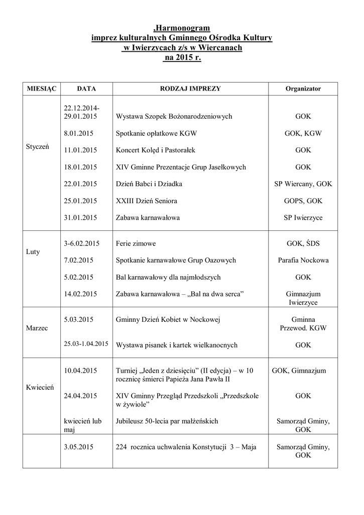 ,Harmonogram imprez kulturalnych Gminnego Ośrodka Kultury w Iwierzycach z/s w Wiercanach na 2015 r. MIESIĄC Styczeń DATA RODZAJ IMPREZY Organizator 22.12.201429.01.2015 Wystawa Szopek Bożonarodzeniowych 8.01.2015 Spotkanie opłatkowe KGW GOK, KGW 11.01.2015 Koncert Kolęd i Pastorałek GOK 18.01.2015 XIV Gminne Prezentacje Grup Jasełkowych GOK 22.01.2015 Dzień Babci i Dziadka 25.01.2015 XXIII Dzień Seniora GOPS, GOK 31.01.2015 Zabawa karnawałowa SP Iwierzyce 3-6.02.2015 Ferie zimowe 7.02.2015 Spotkanie karnawałowe Grup Oazowych 5.02.2015 Bal karnawałowy dla najmłodszych 14.02.2015 Zabawa karnawałowa – „Bal na dwa serca” 5.03.2015 Gminny Dzień Kobiet w Nockowej 25.03-1.04.2015 Wystawa pisanek i kartek wielkanocnych 10.04.2015 Turniej „Jeden z dziesięciu” (II edycja) – w 10 rocznicę śmierci Papieża Jana Pawła II 24.04.2015 XIV Gminny Przegląd Przedszkoli „Przedszkole w żywiole” kwiecień lub maj Jubileusz 50-lecia par małżeńskich Samorząd Gminy, GOK 3.05.2015 224 rocznica uchwalenia Konstytucji 3 – Maja Samorząd Gminy, GOK GOK SP Wiercany, GOK GOK, ŚDS Luty Marzec Parafia Nockowa GOK Gimnazjum Iwierzyce Gminna Przewod. KGW GOK GOK, Gimnazjum Kwiecień GOK 12.05.2015 XV Powiatowy Przegląd Pieśni i Piosenki Religijnej „Chcę Panu Śpiewać” /etap gminny/ 19.05.2015 XV Powiatowy Przegląd Pieśni i Piosenki Religijnej /etap powiatowy/ 24.05.2015 Koncert Laureatów Pieśni i Piosenki Religijnej – Piknik rozpoczęty Nabożeństwem Majowym na estradzie w Wiercanach 26.05.2015 Koncert zespołów działających w GOK dla rodziców z okazji Dnia Matki i Ojca GOK 31.05.2015 Impreza promocyjna pn. „Majówka rodzinna – wiosenny bzik” - Będzienica GOK 28.06.2015 Gminne Zawody sportowo-pożarnicze Olchowa Piknik na „Powitanie Lata” 4-5.07.2015 Rezerwacja sali - 11-12. 07.2015 Rezerwacja Sali - Parafia Bystrzyca, GOK, Klasztor, Starostwo Powiatowe j.w. Maj Czerwiec j.w. Samorząd Gminy, OSP, GOK Lipiec 20-24. 07.2015 Ferie letnie GOK Wiercany 1-2.08.2015 Rezerwacja sali 16.08.2015 ? Gminne Święto Plonów Iwierzyce 22.08.2015 Rezerwacja sali (jeden dzień) 29-30.08.2015 Rezerwacja sali 6.09.2015 Piknik - Konkurs „Smak Tradycji - Kulinarne Dziedzictwo Gminy Iwierzyce” - 7 edycja – Wiercany 28.09.- 28.10. Wystawa twórczości p. Rauch z Iwierzyc GOK 11 lub 25 Koncert Jubileuszowy z okazji 40-lecia GOK oraz 15-lecia Zespołu Pieśni i Tańca „Wiercany” GOK 17-18.10.2015 Rezerwacja sali 6.11.2015 Literatura i dzieci – wojewódzki konkurs recytatorski /etap gminny/ WDK, GOK 11.11.2015 97 rocznica Odzyskania Niepodległości Samorząd Gminy, GOK Sierpień Wrzesień Październik Samorząd Gminy, GOK GOK - Listopad 21.11.2015 Rezerwacja sali – Bal andrzejkowy 14 lub 28 Bal Sportowca na zakończenie sezonu sportowego 26.11.2015 Zabawa andrzejkowa dla dzieci GOK 6.12.2015 Mikołajki dla dzieci GOK 31.12.2015 Rezerwacja sali – Bal sylwestrowy SP Wiercany Samorząd Gminy, GOK Grudzień Gimnazjum Iwierzyce Z uwagi na różne nieprzewidziane okoliczności, terminy poszczególnych imprez mogą ulec zmianom.