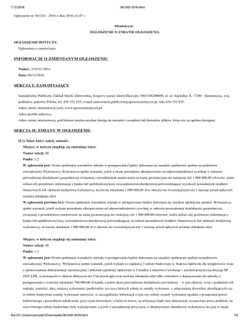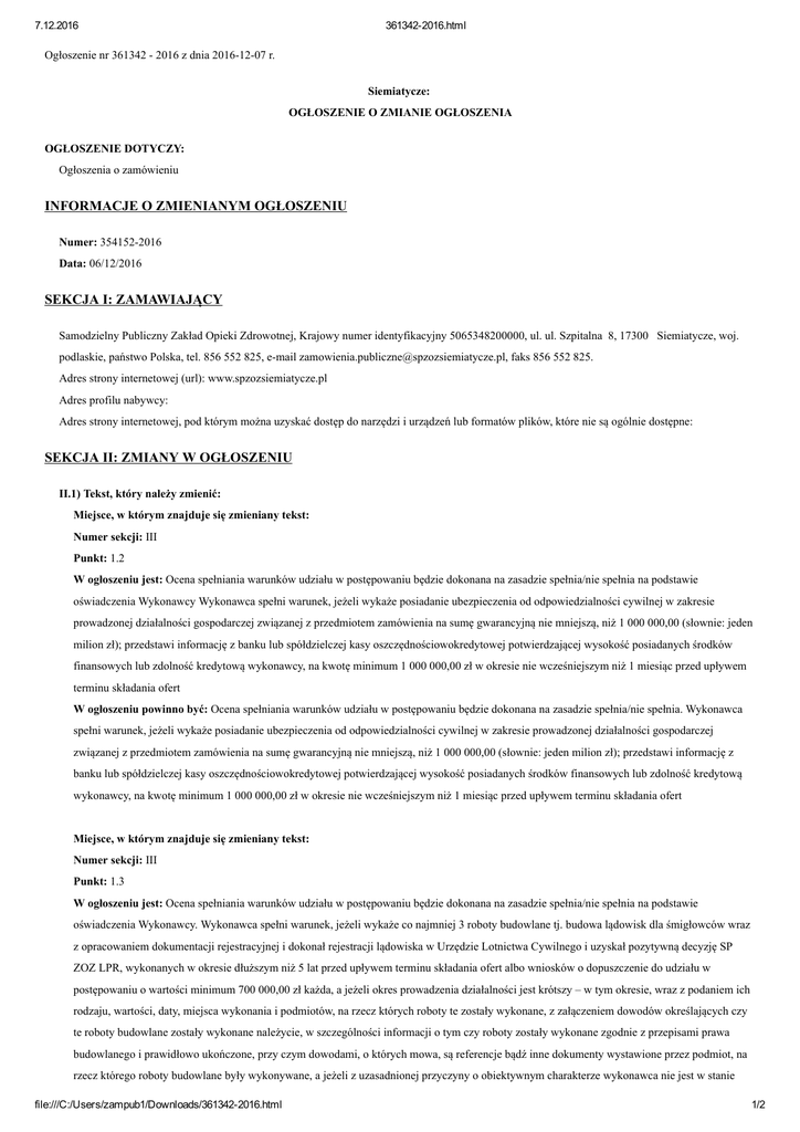 7.12.2016 3613422016.html Ogłoszenie nr 361342 2016 z dnia 20161207 r. Siemiatycze: OGŁOSZENIE O ZMIANIE OGŁOSZENIA OGŁOSZENIE DOTYCZY: Ogłoszenia o zamówieniu INFORMACJE O ZMIENIANYM OGŁOSZENIU Numer: 3541522016 Data: 06/12/2016 SEKCJA I: ZAMAWIAJĄCY Samodzielny Publiczny Zakład Opieki Zdrowotnej, Krajowy numer identyfikacyjny 5065348200000, ul. ul. Szpitalna 8, 17300 Siemiatycze, woj. podlaskie, państwo Polska, tel. 856 552 825, email [email protected], faks 856 552 825. Adres strony internetowej (url): www.spzozsiemiatycze.pl Adres profilu nabywcy: Adres strony internetowej, pod którym można uzyskać dostęp do narzędzi i urządzeń lub formatów plików, które nie są ogólnie dostępne: SEKCJA II: ZMIANY W OGŁOSZENIU II.1) Tekst, który należy zmienić: Miejsce, w którym znajduje się zmieniany tekst: Numer sekcji: III Punkt: 1.2 W ogłoszeniu jest: Ocena spełniania warunków udziału w postępowaniu będzie dokonana na zasadzie spełnia/nie spełnia na podstawie oświadczenia Wykonawcy Wykonawca spełni warunek, jeżeli wykaże posiadanie ubezpieczenia od odpowiedzialności cywilnej w zakresie prowadzonej działalności gospodarczej związanej z przedmiotem zamówienia na sumę gwarancyjną nie mniejszą, niż 1 000 000,00 (słownie: jeden milion zł); przedstawi informację z banku lub spółdzielczej kasy oszczędnościowokredytowej potwierdzającej wysokość posiadanych środków finansowych lub zdolność kredytową wykonawcy, na kwotę minimum 1 000 000,00 zł w okresie nie wcześniejszym niż 1 miesiąc przed upływem terminu składania ofert W ogłoszeniu powinno być: Ocena spełniania warunków udziału w postępowaniu będzie dokonana na zasadzie spełnia/nie spełnia. Wykonawca spełni warunek, jeżeli wykaże posiadanie ubezpieczenia od odpowiedzialności cywilnej w zakresie prowadzonej działalności gospodarczej związanej z przedmiotem zamówienia na sumę gwarancyjną nie mniejszą, niż 1 000 000,00 (słownie: jeden milion zł); przedstawi informację z banku lub spółdzielczej kasy oszczędnościowokredytowej potwierdzającej wysokość posiadanych środków finansowych lub zdolność kredytową wykonawcy, na kwotę minimum 1 000 000,00 zł w okresie nie wcześniejszym niż 1 miesiąc przed upływem terminu składania ofert Miejsce, w którym znajduje się zmieniany tekst: Numer sekcji: III Punkt: 1.3 W ogłoszeniu jest: Ocena spełniania warunków udziału w postępowaniu będzie dokonana na zasadzie spełnia/nie spełnia na podstawie oświadczenia Wykonawcy. Wykonawca spełni warunek, jeżeli wykaże co najmniej 3 roboty budowlane tj. budowa lądowisk dla śmigłowców wraz z opracowaniem dokumentacji rejestracyjnej i dokonał rejestracji lądowiska w Urzędzie Lotnictwa Cywilnego i uzyskał pozytywną decyzję SP ZOZ LPR, wykonanych w okresie dłuższym niż 5 lat przed upływem terminu składania ofert albo wniosków o dopuszczenie do udziału w postępowaniu o wartości minimum 700 000,00 zł każda, a jeżeli okres prowadzenia działalności jest krótszy – w tym okresie, wraz z podaniem ich rodzaju, wartości, daty, miejsca wykonania i podmiotów, na rzecz których roboty te zostały wykonane, z załączeniem dowodów określających czy te roboty budowlane zostały wykonane należycie, w szczególności informacji o tym czy roboty zostały wykonane zgodnie z przepisami prawa budowlanego i prawidłowo ukończone, przy czym dowodami, o których mowa, są referencje bądź inne dokumenty wystawione przez podmiot, na rzecz którego roboty budowlane były wykonywane, a jeżeli z uzasadnionej przyczyny o obiektywnym charakterze wykonawca nie jest w stanie file:///C:/Users/zampub1/Downloads/3613422016.html 1/2 7.12.2016 3613422016.html uzyskać tych dokumentów – inne dokumentywzór wykazu robót stanowi załącznik nr 7 do SIWZ. Wykonawca spełni warunek, jeżeli wykaże iż dysponuje co najmniej osobami, które posiadają następujące uprawnienia: a) uprawnienia budowlane w specjalności konstrukcyjnobudowlanej do kierowania robotami budowlanymi, b) uprawnienia budowlane w specjalności sieci, instalacji i urządzeń elektrycznych i elektroinstalacyjnych do kierowania robotami budowlanymi, c) uprawnienia budowlane w specjalności sieci, instalacji i urządzeń cieplnych, wentylacyjnych, gazowych, wodociągowych i kanalizacyjnych do kierowania robotami budowlanymi, d) osoba/osoby posiadające doświadczenie w zakresie sporządzania dokumentacji ewidencyjnej minimum trzech lądowisk zakończonych wpisaniem lądowiska do ewidencji w Urzędzie Lotnictwa Cywilnego oraz uzyskania pozytywnej decyzji LPR w Warszawie (doświadczenie potwierdzone przynajmniej trzema listami referencyjnymi zrealizowanych zadań) Wymagane będzie potwierdzenie przez te osoby posiadanych kwalifikacji właściwymi zaświadczeniami o posiadaniu uprawnień oraz wpisie do właściwej izby samorządu zawodowego jeżeli ustawy nakładają obowiązek posiadania takich uprawnień zgodnie z ustawą Prawo budowlane oraz wypełnienie Załącznika nr 9 do SIWZ. W ogłoszeniu powinno być: Ocena spełniania warunków udziału w postępowaniu będzie dokonana na zasadzie spełnia/nie spełnia. Wykonawca spełni warunek, jeżeli wykaże co najmniej 3 roboty budowlane tj. budowa lądowisk dla śmigłowców wraz z opracowaniem dokumentacji rejestracyjnej i dokonał rejestracji lądowiska w Urzędzie Lotnictwa Cywilnego i uzyskał pozytywną decyzję SP ZOZ LPR oraz bez konieczności wykonania dokumentacji i rejestracji, wykonanych w okresie dłuższym niż 5 lat przed upływem terminu składania ofert albo wniosków o dopuszczenie do udziału w postępowaniu o wartości minimum 600 000,00 zł brutto, a jeżeli okres prowadzenia działalności jest krótszy – w tym okresie, wraz z podaniem ich rodzaju, wartości, daty, miejsca wykonania i podmiotów, na rzecz których roboty te zostały wykonane, z załączeniem dowodów określających czy te roboty budowlane zostały wykonane nal