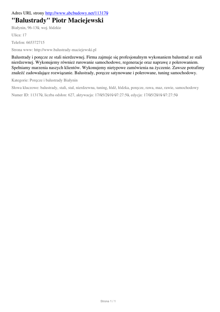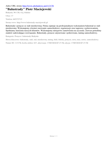 Adres URL strony http://www.abcbudowy.net/113170 "Balustrady" Piotr Maciejewski Białynin, 96-130, woj. łódzkie Ulica: 17 Telefon: 665372715 Strona www: http://www.balustrady-maciejewski.pl Balustrady i poręcze ze stali nierdzewnej. Firma zajmuje się profesjonalnym wykonaniem balustrad ze stali nierdzewnej. Wykonujemy również rurowanie samochodowe, regeneracje oraz naprawę z polerowaniem. Spełniamy marzenia naszych klientów. Wykonujemy nietypowe zamówienia na życzenie. Zawsze potrafimy znaleźć zadowalające rozwiązanie. Balustrady, poręcze satynowane i polerowane, tuning samochodowy. Kategorie: Poręcze i balustrady Białynin Słowa kluczowe: balustrady, stali, stal, nierdzewna, tuning, łódź, łódzka, poręcze, rawa, maz, rawie, samochodowy Numer ID: 113170, liczba odsłon: 627, aktywacja: 17/05/2010 07:27:50, edycja: 17/05/2010 07:27:50 Strona 1 / 1