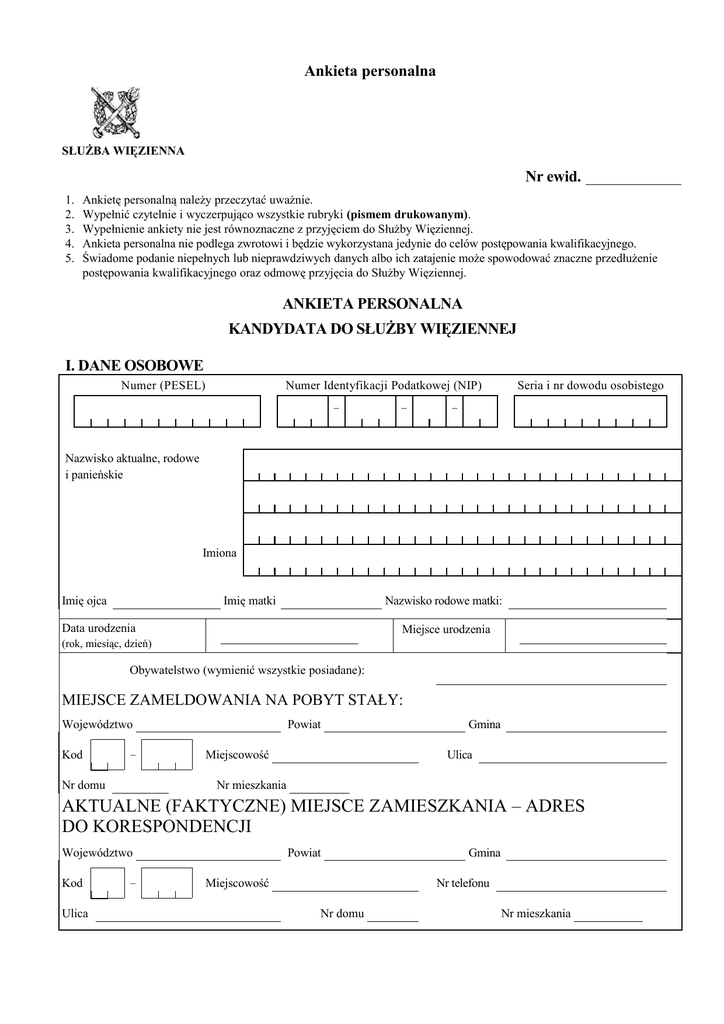 Ankieta personalna SŁUŻBA WIĘZIENNA Nr ewid. 1. 2. 3. 4. 5. Ankietę personalną należy przeczytać uważnie. Wypełnić czytelnie i wyczerpująco wszystkie rubryki (pismem drukowanym). Wypełnienie ankiety nie jest równoznaczne z przyjęciem do Służby Więziennej. Ankieta personalna nie podlega zwrotowi i będzie wykorzystana jedynie do celów postępowania kwalifikacyjnego. Świadome podanie niepełnych lub nieprawdziwych danych albo ich zatajenie może spowodować znaczne przedłużenie postępowania kwalifikacyjnego oraz odmowę przyjęcia do Służby Więziennej. ANKIETA PERSONALNA KANDYDATA DO SŁUŻBY WIĘZIENNEJ I. DANE OSOBOWE Numer (PESEL) Numer Identyfikacji Podatkowej (NIP) – – Seria i nr dowodu osobistego – Nazwisko aktualne, rodowe i panieńskie Imiona Imię ojca Imię matki Nazwisko rodowe matki: Data urodzenia Miejsce urodzenia (rok, miesiąc, dzień) Obywatelstwo (wymienić wszystkie posiadane): MIEJSCE ZAMELDOWANIA NA POBYT STAŁY: Województwo Kod – Nr domu Powiat Miejscowość Gmina Ulica Nr mieszkania AKTUALNE (FAKTYCZNE) MIEJSCE ZAMIESZKANIA – ADRES DO KORESPONDENCJI Województwo Kod Ulica – Powiat Miejscowość Gmina Nr telefonu Nr domu Nr mieszkania II. WYKSZTAŁCENIE. Proszę wpisać wszystkie ukończone szkoły ponadpodstawowe oraz tryb ich ukończenia (stacjonarne, dzienne bezpłatne, dzienne płatne, zaoczne, wieczorowe itp.). Nazwa i adres szkoły (uczelni) Kierunek/ specjalność Uzyskany tytuł zawodowy lub naukowy Data rozpoczęcia i ukończenia nauki WYKSZTAŁCENIE UZUPEŁNIAJĄCE. Proszę wpisać ukończone kursy i inne szkolenia specjalistyczne oraz posiadane dodatkowe uprawnienia i kwalifikacje (np. studia podyplomowe, aplikacja, uprawnienia: budowlane, biegłego, księgowego, przygotowanie pedagogiczne, prawo jazdy z podaniem kategorii, kurs pilotów wycieczek itp.). Proszę wpisać rodzaj uprawnienia oraz rok jego uzyskania. Nazwa (temat) kursu/szkolenia lub rodzaj posiadanego uprawnienia Nazwa i adres placówki organizującej szkolenie lub wydającej uprawnienie Czas trwania (od - do) lub liczba godzin Rok ukończenia szkolenia lub uzyskania uprawnienia ZNAJOMOŚĆ JĘZYKÓW OBCYCH (w skali: podstawowa, dobra, bardzo dobra, biegła). Nazwa języka obcego Znajomość w mowie Znajomość w piśmie Czy Pan(i) obecnie uczy się lub studiuje? Jeżeli tak, proszę podać: szkołę (uczelnię), kierunek, tryb i stan zaawansowania nauki (kiedy rozpoczęta, przewidywany termin zakończenia) oraz jak często odbywają się zajęcia: III. PRZEBIEG PRACY ZAWODOWEJ. Proszę podać dokładne daty (dzień, miesiąc, rok). Żaden okres pracy (także za granicą) nie może zostać pominięty (należy wymienić chronologicznie wszystkie okresy zatrudnienia, tzw. składkowe, oraz okresy pozostawania bez pracy, w tym z uprawnieniem do zasiłku dla bezrobotnych, jak również bez uprawnień do jego pobierania). Do ankiety proszę załączyć wszystkie świadectwa pracy/służby, decyzje o przyznaniu zasiłku. Nazwa i adres pracodawcy Okres pracy od Nazwa stanowiska pracy do Oświadczam, że pozostaję / nie pozostaję w rejestrze bezrobotnych lub jestem obecnie zatrudniony(a) na podstawie umowy o pracę TAK /NIE (właściwe otoczyć kółkiem). Czy pełnił(a) Pan(i) służbę lub ubiegał(a) się o przyjęcie do służby lub pracy w jednostce organizacyjnej Służby Więziennej lub innej służby mundurowej? Jeśli tak, proszę podać gdzie i kiedy? Czy kiedykolwiek został(a) Pan(i) zwolniony(a) bez wypowiedzenia z własnej winy, dyscyplinarnie lub porzucił(a) pracę/służbę? Proszę podać powody: Czy należy Pan(i) do organizacji politycznych lub jest Pan(i) członkiem organizacji lub stowarzyszeń międzynarodowych? Jeśli tak, proszę podać jakich (podać nazwę organizacji i jej cele, datę wstąpienia, pełnioną funkcję)? IV. STOSUNEK DO POWSZECHNEGO OBOWIĄZKU OBRONY RZECZYPOSPOLITEJ POLSKIEJ – proszę otoczyć kółkiem właściwą odpowiedź: nie podlega, przeniesiony do rezerwy po odbyciu zasadniczej służby wojskowej, przeniesiony do rezerwy bez odbycia zasadniczej służby wojskowej, przeniesiony do rezerwy po odbyciu i zdaniu egzaminu z przysposobienia obronnego studentów, przeniesiony do rezerwy po odbyciu przeszkolenia wojskowego studentów. Aktualna przynależność ewidencyjna do WKU Seria i nr książeczki wojskowej – – – – – – – – – – okres odbywania zasadniczej służby wojskowej: (dzień, miesiąc, rok) od okres odbywania nadterminowej zasadniczej służby wojskowej: od okres odbywania przeszkolenia wojskowego: od do okres odbywania przysposobienia obronnego studentów: od do okres odbywania ćwiczeń wojskowych: od do okres odbywania okresowej służby wojskowej: od do okres pełnienia służby wojskowej w razie ogłoszenia mobilizacji i w czasie wojny: od do okres odbywania służby zastępczej: od do okres odbywania służby w obronie cywilnej: od do okres odbywania zawodowej służby wojskowej: od do do do s i gn f or m Służbę wojskową odbyłem(am) – proszę podkreślić właściwą odpowiedź: MON, MSWiA/NJW, Policja, Straż Graniczna, Biuro Ochrony Rządu, inne Nr specjalności wojskowej Kategoria zdrowia Nr rozkazu o nadaniu stopnia Posiadany przydział mobilizacyjny do Data wydania książeczki Stopień wojskowy Data nadania V. DANE O WSPÓŁMAŁŻONKU (wypełnić drukowanymi literami) Nazwisko PESEL Nazwisko panieńskie Imiona Data i miejsce urodzenia Imiona rodziców Miejsce pracy i stanowisko Obecne miejsce zamieszkania Osoba, którą należy zawiadomić w razie wypadku (imię, nazwisko, adres, telefon) VI. CZŁONKOWIE RODZINY Wyszczególnić kolejno dzieci: Stopień Nazwisko i imię. Imiona rodziców pokrewień- oraz nazwisko panieńskie matki (u kobiet także nazwisko rodowe) stwa Data i miejsce urodzenia Adres zamieszkania PESEL Podanie danych w pkt VI jest niezbędne do wypełnienia zgłoszenia do ubezpieczenia zdrowotnego oraz przy określaniu uprawnień i świadczeń wynikają