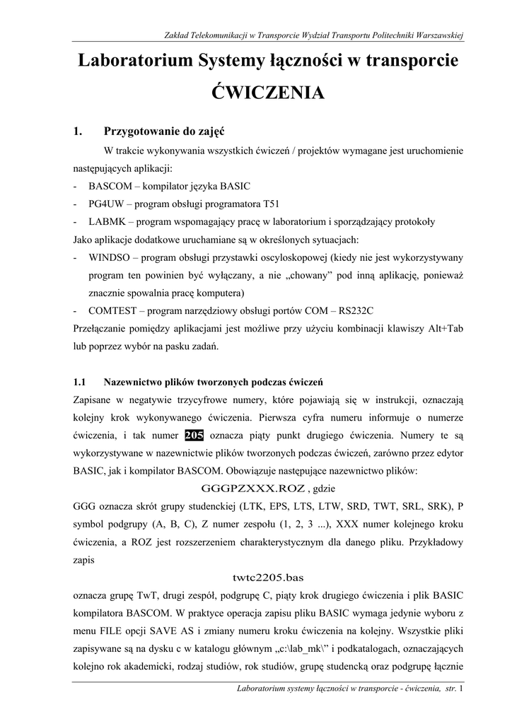 Zakład Telekomunikacji w Transporcie Wydział Transportu Politechniki Warszawskiej Laboratorium Systemy łączności w transporcie ĆWICZENIA 1. Przygotowanie do zajęć W trakcie wykonywania wszystkich ćwiczeń / projektów wymagane jest uruchomienie następujących aplikacji: - BASCOM – kompilator języka BASIC - PG4UW – program obsługi programatora T51 - LABMK – program wspomagający pracę w laboratorium i sporządzający protokoły Jako aplikacje dodatkowe uruchamiane są w określonych sytuacjach: - WINDSO – program obsługi przystawki oscyloskopowej (kiedy nie jest wykorzystywany program ten powinien być wyłączany, a nie „chowany” pod inną aplikację, ponieważ znacznie spowalnia pracę komputera) - COMTEST – program narzędziowy obsługi portów COM – RS232C Przełączanie pomiędzy aplikacjami jest możliwe przy użyciu kombinacji klawiszy Alt+Tab lub poprzez wybór na pasku zadań. 1.1 Nazewnictwo plików tworzonych podczas ćwiczeń Zapisane w negatywie trzycyfrowe numery, które pojawiają się w instrukcji, oznaczają kolejny krok wykonywanego ćwiczenia. Pierwsza cyfra numeru informuje o numerze ćwiczenia, i tak numer 205 oznacza piąty punkt drugiego ćwiczenia. Numery te są wykorzystywane w nazewnictwie plików tworzonych podczas ćwiczeń, zarówno przez edytor BASIC, jak i kompilator BASCOM. Obowiązuje następujące nazewnictwo plików: GGGPZXXX.ROZ , gdzie GGG oznacza skrót grupy studenckiej (LTK, EPS, LTS, LTW, SRD, TWT, SRL, SRK), P symbol podgrupy (A, B, C), Z numer zespołu (1, 2, 3 ...), XXX numer kolejnego kroku ćwiczenia, a ROZ jest rozszerzeniem charakterystycznym dla danego pliku. Przykładowy zapis twtc2205.bas oznacza grupę TwT, drugi zespół, podgrupę C, piąty krok drugiego ćwiczenia i plik BASIC kompilatora BASCOM. W praktyce operacja zapisu pliku BASIC wymaga jedynie wyboru z menu FILE opcji SAVE AS i zmiany numeru kroku ćwiczenia na kolejny. Wszystkie pliki zapisywane są na dysku c w katalogu głównym „c:\lab_mk\” i podkatalogach, oznaczających kolejno rok akademicki, rodzaj studiów, rok studiów, grupę studencką oraz podgrupę łącznie Laboratorium systemy łączności w transporcie - ćwiczenia, str. 1 Zakład Telekomunikacji w Transporcie Wydział Transportu Politechniki Warszawskiej z dwucyfrowym numerem zespołu. Przykładowy katalog dla ww. grupy TwT, to: „c:\lab_mk\20012002\DZIENNE\3\TWT\C02\”. Tak rygorystyczne podejście do nazewnictwa plików podyktowane jest koniecznością zarządzania plikami w ich olbrzymiej ilości, przekraczającej pod koniec każdego semestru liczbę tysiąca. 1.2 Konfiguracja kompilatora i programu obsługi programatora W praktyce zarządzanie plikami nie jest jednak uciążliwe, wymaga bowiem jedynie ustawienia w opcjach kompilatora BASCOM ścieżki dostępu. W tym celu należy wybrać z menu OPTIONS polecenie ENVIRONMENT i odszukać na trzeciej zakładce pole FILE LOCATION. Klikając dwukrotnie na tym polu uzyskujemy dostęp do typowego okna dialogowego Windows i wskazujemy ścieżkę przypisana do danego zespołu. Wybór zatwierdzamy naciśnięciem (kliknięciem) klawisza OK. W programie obsługi programatora T51 nie jest wymagane nawet konfigurowanie ścieżki dostępu - wystarczy pierwsze otwarcie lub pierwszy zapis pliku i już każde następne odwołanie będzie dotyczyło tego katalogu. Laboratorium systemy łączności w transporcie - ćwiczenia, str. 2 Zakład Telekomunikacji w Transporcie Wydział Transportu Politechniki Warszawskiej 1.3 Kompilator BASCOM Po uruchomieniu programu w oknie edytora pojawia się domyślnie ostatnio przetwarzany plik BASIC. Zwykle należy go zamknąć korzystając z polecenia CLOSE w menu głównym FILE. Po tym należy otworzyć plik przeznaczony aktualnie do edycji (polecenie OPEN w menu głównym FILE) lub utworzyć nowy plik, korzystając z polecenia NEW w menu głównym FILE – skrót Ctrl+N). Zapisanie pliku pod nową nazwą jest możliwe po wybraniu polecenia SAVE AS... w menu głównym FILE, a pod starą nazwą poleceniem SAVE w tym samym menu głównym FILE – skrót Ctrl+S. Białe pole poniżej menu i paska ikon jest polem edytora programu, które służy po prostu do pisania programu, w typowy dla każdego edytora Windows sposób. Słowa kluczowe języka BASIC pisane są w kolorze niebieskim, nazwy zmiennych i stałych w kolorze czarnym, nazwy portów i rejestrów w kolorze brązowym oraz komentarze w kolorze zielonym. Po napisaniu programu należy poddać go kompilacji, czyli przetworzeniu do postaci w której może zostać wpisany do mikrokontrolera. Jest to plik w postaci szesnastkowej, który tworzy się automatycznie w katalogu pliku BASIC i ma taką samą jak on nazwę z rozszerzeniem HEX. – np. twtc2205.hex. W celu kompilacji programu należy wybrać polecenie COMPILE w menu głównym PROGRAM lub nacisnąć klawisz skrótu F7. Wykryte podczas kompilacji błędy kompilator sygnalizuje podkreśleniem na czerwono linii programu, która zawiera błąd oraz umieszczeniem z jej lewej strony znaku E (ang. error – błąd). Dodatkowo u dołu okna edytora pojawia się okno, które zawiera szczegółowe informacje o wykrytych błędach. Program umożliwia jednoczesną edycję wielu plików z różnymi programami, do których dostęp możliwy jest po wybraniu ich nazwy (lub numeru) w menu głównym WINDOW. Polecenie CASCADE z tego samego menu rozmieszcza w oknie głównym kompilatora wszystkie otwarte do edycji pliki. Laboratorium systemy łączności w transporcie - ćwiczenia, str. 3 Zakład Telekomunikacji w Transporcie Wydział Transportu Politechniki Warszawskiej 1.4 Program obsługi programatora T51 Służy on (w najprostszym zastosowaniu) do odczytania stworzonego pliku szesnastkowego HEX i wpisaniu go do pamięci programu mikrokontrolera. Po uruchomieniu program testuje port Centronics w celu wykrycia programatora. Jeżeli nie zostanie on wykryty, to program poinformuje o tym fakcie. W celu należy otwarcia pliku 
