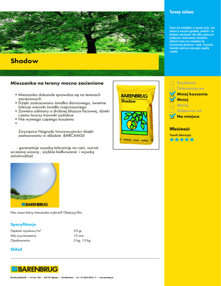 Tereny zielone Trawa jest niezbędna w naszym życiu. Jest obecna w naszych ogrodach, parkach i na boiskach sportowych. Nie tylko ważne jest praktyczne zastosowanie trawników, zdolność trawy jest niezbędna do oczyszczenia powietrza i wody. Znaczenie trawnika wykracza więc poza aspekty estetyki. Shadow Mieszanka na tereny mocno zacienione •Mieszanka dokonale sprawdza się na terenach zacienionych •Dzięki zastosowaniu śmiałka darniowego, świetnie toleruje warunki światła rozproszonego •Zawiera odmiany o drobnej blaszce liściowej, dzieki czemu tworzy trawniki ozdobne •Nie wymaga częstego koszenia • Zwycięzca Nagrody Innowacyjności dzięki zastosowaniu w składzie BARCAMSII - gwarantuje wysoką tolerancję na cień, wzrost wczesną wiosną , szybkie kiełkowanie i wysoką zimotrwałość Nie wiesz którą mieszanke wybrać? Obejrzyj film. Specyfikacje Gęstość wysiewu/m² Min.wys.koszenia Opakowania 25 gr 15 mm 5 kg, 15 kg Skład Barenbrug Holland BV • P.O. Box 1338 • 6501 BH Nijmegen • The Netherlands • Tel.: +31 (0)24 348 81 11 • www.barenbrug.nl Szybkość Tolerancja na Mniej koszenia Mniej Mniej Odporna na Na miejsca Właściwości Trawnik dekoracyjny Tereny zielone 40% Śmiałek darniowy 30% Kostrzewa czerwona kępowa 10% Kostrzewa owcza 20% Wiechlina łąkowa Trawa jest niezbędna w naszym życiu. Jest obecna w naszych ogrodach, parkach i na boiskach sportowych. Nie tylko ważne jest praktyczne zastosowanie trawników, zdolność trawy jest niezbędna do oczyszczenia powietrza i wody. Znaczenie trawnika wykracza więc poza aspekty estetyki. Szybkość Tolerancja na Mniej koszenia Mniej Mniej Odporna na Na miejsca Właściwości Trawnik dekoracyjny Barenbrug Holland BV • P.O. Box 1338 • 6501 BH Nijmegen • The Netherlands • Tel.: +31 (0)24 348 81 11 • www.barenbrug.nl