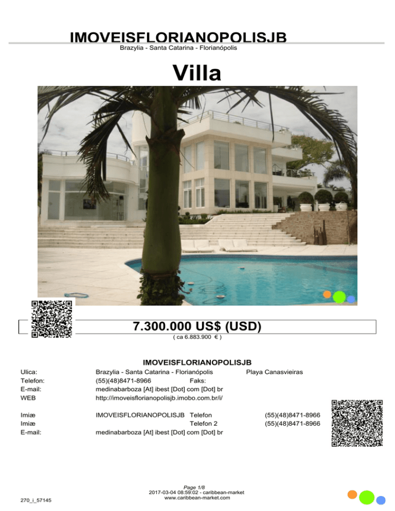 IMOVEISFLORIANOPOLISJB Brazylia - Santa Catarina - Florianópolis Villa Poùoýenie obiektu : Brazylia - Santa Catarina - Florianópolis 7.300.000 US$ (USD) ( ca 6.883.900 € ) IMOVEISFLORIANOPOLISJB Ulica: Telefon: E-mail: WEB Brazylia - Santa Catarina - Florianópolis (55)(48)8471-8966 Faks: medinabarboza [At] ibest [Dot] com [Dot] br http://imoveisflorianopolisjb.imobo.com.br/i/ Imiæ Imiæ E-mail: IMOVEISFLORIANOPOLISJB Telefon Telefon 2 medinabarboza [At] ibest [Dot] com [Dot] br 270_i_57145 Page 1/8 2017-03-04 08:59:02 - caribbean-market www.caribbean-market.com Playa Canasvieiras (55)(48)8471-8966 (55)(48)8471-8966 IMOVEISFLORIANOPOLISJB Brazylia - Santa Catarina - Florianópolis Numer kodu Typ budynku Poùoýenie Materiaùy Property Address 270_i_57145 Villa Seafront Numer kodu Nr referencyjny Status objektet Rok Powierzchnia dziaùki Firma Ýycie Kuchnia Sypialnie Zùy Opinie Toaleta 1600 m2 Powierzchnia 1 3 6 Biznes Inne Usùugi Garaý Carport zadaszony taras Akcesoria Dzierýawa Taras Balkon Jetty Pokój Party Klimatyzacja Resort Ogród Pralnia Goràcy zadaszony taras ogrodzony / murem 270_i_57145 Page 2/8 2017-03-04 08:59:02 - caribbean-market www.caribbean-market.com natychmiast potrzebne 2014 6 IMOVEISFLORIANOPOLISJB Brazylia - Santa Catarina - Florianópolis 270_i_57145 Page 3/8 2017-03-04 08:59:02 - caribbean-market www.caribbean-market.com IMOVEISFLORIANOPOLISJB Brazylia - Santa Catarina - Florianópolis 270_i_57145 Page 4/8 2017-03-04 08:59:02 - caribbean-market www.caribbean-market.com IMOVEISFLORIANOPOLISJB Brazylia - Santa Catarina - Florianópolis 270_i_57145 Page 5/8 2017-03-04 08:59:02 - caribbean-market www.caribbean-market.com IMOVEISFLORIANOPOLISJB Brazylia - Santa Catarina - Florianópolis 270_i_57145 Page 6/8 2017-03-04 08:59:02 - caribbean-market www.caribbean-market.com IMOVEISFLORIANOPOLISJB Brazylia - Santa Catarina - Florianópolis 270_i_57145 Page 7/8 2017-03-04 08:59:02 - caribbean-market www.caribbean-market.com IMOVEISFLORIANOPOLISJB Brazylia - Santa Catarina - Florianópolis 270_i_57145 Page 8/8 2017-03-04 08:59:02 - caribbean-market www.caribbean-market.com