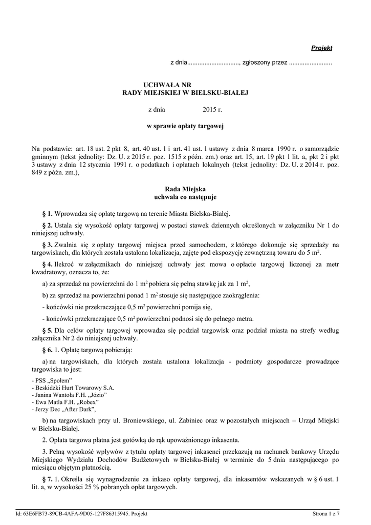Projekt z dnia.............................., zgłoszony przez ......................... UCHWAŁA NR RADY MIEJSKIEJ W BIELSKU-BIAŁEJ z dnia 2015 r. w sprawie opłaty targowej Na podstawie: art. 18 ust. 2 pkt 8, art. 40 ust. 1 i art. 41 ust. 1 ustawy z dnia 8 marca 1990 r. o samorządzie gminnym (tekst jednolity: Dz. U. z 2015 r. poz. 1515 z późn. zm.) oraz art. 15, art. 19 pkt 1 lit. a, pkt 2 i pkt 3 ustawy z dnia 12 stycznia 1991 r. o podatkach i opłatach lokalnych (tekst jednolity: Dz. U. z 2014 r. poz. 849 z późn. zm.), Rada Miejska uchwala co następuje § 1. Wprowadza się opłatę targową na terenie Miasta Bielska-Białej. § 2. Ustala się wysokość opłaty targowej w postaci stawek dziennych określonych w załączniku Nr 1 do niniejszej uchwały. § 3. Zwalnia się z opłaty targowej miejsca przed samochodem, z którego dokonuje się sprzedaży na targowiskach, dla których została ustalona lokalizacja, zajęte pod ekspozycję zewnętrzną towaru do 5 m2. § 4. Ilekroć w załącznikach do niniejszej uchwały jest mowa o opłacie targowej liczonej za metr kwadratowy, oznacza to, że: a) za sprzedaż na powierzchni do 1 m2 pobiera się pełną stawkę jak za 1 m2, b) za sprzedaż na powierzchni ponad 1 m2 stosuje się następujące zaokrąglenia: - końcówki nie przekraczające 0,5 m2 powierzchni pomija się, - końcówki przekraczające 0,5 m2 powierzchni podnosi się do pełnego metra. § 5. Dla celów opłaty targowej wprowadza się podział targowisk oraz podział miasta na strefy według załącznika Nr 2 do niniejszej uchwały. § 6. 1. Opłatę targową pobierają: a) na targowiskach, dla których została ustalona lokalizacja - podmioty gospodarcze prowadzące targowiska to jest: - PSS „Społem” - Beskidzki Hurt Towarowy S.A. - Janina Wantoła F.H. „Józio” - Ewa Matla F.H. „Robex” - Jerzy Dec „After Dark”, b) na targowiskach przy ul. Broniewskiego, ul. Żabiniec oraz w pozostałych miejscach – Urząd Miejski w Bielsku-Białej. 2. Opłata targowa płatna jest gotówką do rąk upoważnionego inkasenta. 3. Pełną wysokość wpływów z tytułu opłaty targowej inkasenci przekazują na rachunek bankowy Urzędu Miejskiego Wydziału Dochodów Budżetowych w Bielsku-Białej w terminie do 5 dnia następującego po miesiącu objętym płatnością. § 7. 1. Określa się wynagrodzenie za inkaso opłaty targowej, dla inkasentów wskazanych w § 6 ust. 1 lit. a, w wysokości 25 % pobranych opłat targowych. Id: 63E6FB73-89CB-4AFA-9D05-127F86315945. Projekt Strona 1 z 7 2. Prowizję za pobór opłaty targowej wypłaca Urząd Miejski w Bielsku-Białej do 15 dnia miesiąca następującego po miesiącu wpłacenia przez inkasenta, na rachunek Urzędu Miejskiego pobranych opłat targowych, na podstawie wystawionego rachunku lub faktury. § 8. Zobowiązuje się uprawnionych inkasentów do odbioru druków opłaty targowej w Wydziale Dochodów Budżetowych Urzędu Miejskiego w Bielsku-Białej. § 9. Inkasenci zobowiązani są do składania miesięcznych rozliczeń przychodu i rozchodu druków opłaty targowej w Wydziale Dochodów Budżetowych Urzędu Miejskiego w Bielsku-Białej w terminie do 5 dnia miesiąca następującego po miesiącu ich pobrania. § 10. Wykonanie uchwały powierza się Prezydentowi Miasta Bielska-Białej. § 11. Traci moc Uchwała Nr X/175/2007 Rady Miejskiej w Bielsku-Białej z dnia 5 czerwca 2007 r. w sprawie opłaty targowej, zmieniona Uchwałą Nr XV/342/2007 z dnia 18 września 2007 r., Uchwałą Nr LV/1281/2010 z dnia 11 maja 2010 r., Uchwałą Nr XXVII/681/2013 z dnia 26 lutego 2013 r. oraz Uchwałą Nr VIII/105/2015 z dnia 26 maja 2015 r. § 12. Uchwała wchodzi w życie z dniem 1 stycznia 2016 r. i podlega ogłoszeniu w Dzienniku Urzędowym Województwa Śląskiego. Id: 63E6FB73-89CB-4AFA-9D05-127F86315945. Projekt Strona 2 z 7 Załącznik Nr 1 do Uchwały Nr Rady Miejskiej w Bielsku-Białej z dnia 24 listopada 2015 r. I. Opłata targowa dla targowisk, na których sprzedaż prowadzona jest tylko w niektóre dni tygodnia Przedmiot opłaty targowej 1. Stawka opłaty targowej Sprzedaż z samochodu, przyczepy a) o ładowności do 1,5 t - owoce, płody rolne 7,00 zł - inne 11,00 zł b) o ładowności powyżej 1,5 t do 3,5 t - owoce, płody rolne 8,00 zł - inne 14,00 zł c) o ładowności powyżej 3,5 t do 5 t - owoce, płody rolne 9,00 zł - inne 15,00 zł d) o ładowności powyżej 5 t - owoce, płody rolne 17,00 zł - inne 32,00 zł 2. Punkt gastronomiczny 6,00 zł 3. Sprzedaż za 1 m2 – stragan, " koperta", stół 3,00 zł 4. Sprzedaż pozostała za 1 m2 - artykuły spożywcze 2,00 zł - inne 3,00 zł Id: 63E6FB73-89CB-4AFA-9D05-127F86315945. Projekt Strona 3 z 7 II. Opłata targowa dla targowisk, na których sprzedaż prowadzona jest we wszystkie dni tygodnia Stawka opłaty targowej Przedmiot opłaty targowej w dni powszednie w niedzielę - płody rolne 10,00 zł 20,00 zł - inne 15,00 zł 31,00 zł - płody rolne 20,00 zł 20,00 zł - inne 31,00 zł 37,00 zł - płody rolne 25,00 zł 25,00 zł - inne 33,00 zł 39,00 zł - płody rolne 32,00 zł 32,00 zł - inne 44,00 zł 47,00 zł d) o ładowności powyżej 5 t 59,00 zł 59,00 zł 3. Punkt gastronomiczny 15,00 zł 17,00 zł 4. Sprzedaż - za 1 stanowisko objęte rezerwacją do 6 m2 10,00 zł 15,00 zł 5. Sprzedaż pozostała za 1 m2 - artykuły spożywcze 1,00 zł 2,00 zł - inne 2,00 zł 3,00 zł 6. Sprzedaż samochodu - za jedno stanowisko 6,00 zł 6,00 zł 7. Sprzedaż motocykla - za jedno stanowisko 2,00 zł 2,00 zł 1. 2. Sprzedaż z samochodu osobowego Sprzedaż z przyczepy oraz samochodu a) o ładowności do 1,5 t b) o ładowności powyżej 1,5 t do 3,5 t c) o ładowności powyżej 3,5 t do 5 t Id: 63E6FB73-89CB-4AFA-9D05-127F86315945. Projekt Strona 4 z 7 III. Opłata targowa w pozostałych miejscach prowadzenia sprzedaży na terenie Miasta Bielska–Białej z podziałem na strefy Przedmiot opłaty targowej 1. Stawka opłaty targowej STREFA I STREFA II 9,00 zł 9,00 z