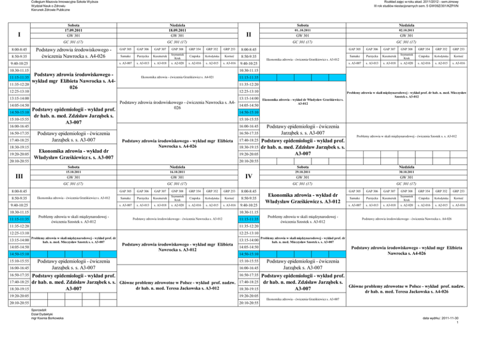 Collegium Mazovia Innowacyjna Szkoła Wyższa Wydział Nauk o Zdrowiu Kierunek Zdrowie Publiczne Sobota 17.09.2011 GW 301 Niedziela 18.09.2011 GW 301 GC 301 (17) GC 301 (17) I 8:00-8:45 8:50-9:35 Rozkład zajęc w roku akad. 2011/2012 - sem.zimowy III rok studiów niestacjonarnych sem. 5 GW09Z/301/KZP/I/N Podstawy zdrowia środowiskowego ćwiczenia Nawrocka s. A4-026 9:40-10:25 II 11:35-12:20 12:25-13:10 16:00-16:45 16:50-17:35 17:40-18:25 18:30-19:15 19:20-20:05 20:10-20:55 Podstawy epidemiologii - wykład prof. dr hab. n. med. Zdzisław Jarząbek s. A3-007 Podstawy epidemiologii - ćwiczenia Jarząbek s. s. A3-007 GAP 307 GNP 308 GRP 354 GRP 352 GRP 253 8:00-8:45 GAP 305 GAP 306 GAP 307 GNP 308 GRP 354 GRP 352 Purzycka Kuszneruk Szymaniuk Kruk Czapska Kołodyńska Korneć 8:50-9:35 Samake Purzycka Kuszneruk Szymaniuk Kruk Czapska Kołodyńska Korneć s. A3-007 s. A3-013 s. A3-018 s. A2-020 s. A2-016 s. A2-015 s. A3-016 9:40-10:25 s. A3-007 s. A3-013 s. A3-018 s. A2-020 s. A2-016 s. A2-015 s. A3-016 Ekonomika zdrowia - ćwiczenia Grześkiewicz s. A4-021 11:35-12:20 12:25-13:10 Podstawy zdrowia środowiskowego - ćwiczenia Nawrocka s. A4026 15:10-15:55 16:00-16:45 16:50-17:35 Podstawy zdrowia środowiskowego - wykład mgr Elżbieta Nawrocka s. A4-026 20:10-20:55 Sobota Niedziela 16.10.2011 29.10.2011 30.10.2011 GW 301 GW 301 GC 301 (17) GC 301 (17) Ekonomika zdrowia - ćwiczenia Grześkiewicz s. A3-012 IV GAP 305 GAP 306 GAP 307 GNP 308 GRP 354 GRP 352 GRP 253 8:00-8:45 Samake Purzycka Kuszneruk Szymaniuk Kruk Czapska Kołodyńska Korneć 8:50-9:35 s. A3-007 s. A3-013 s. A3-018 s. A2-020 s. A2-016 s. A2-015 s. A3-016 9:40-10:25 GW 301 GW 301 GC 301 (17) GC 301 (17) Ekonomika zdrowia - wykład dr Władysław Grześkiewicz s. A3-012 GAP 305 GAP 306 GAP 307 GNP 308 GRP 354 GRP 352 Samake Purzycka Kuszneruk Szymaniuk Kruk Czapska Kołodyńska GRP 253 Korneć s. A3-007 s. A3-013 s. A3-018 s. A2-020 s. A2-016 s. A2-015 s. A3-016 10.30-11.15 Problemy zdrowia w skali międzynarodowej ćwiczenia Szostek s. A3-012 Podstawy zdrowia środowiskowego - ćwiczenia Nawrocka s. A3-012 11:15-11:35 Problemy zdrowia w skali międzynarodowej ćwiczenia Szostek s. A3-012 Podstawy zdrowia środowiskowego - ćwiczenia Nawrocka s. A4-026 11:35-12:20 12:25-13:10 Problemy zdrowia w skali międzynarodowej - wykład prof. dr hab. n. med. Mieczysław Szostek s. s. A3-007 13:15-14:00 Podstawy zdrowia środowiskowego - wykład mgr Elżbieta Nawrocka s. A3-012 14:50-15:10 18:30-19:15 Problemy zdrowia w skali międzynarodowej - ćwiczenia Szostek s. s. A3-012 Podstawy epidemiologii - wykład prof. dr hab. n. med. Zdzisław Jarząbek s. s. A3-007 15.10.2011 14:05-14:50 17:40-18:25 18:30-19:15 Podstawy epidemiologii - ćwiczenia Jarząbek s. s. A3-007 Niedziela 12:25-13:10 16:50-17:35 17:40-18:25 19:20-20:05 11:35-12:20 16:00-16:45 Problemy zdrowia w skali międzynarodowej - wykład prof. dr hab. n. med. Mieczysław Szostek s. A3-012 14:50-15:10 10.30-11.15 15:10-15:55 13:15-14:00 Ekonomika zdrowia - wykład dr Władysław Grześkiewicz s. A3-012 14:05-14:50 Sobota 9:40-10:25 13:15-14:00 Ekonomika zdrowia - ćwiczenia Grześkiewicz s. A3-012 GRP 253 11:15-11:35 Ekonomika zdrowia - wykład dr Władysław Grześkiewicz s. s. A3-007 8:00-8:45 11:15-11:35 GC 301 (17) 10.30-11.15 III 8:50-9:35 GW 301 GC 301 (17) GAP 306 Podstawy zdrowia środowiskowego wykład mgr Elżbieta Nawrocka s. A4026 14:05-14:50 15:10-15:55 02.10.2011 GW 301 Samake 13:15-14:00 14:50-15:10 Niedziela GAP 305 10.30-11.15 11:15-11:35 Sobota 01..10.2011 Problemy zdrowia w skali międzynarodowej - wykład prof. dr hab. n. med. Mieczysław Szostek s. s. A3-007 14:05-14:50 Podstawy zdrowia środowiskowego - wykład mgr Elżbieta Nawrocka s. A4-026 14:50-15:10 Podstawy epidemiologii - ćwiczenia Jarząbek s. s. A3-007 Podstawy epidemiologii - wykład prof. dr hab. n. med. Zdzisław Jarząbek s. s. Główne problemy zdrowotne w Polsce - wykład prof. nadzw. dr hab. n. med. Teresa Jackowska s. A3-012 A3-007 19:20-20:05 15:10-15:55 16:00-16:45 16:50-17:35 17:40-18:25 18:30-19:15 19:20-20:05 20:10-20:55 Podstawy epidemiologii - ćwiczenia Jarząbek s. A3-007 Podstawy epidemiologii - wykład prof. dr hab. n. med. Zdzisław Jarząbek s. Główne problemy zdrowotne w Polsce - wykład prof. nadzw. A3-007 dr hab. n. med. Teresa Jackowska s. A4-026 Ekonomika zdrowia - ćwiczenia Grześkiewicz s. A3-007 20:10-20:55 Sporzadził: Dział Dydaktyki mgr Ksenia Borkowska data wydrku: 2011-11-30 1 Collegium Mazovia Innowacyjna Szkoła Wyższa Wydział Nauk o Zdrowiu Kierunek Zdrowie Publiczne V Rozkład zajęc w roku akad. 2011/2012 - sem.zimowy III rok studiów niestacjonarnych sem. 5 GW09Z/301/KZP/I/N Sobota Niedziela Sobota Niedziela 19.11.2011 20.11.2011 03.12.2011 04..12.2011 GW 301 GW 301 GC 301 (17) GC 301 (17) VI GW 301 GW 301 GC 301 (17) GC 301 (17) 8:00-8:45 GAP 305 GAP 306 GAP 307 GNP 308 GRP 354 GRP 352 GRP 253 8:00-8:45 GAP 305 GAP 306 GAP 307 GNP 308 GRP 354 GRP 352 8:50-9:35 Samake Purzycka Kuszneruk Szymaniuk Kruk Czapska Kołodyńska Korneć 8:50-9:35 Samake Purzycka Kuszneruk Szymaniuk Kruk Czapska Kołodyńska Korneć 9:40-10:25 s. A3-007 s. A3-013 s. A3-018 s. A2-020 s. A2-016 s. A2-015 s. A3-016 9:40-10:25 s. A3-007 s. A3-013 s. A3-018 s. A2-020 s. A2-016 s. A2-015 s. A3-016 10.30-11.15 Problemy zdrowia w skali międzynarodowej ćwiczenia Szostek s. A4-026 10.30-11.15 11:15-11:35 11:35-12:20 Problemy zdrowia w skali międzynarodowej - wykład prof. dr hab. n. med. Mieczysław Szostek s. A3-007 12:25-13:10 13:15-14:00 14:05-14:50 14:50-15:10 15:10-15:55 16:00-16:45 16:50-17:35 17:40-18:25 18:30-19:15 19:20-20:05 20:10-20:55 Podstawy epidemiologii - wykład prof. dr hab. n. med. Zdzisław Jarząbek s. A4-026 11:15-11:35 Podstawy zdrowia środowiskowego - ćwiczenia Nawrocka s. A4-026 11:35-12:20 12:25-13:10 Problemy zdrowia w skali międzynarodowej ćwiczenia Szostek s. A4-026 GRP 253 Problemy zdrowia w skali międzynarodowej - wykład prof. dr hab. n. med. Mie