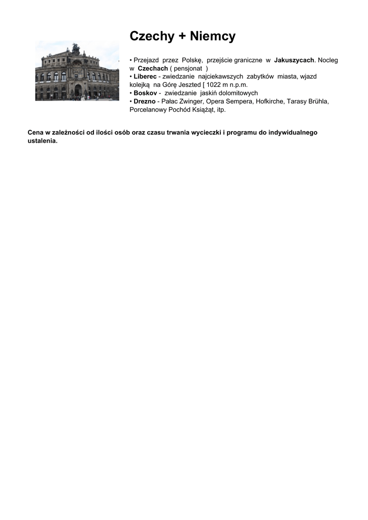 Czechy + Niemcy • Przejazd przez Polskę, przejście graniczne w Jakuszycach. Nocleg w Czechach ( pensjonat ) • Liberec - zwiedzanie najciekawszych zabytków miasta, wjazd kolejką na Górę Jeszted [ 1022 m n.p.m. • Boskov - zwiedzanie jaskiń dolomitowych • Drezno - Pałac Zwinger, Opera Sempera, Hofkirche, Tarasy Brühla, Porcelanowy Pochód Książąt, itp. Cena w zależności od ilości osób oraz czasu trwania wycieczki i programu do indywidualnego ustalenia.
