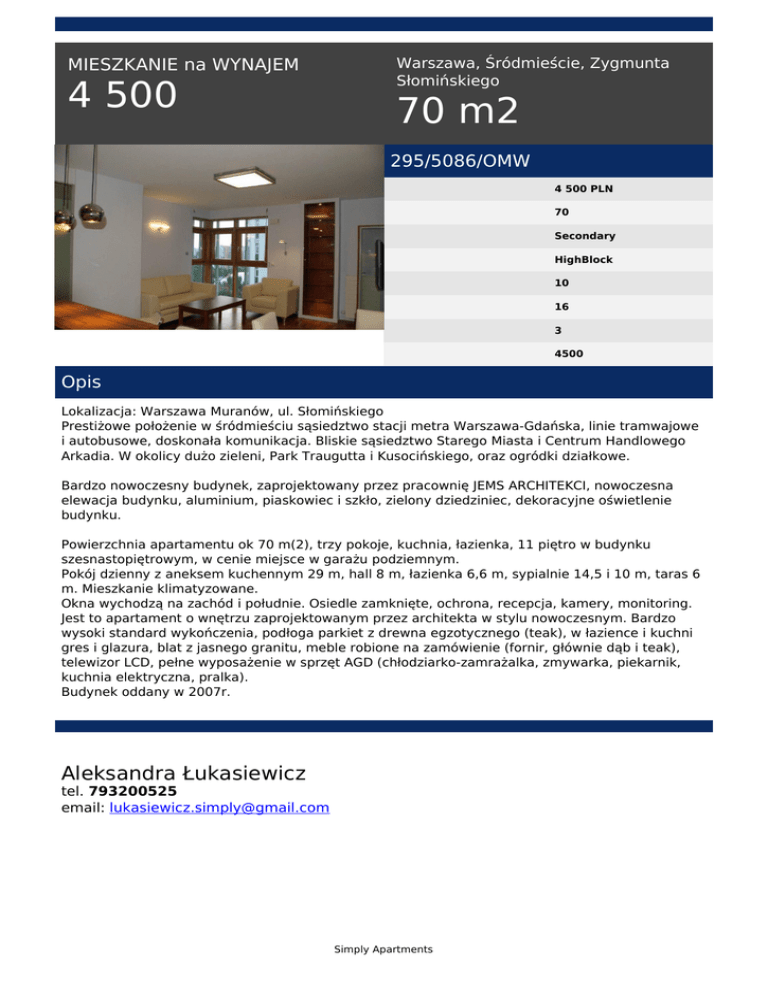 Warszawa, Śródmieście, Zygmunta Słomińskiego MIESZKANIE na WYNAJEM 4 500 70 m2 295/5086/OMW 4 500 PLN 70 Secondary HighBlock 10 16 3 4500 Opis Lokalizacja: Warszawa Muranów, ul. Słomińskiego Prestiżowe położenie w śródmieściu sąsiedztwo stacji metra Warszawa-Gdańska, linie tramwajowe i autobusowe, doskonała komunikacja. Bliskie sąsiedztwo Starego Miasta i Centrum Handlowego Arkadia. W okolicy dużo zieleni, Park Traugutta i Kusocińskiego, oraz ogródki działkowe. Bardzo nowoczesny budynek, zaprojektowany przez pracownię JEMS ARCHITEKCI, nowoczesna elewacja budynku, aluminium, piaskowiec i szkło, zielony dziedziniec, dekoracyjne oświetlenie budynku. Powierzchnia apartamentu ok 70 m(2), trzy pokoje, kuchnia, łazienka, 11 piętro w budynku szesnastopiętrowym, w cenie miejsce w garażu podziemnym. Pokój dzienny z aneksem kuchennym 29 m, hall 8 m, łazienka 6,6 m, sypialnie 14,5 i 10 m, taras 6 m. Mieszkanie klimatyzowane. Okna wychodzą na zachód i południe. Osiedle zamknięte, ochrona, recepcja, kamery, monitoring. Jest to apartament o wnętrzu zaprojektowanym przez architekta w stylu nowoczesnym. Bardzo wysoki standard wykończenia, podłoga parkiet z drewna egzotycznego (teak), w łazience i kuchni gres i glazura, blat z jasnego granitu, meble robione na zamówienie (fornir, głównie dąb i teak), telewizor LCD, pełne wyposażenie w sprzęt AGD (chłodziarko-zamrażalka, zmywarka, piekarnik, kuchnia elektryczna, pralka). Budynek oddany w 2007r. Aleksandra Łukasiewicz tel. 793200525 email: [email protected] Simply Apartments Powered by TCPDF (www.tcpdf.org)