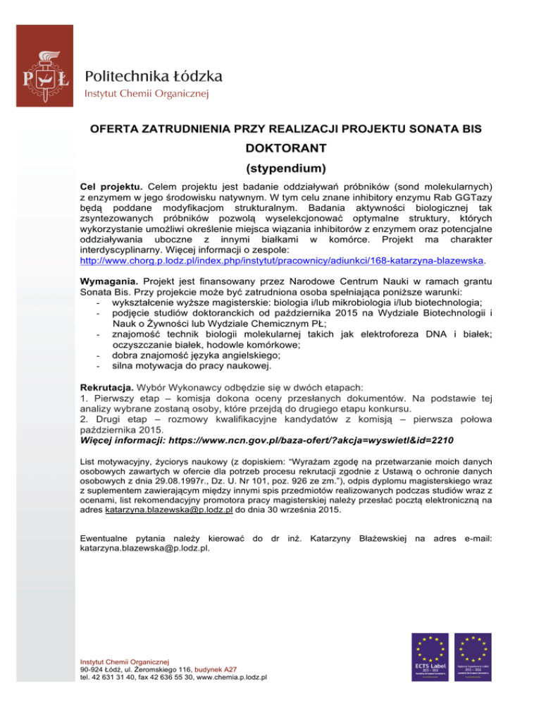 OFERTA ZATRUDNIENIA PRZY REALIZACJI PROJEKTU SONATA BIS DOKTORANT (stypendium) Cel projektu. Celem projektu jest badanie oddziaływań próbników (sond molekularnych) z enzymem w jego środowisku natywnym. W tym celu znane inhibitory enzymu Rab GGTazy będą poddane modyfikacjom strukturalnym. Badania aktywności biologicznej tak zsyntezowanych próbników pozwolą wyselekcjonować optymalne struktury, których wykorzystanie umożliwi określenie miejsca wiązania inhibitorów z enzymem oraz potencjalne oddziaływania uboczne z innymi białkami w komórce. Projekt ma charakter interdyscyplinarny. Więcej informacji o zespole: http://www.chorg.p.lodz.pl/index.php/instytut/pracownicy/adiunkci/168-katarzyna-blazewska. Wymagania. Projekt jest finansowany przez Narodowe Centrum Nauki w ramach grantu Sonata Bis. Przy projekcie może być zatrudniona osoba spełniająca poniższe warunki: - wykształcenie wyższe magisterskie: biologia i/lub mikrobiologia i/lub biotechnologia; - podjęcie studiów doktoranckich od października 2015 na Wydziale Biotechnologii i Nauk o Żywności lub Wydziale Chemicznym PŁ; - znajomość technik biologii molekularnej takich jak elektroforeza DNA i białek; oczyszczanie białek, hodowle komórkowe; - dobra znajomość języka angielskiego; - silna motywacja do pracy naukowej. Rekrutacja. Wybór Wykonawcy odbędzie się w dwóch etapach: 1. Pierwszy etap – komisja dokona oceny przesłanych dokumentów. Na podstawie tej analizy wybrane zostaną osoby, które przejdą do drugiego etapu konkursu. 2. Drugi etap – rozmowy kwalifikacyjne kandydatów z komisją – pierwsza połowa października 2015. Więcej informacji: https://www.ncn.gov.pl/baza-ofert/?akcja=wyswietl&id=2210 List motywacyjny, życiorys naukowy (z dopiskiem: “Wyrażam zgodę na przetwarzanie moich danych osobowych zawartych w ofercie dla potrzeb procesu rekrutacji zgodnie z Ustawą o ochronie danych osobowych z dnia 29.08.1997r., Dz. U. Nr 101, poz. 926 ze zm.”), odpis dyplomu magisterskiego wraz z suplementem zawierającym między innymi spis przedmiotów realizowanych podczas studiów wraz z ocenami, list rekomendacyjny promotora pracy magisterskiej należy przesłać pocztą elektroniczną na adres [email protected] do dnia 30 września 2015. Ewentualne pytania należy kierować do dr inż. Katarzyny Błażewskiej na adres e-mail: [email protected]. Instytut Chemii Organicznej 90-924 Łódź, ul. Żeromskiego 116, budynek A27 tel. 42 631 31 40, fax 42 636 55 30, www.chemia.p.lodz.pl