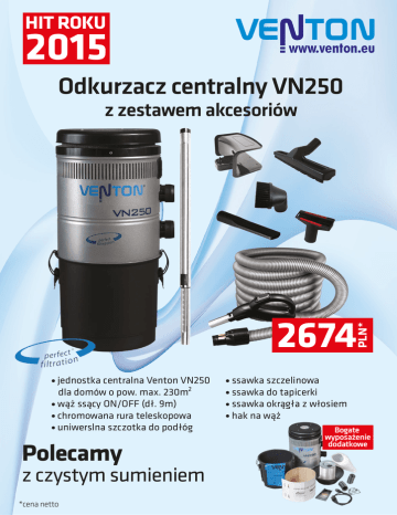 HIT ROKU 2015 www.venton.eu Odkurzacz centralny VN250 z zestawem akcesoriów PLN* 2674 - jednostka centralna Venton VN250 dla domów o pow. max. 230m2 - wąż ssący ON/OFF (dł. 9m) - chromowana rura teleskopowa - uniwerslna szczotka do podłóg Polecamy z czystym sumieniem *cena netto - ssawka szczelinowa - ssawka do tapicerki - ssawka okrągła z włosiem - hak na wąż Bogate wyposażenie dodatkowe