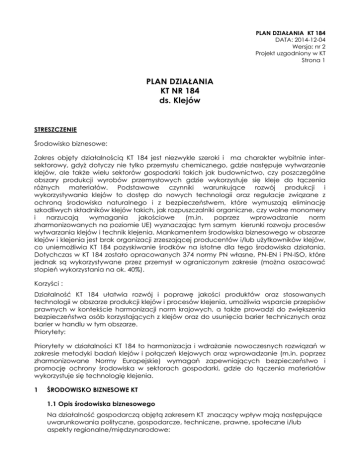PLAN DZIAŁANIA KT 184 DATA: 2014-12-04 Wersja: nr 2 Projekt uzgodniony w KT Strona 1 PLAN DZIAŁANIA KT NR 184 ds. Klejów STRESZCZENIE Środowisko biznesowe: Zakres objęty działalnością KT 184 jest niezwykle szeroki i ma charakter wybitnie intersektorowy, gdyż dotyczy nie tylko przemysłu chemicznego, gdzie następuje wytwarzanie klejów, ale także wielu sektorów gospodarki takich jak budownictwo, czy poszczególne obszary produkcji wyrobów przemysłowych gdzie wykorzystuje się kleje do łączenia różnych materiałów. Podstawowe czynniki warunkujące rozwój produkcji i wykorzystywania klejów to dostęp do nowych technologii oraz regulacje związane z ochroną środowiska naturalnego i z bezpieczeństwem, które wymuszają eliminację szkodliwych składników klejów takich, jak rozpuszczalniki organiczne, czy wolne monomery i narzucają wymagania jakościowe (m.in. poprzez wprowadzanie norm zharmonizowanych na poziomie UE) wyznaczając tym samym kierunki rozwoju procesów wytwarzania klejów i technik klejenia. Mankamentem środowiska biznesowego w obszarze klejów i klejenia jest brak organizacji zrzeszającej producentów i/lub użytkowników klejów, co uniemożliwia KT 184 pozyskiwanie środków na istotne dla tego środowiska działania. Dotychczas w KT 184 zostało opracowanych 374 normy PN własne, PN-EN i PN-ISO, które jednak są wykorzystywane przez przemysł w ograniczonym zakresie (można oszacować stopień wykorzystania na ok. 40%). Korzyści : Działalność KT 184 ułatwia rozwój i poprawę jakości produktów oraz stosowanych technologii w obszarze produkcji klejów i procesów klejenia, umożliwia wsparcie przepisów prawnych w kontekście harmonizacji norm krajowych, a także prowadzi do zwiększenia bezpieczeństwa osób korzystających z klejów oraz do usunięcia barier technicznych oraz barier w handlu w tym obszarze. Priorytety: Priorytety w działalności KT 184 to harmonizacja i wdrażanie nowoczesnych rozwiązań w zakresie metodyki badań klejów i połączeń klejowych oraz wprowadzanie (m.in. poprzez zharmonizowane Normy Europejskie) wymagań zapewniających bezpieczeństwo i promocję ochrony środowiska w sektorach gospodarki, gdzie do łączenia materiałów wykorzystuje się technologię klejenia. 1 ŚRODOWISKO BIZNESOWE KT 1.1 Opis środowiska biznesowego Na działalność gospodarczą objętą zakresem KT znaczący wpływ mają następujące uwarunkowania polityczne, gospodarcze, techniczne, prawne, społeczne i/lub aspekty regionalne/międzynarodowe: PLAN DZIAŁANIA KT 184 DATA: 2014-12-04 Wersja: nr 2 Projekt uzgodniony w KT Strona 2 Procesy łączenia różnych materiałów, w tym przede wszystkim klejenie, stanowią istotny element wielu procesów wytwórczych realizowanych w szeregu dziedzinach gospodarki takich, jak np. budownictwo, przemysł samochodowy, przemysł maszynowy, obuwniczy, drzewny a szczególnie produkcja mebli, opakowaniowy, czy przemysł produkcji artykułów z grupy RTV lub AGD. Zakres objęty działalnością KT 184 jest więc niezwykle szeroki i ma charakter wybitnie inter-sektorowy. Obecnie w procesach klejenia wykorzystuje się prawie wyłącznie polimerowe kleje syntetyczne, w tym zarówno kleje do połączeń konstrukcyjnych materiałów takich, jak drewno czy metal, jak i kleje nie tworzące trwałych połączeń, np. kleje samoprzylepne. Generalną tendencją w dziedzinie klejów jest zastępowanie klejów rozpuszczalnikowych klejami wodnodyspersyjnymi, termotopliwymi lub opartymi na żywicach reaktywnych. Istotnym kierunkiem jest też eliminacja innych szkodliwych składników klejów takich jak wolne monomery czy izocyjaniany. Działalność gospodarczą objętą zakresem KT 184 ds. Klejów, czyli produkcję klejów lub ich wykorzystywanie, prowadzą zarówno firmy mające status MIŚ, jak i duże koncerny o zasięgu międzynarodowym. Środowisko biznesowe jest zatem w znacznym stopniu zróżnicowane i trudno określić jednoznacznie wpływ poszczególnych czynników na jego stan. Należy dodatkowo zwrócić uwagę na to, że w Polsce nie istnieje organizacja zrzeszająca producentów klejów (organizacja taka - FEICA - istnieje tylko na poziomie UE), co w znacznym stopniu utrudnia działalność KT i praktycznie uniemożliwia uzyskanie środków np. na tłumaczenie norm, którymi powinni być zainteresowani zarówno producenci, jak i użytkownicy klejów. Można ogólnie stwierdzić, że na działalność gospodarczą objętą zakresem KT 184 znaczący wpływ mają następujące uwarunkowania polityczne, gospodarcze, techniczne, prawne, społeczne i/lub aspekty regionalne/międzynarodowe: - dostęp do nowych technologii - regulacje związane z ochroną środowiska naturalnego - regulacje związane z bezpieczeństwem W ramach regulacji związanych z bezpieczeństwem w UE obowiązuje Rozporządzenie UE nr 305/2011 w z związku z którym Komisja Europejska poleciła opracowanie zharmonizowanych norm EN dla wszystkich produktów mających potencjalny wpływ na bezpieczeństwo konstrukcji budowlanych, w tym klejów. Odpowiedni Komitet CEN (TC 193 „Adhesives”) otrzymał kilka mandatów w ramach których są aktualnie prowadzone prace normalizacyjne na szczeblu TC i w związku z tym także KT. 1.2 Wskaźniki ilościowe dotyczące środowiska biznesowego Poniższe wskaźniki ilościowe opisują środowisko biznesowe, w celu wsparcia działań KT poprzez zapewnienie niezbędnych danych: Ze względu na ogromne zróżnicowanie środowiska biznesowego KT 184 (patrz wyżej) brak jest danych dotyczących wskaźników ilościowych opisujących to środowisko. Można podać jedynie liczbę norm PN, PN-EN i PN-ISO opracowanych ramach PLAN DZIAŁANIA KT 184 DATA: 2014-12-04 Wersja: nr 2 Projekt uzgodniony w KT Strona 3 działalności KT-184 i ocenić jaki procent tych norm jest stosowanych w praktyce przez to środowisko. W KT nie opracowywano nowych norm PN własnych, gdyż nie było na nie zapotrzebowania. Liczba 