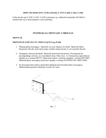 OPIS TECHNICZNY UCHA DYSZLA TYP U-620, U-625, U-630 Ucha dyszla typ U-620, U-625, U-630 wykonane są z odkuwki materiału 42CrMo4 i montowane są w przyczepach z osią centralną. INSTRUKCJA MONTAŻU I OBSŁUGI MONTAŻ PRZYSPAWANIE PŁYTY MOCUJĄCEJ typ P-620 1. Wpasuj płytę mocującą . Sprawdź czy jest miejsce na śruby. Sprawdź także kąt prosty tak aby ucho przyczepy zostało zamocowane w osi symetrii dyszla. 2. Następnie zamocuj dookoła. Sprawdź ponownie kąt prosty. Przyspawaj do prostopadłego otworu, ze wszystkich stron. Patrz (rys. 1). Oznaczenia spawalnicze zgodne są z normą SS2772. Spawanie należy wykonać zgodnie z normą ISO 4063. Materiał płyty mocującej musi być zgodny z normą S355J2PN-EN 10025:2002. 3. Po przyspawaniu należy sprawdzić płaskość powierzchni płyty mocującej. Maksymalna granica tolerancji wynosi 0,5 mm. Rys. 1 MONTAŻ UCHA 1. Przed montażem sprawdź, czy powierzchnia ucha i płyty mocującej są równe i czyste. Posmaruj olejem i załóż śruby M16 o własnościach 12,9, oraz podkładki zabezpieczające. 2. Dokręć śruby lekko , tak aby ucho przylegało płasko do płyty mocującej, dokręcaj w kolejności od 1 do 8, zgodnie z (rys. 2). Moment dokręcania 390Nm. Ponowne dokręcanie po 2500 km. Rys. 2 OBSŁUGA 1. Sprawdź czy ucho dyszla i spoiny nie mają pęknięć i nie są zdeformowane. Jeżeli ucho dyszla jest wygięte z powodu przeciążenia lub zarzucania przyczepy należy je wymienić. Zabrania się naprawy za pomocą spawania lub prostowania. 2. Sprawdź grubość ucha dyszla. Jeżeli grubość ucha dyszla jest mniejsza niż najmniejszy dopuszczalny wymiar (T) należy je wymienić. Grubość należy mierzyć w miejscu największego zużycia na środku ucha (rys. 3). Zabrania się naprawy za pomocą spawania. 3. Wymień ucho dyszla gdy przekroczony zostanie największy dopuszczalny wymiar (D) otworu ucha patrz ( rys.4). Dopuszczalne granice zużycia dla grubości średnicy otworu uch została podana w tabeli 1a. 4. Raz na tydzień ucho dyszla oczyść i nasmaruj. Rys. 3 Rys.4 Tabela 1a UCHO DYSZLA TYP ŚREDNICA Maks. D mm GRUBOŚĆ Min. T mm U-620 52 42 U-625 42 40 U-630 42 28.5 www.san-ust.com.pl