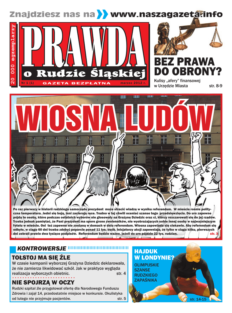 20 000 egzemplarzy Znajdziesz nas na www.naszagazeta.info Bez prawa o Rudzie Śląskiej do obrony? Nr 1 (1) G A Z E TA B E Z P Ł AT N A marzec 2012 r. Kulisy „afery” finansowej w Urzędzie Miasta str. 8-9 Wiosna ludów Po raz pierwszy w historii rudzkiego samorządu prezydent może stracić władzę w wyniku referendum. W mieście rośnie polityczna temperatura. Jedni się boją, inni zacierają ręce. Trudno w tej chwili oceniać szanse tego przedsięwzięcia. Do urn zapewne pójdą te osoby, które podczas ostatnich wyborów nie głosowały na Grażynę Dziedzic oraz ci, którzy rozczarowali się do jej rządów. Trzeba jednak pamiętać, że Pani prezydent ma spore grono zwolenników, nie wyobrażających sobie innej osoby w najważniejszym fotelu w mieście. Oni też zapewne nie zostaną w domach w dniu referendum. Wiosna zapowiada się ciekawie. Aby referendum się odbyło, w ciągu 60 dni trzeba zdobyć poparcie ponad 11 tys. osób. Inicjatorzy akcji zapewniają, że tylko w ciągu kilku, pierwszych dni zebrali prawie dwa tysiące podpisów. Referendum będzie ważne, jeżeli do urn pójdzie 22 tys. rudzian. str. 3 KONTROWERSJE Tołstoj ma się źle W czasie kampanii wyborczej Grażyna Dziedzic deklarowała, że nie zamierza likwidować szkół. Jak w praktyce wygląda realizacja wyborczych obietnic. str. 4 Nie spojrzą w oczy Rudzki szpital źle przygotował ofertę dla Narodowego Funduszu Zdrowia i zajął 14, przedostatnie miejsce w konkursie. Okulistyka od lutego nie przyjmuje pacjentów. str. 5 Hajduk w Londynie? Olimpijskie szanse rudzkiego zapaśnika str. 14-15 Aktualności 2 Czy weźmiesz udział w referendum co prawda PR AWDA O RUDZ I E ŚL ĄSKI E J to prawda P ierwsza „Prawda o Rudzie Śląskiej” ukazała się w połowie 2010 roku. Gazeta spotkała się z dużą sympatią ze strony Czytelników, a wśród elit miasta zasiała strach. „Prawda” miała wnieść świeżość w przestrzeń publiczną Rudy Śląskiej. I wniosła. To z naszych łamów mieszkańcy dowiedzieli się, że nie wszystko w Rudzie Śląskiej wygląda tak różowo, jak przedstawia to miejski tygodnik albo inne media żyjące z zysków z urzędowych reklam. Historia zatoczyła koło, a raczej kółeczko, bo niecałe dwa lata minęły jak z bicza strzelił. Znów jesteśmy na rudzkim rynku medialnym. Z tą samą misją społeczną i znacznie atrakcyjniejszą ofertą dla reklamodawców. W wersji papierowej będziemy się spotykać (na razie) raz w miesiącu. Na stronę internetową zapraszamy o każdej porze dnia i nocy. Gazeta jest bezpłatna. Jej nakład przekracza ofertę wszystkich lokalnych gazet razem wziętych. Nasz tytuł traktujemy bardzo dosłownie i poważnie, bo wiemy, że prawda czasami musi zaboleć. Jerzy Filar LIST DO REDAKCJI Nasza redakcja otrzymała oświadczenie, przygotowane przez grupę pracowników Urzędu Miasta. Jego autorzy z oczywistych względów zastrzegają sobie anonimowość. Publikujemy obszerne fragmenty oświadczenia. W tekście pominęliśmy wątki personalne, które mogłyby narazić dobra osobiste niektórych osób z kierownictwa Urzędu Miasta. Miasto strachu? W związku z nagłą śmiercią naszej koleżanki Pani Lucyny Mróz, wyrażamy głębokie zaniepokojenie i sprzeciw wobec faktu bezpodstawnego oskarżenia zmarłej, przez władze uchwałodawcze Miasta Ruda Śląska. Oskarżenie rzucone publicznie w formie oświadczenia Prezydent Miasta z dnia 7.02.2012 r., bez uprzedniego dochodzenia przez odpowiednie służby, zgodnie z Art. 212. Kodeksu Karnego wymaga wyjaśnienia, gdyż szarga dobre imię wieloletniego pracownika rudzkiego magistratu. W związku z powyższym domagamy się dokładnego wyjaśnienia sprawy przez władze Miasta oraz rehabilitacji publicznej Pani Lucyny Mróz we wszystkich mediach. Lucyna Mróz przez lata cieszyła się nieposzlakowaną opinią, była prawym i dobrym człowiekiem. Sprawy Rudy Śląskiej były dla niej przez lata priorytetem, któremu poświęciła czas i życie. Pracując w Urzędzie czujemy się upokarzani, zastraszani, ograniczani w swoich kompetencjach, izolowani i poniżani. Powszechnym zjawiskiem w urzędzie jest przenoszenie pracowników podczas nieobecności naczelnika (jego urlop, chorobowe, szkolenie). W praktyce polega to na przenoszeniu pracowników bez uprzedniej informacji do innych wydziałów i zespołów. Z dnia na dzień, bez uprzedniego przygotowania pracownik musi sprostać innym obowiązkom, a zakres czynności i odpowiedzialności odbiega daleko od wykształcenia. Tłumaczenie, że powinniśmy być elastyczni i jeden powinien zastąpić drugiego ma się nijak do ponoszonej odpowiedzialności i wyciąganych konsekwencji. W takich przypadkach bardzo łatwo o błąd, pomyłkę, przeoczenie(…) Jest jeszcze jeden powód takiego zarządzania: rozbijanie zespołów, osłabienie przyjaźni i zaufania do siebie nawzajem. Zaufanie w zespole to 99% sukcesu, a wzajemna pomoc, zastępowanie siebie, czy wyręczanie, to prawdziwa wygrana. Zburzenie takiego podejścia do pracy, rozbicie zespołu, wprowadzenie kogoś nowego, nieznanego to ukryty cel. „Nowe” osoby wypytuje się w sekretariacie o pracę innych. Są napiętnowane i wyobcowane. Ludzie się siebie boją, króluje brak zaufania (…) Pracownicy Urzędu Miasta Ruda Śląska marzec 2012r. Urząd Ochrony Konkurencji i Konsumentów bada, czy rudzkie Przedsiębiorstwo Wodociągów i Kanalizacji nie naruszyło przepisów, narzucając mieszkańcom astronomiczne ceny za dostarczanie wody i odprowadzanie ścieków. Leją Foto: Maciej Geyer po kieszeni N ikt na Śląsku nie płaci za wodę tyle, co rudzianie. Były radny Zbigniew Domżalski, kiedy tylko został prezesem PWiK, nabrał wiatru w żagle i wprowadził podwyżkę, która zaalarmowała nawet UOKiK. Mieszkańcom tłumaczono powody podwyżki, m.in. tym, że w mieście zmalało zużycie drogocennego płynu. Inaczej mówiąc: ludzie! Lejcie z kranów, ile się da, bo jak będziecie oszczędzać, to zn