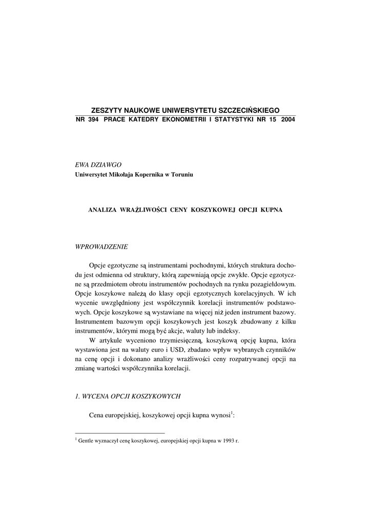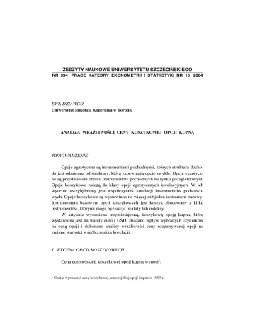 ZESZYTY NAUKOWE UNIWERSYTETU SZCZECI SKIEGO NR 394 PRACE KATEDRY EKONOMETRII I STATYSTYKI NR 15 2004 EWA DZIAWGO Uniwersytet Mikołaja Kopernika w Toruniu ANALIZA WRA LIWO CI CENY KOSZYKOWEJ OPCJI KUPNA WPROWADZENIE Opcje egzotyczne s instrumentami pochodnymi, których struktura dochodu jest odmienna od struktury, któr zapewniaj opcje zwykłe. Opcje egzotyczne s przedmiotem obrotu instrumentów pochodnych na rynku pozagiełdowym. Opcje koszykowe nale do klasy opcji egzotycznych korelacyjnych. W ich wycenie uwzgl dniony jest współczynnik korelacji instrumentów podstawowych. Opcje koszykowe s wystawiane na wi cej ni jeden instrument bazowy. Instrumentem bazowym opcji koszykowych jest koszyk zbudowany z kilku instrumentów, którymi mog by akcje, waluty lub indeksy. W artykule wyceniono trzymiesi czn , koszykow opcj kupna, która wystawiona jest na waluty euro i USD, zbadano wpływ wybranych czynników na cen opcji i dokonano analizy wra liwo ci ceny rozpatrywanej opcji na zmian warto ci współczynnika korelacji. 1. WYCENA OPCJI KOSZYKOWYCH Cena europejskiej, koszykowej opcji kupna wynosi1: 1 Gentle wyznaczył cen koszykowej, europejskiej opcji kupna w 1993 r. 62 Ewa Dziawgo CtB = gdzie: c = exp ∑ρ k ∑ k j =1 ( ( ~~σσ − i j ij wi w j i , j =1 ∑ w~ σ k j j =1 ( ) ) ~ j w j St cN ( d1 ) − K + c − 1 N (d 2 ) , 2 j (T − t ) , 2 ) 1 ~ ln c − ln K + c − 1 + v 2 (T − t ) 2 d1 = , v T −t 1 ~ ln c − ln K + c − 1 − v 2 (T − t ) 2 , d2 = v T −t N(d) – dystrybuanta rozkładu normalnego, ( ~ K= ) K ∑w F = k j j =1 Sj (t , T ) e − r ( T −t ) K ∑w S k j t , j j =1 K – cena wykonania opcji, ST i – cena „i” tego waloru w chwili T, T – czas wyga ni cia opcji, k – liczba walorów, na które wystawiona jest dana opcja. Zmodyfikowane wagi dla ustalonego t ∈ (0; T) wynosz : ~ = w i wi S ti ∑w S = k j j =1 t j wi FS i ( t ,T ) ∑w F k j j =1 Sj dla i = 1, 2, ..., k, ( t ,T ) gdzie: F i (t , T ) – cena forward w chwili t ustalonego i-tego waloru z terminem S wyga ni cia T, FSi (t , T ) = e r ( T −t ) S ti , Sti (dla i = 1, 2, ..., k) – proces ceny k podstawowych instrumentów finansowych, którymi s akcje. Analiza wra liwo ci ceny koszykowej opcji kupna 63 Proces Sti jest opisany geometrycznym ruchem Browna2: ( ) dS ti = S ti rdt + σ i dBti , gdzie: Bt – jednowymiarowy ruch Browna wzgl dem miary martyngałowej Q, r – stopa procentowa wolna od ryzyka, σ i ∈ R – zmienno "! ceny akcji3, wi – waga i-tego waloru, przy czym wi ≥ 0 oraz v2 = ∑ρ σ σ k ij i ∑w k i = 1, i =1 ~ ~ , ρ – współczynnik korelacji mi # dzy instrumeni, j j wi w j i , j =1 tami bazowymi. 2. PRZYKŁADY Badania empiryczne dotycz$ wyceny europejskich opcji koszykowych, których instrumentami bazowymi s$ waluty USD i euro. Analiz# przeprowadzono dla opcji kupna. Badania empiryczne dotycz$ okresu od 4 stycznia 2003 roku do 4 kwietnia 2003 roku. W obliczeniach przyj # to jednakowe wagi dla instrumentów podstawowych, to znaczy w przypadku opcji koszykowych wystawionych na dwie waluty wi = 0,5 (dla i = 1, 2). Na rysunku 1 przedstawiono kształtowanie si# w rozpatrywanym okresie cen trzymiesi # cznych, europejskich opcji zwykłych wystawionych na waluty euro i USD, a na rysunku 2 – opcji koszykowej wystawionej na waluty USD i euro. W rozpatrywanym okresie współczynnik korelacji mi# dzy walutami wynosi 0,54. Na rysunku 2 zilustrowano równie% kształtowanie si# & redniej ceny opcji zwykłych wystawionych na waluty USD i euro. Z analizy kształtowania si # cen opcji wynika, % e ceny opcji koszykowych s $ ni% sze od & rednich cen opcji zwykłych. Bior $ c pod uwag# koszty ponoszone przez inwestora na zabezpieczenie si # przed ryzykiem zmian [ ] 2 Z równania tego wynika, ' e cena akcji wynosi: S ti = S 0 exp σ i Bti + ( r − 0,5σ i2 )t . 3 Zmienno (*) akcji jest obliczana jako odchylenie standardowe stopy zwrotu z akcji. 64 Ewa Dziawgo 01.04 26.03 20.03 14.03 10.03 04.03 26.02 20.02 14.02 10.02 04.02 29.01 23.01 16.01 10.01 0,6 0,5 0,4 0,3 0,2 0,1 0 06.01 cena opcji [zł] cen instrumentów bazowych, opcje koszykowe s $ atrakcyjniejsze od opcji zwykłych. data c.op.zwyk.USD c.op.zwyk.EUR Rys. 1. Kształtowanie si+ cen opcji zwykłych wystawionych na waluty euro i USD , ródło: opracowanie własne. 0,5 cena [zł] 0,4 0,3 0,2 0,1 rednia cena opcji zwykłych 01.04 25.03 18.03 11.03 04.03 25.02 18.02 11.02 04.02 28.01 20.01 - 13.01 06.01 0 cena opcji koszykowej Rys. 2. Kształtowanie si+ ceny opcji koszykowej (wystawionej na waluty USD i euro) , i . redniej ceny opcji zwykłych (wystawionych na waluty euro i USD) ródło: opracowanie własne. Na rysunku 3 przedstawiono kształtowanie si # cen trzech opcji koszykowych o ró% nych terminach wyga & ni # cia. Opcje wystawione s$ na waluty euro i USD, charakteryzuj $ si # nast # puj $ cymi terminami wyga & ni# cia: 3 miesi $ ce, 6 miesi# cy i 9 miesi # cy. 65 data opcja 6-mies. opcja 3-mies. 04.04 31.03 25.03 19.03 13.03 07.03 03.03 25.02 19.02 13.02 07.02 03.02 28.01 22.01 15.01 0,45 0,4 0,35 0,3 0,25 0,2 0,15 0,1 0,05 0 09.01 cena [zł] Analiza wra/ liwo0 ci ceny koszykowej opcji kupna opcja 9-mies. Rys. 3. Kształtowanie si 1 cen opcji koszykowych (wystawionych na waluty USD oraz 4 euro). Terminy wyga 2 ni1 cia opcji: 3 miesi 3 ce, 6 miesi1 cy oraz 9 miesi 1 cy ródło: opracowanie własne. Z analizy kształtowania si 5 cen opcji koszykowych wynika, 6 e dro6 sze s7 opcje, które charakteryzuj 7 si 5 dłu6 szym terminem, który pozostał do ich wyga8 8"9 ni5 cia. Na rysunku 4 zilustrowano zale6 no ceny opcji koszykowej od czasu 8 wykonania. Zbli6 anie si 5 terminu wyga ni 5 cia wpływa na spadek ceny opcji kupna. 0,14 cena opcji [zł] 0,12 0,1 0,08 0,06 0,04 0,02 9 m. 6 m. 5 m. 4 m. 3 m. 2 m. 1 m. 0 czas pozostały do wyga: ni ; cia opcji Rys. 4. Wpływ czasu pozostałego do wyga 2 ni1 cia koszykowej opcji na jej cen1 4 ródło: opracowanie własne. 66 Ewa Dziawgo Na rysunku 5 przedstawiono wpływ ceny wykonania