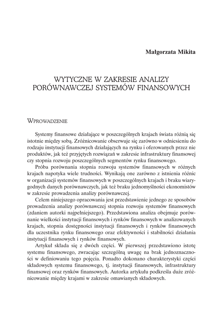 Małgorzata Mikita WYTYCZNE W ZAKRESIE ANALIZY PORÓWNAWCZEJ SYSTEMÓW FINANSOWYCH Wprowadzenie Systemy finansowe działające w poszczególnych krajach świata różnią się istotnie między sobą. Zróżnicowanie obserwuje się zarówno w odniesieniu do rodzaju instytucji finansowych działających na rynku i oferowanych przez nie produktów, jak też przyjętych rozwiązań w zakresie infrastruktury finansowej czy stopnia rozwoju poszczególnych segmentów rynku finansowego. Próba porównania stopnia rozwoju systemów finansowych w różnych krajach napotyka wiele trudności. Wynikają one zarówno z istnienia różnic w organizacji systemów finansowych w poszczególnych krajach i braku wiarygodnych danych porównawczych, jak też braku jednomyślności ekonomistów w zakresie prowadzenia analizy porównawczej. Celem niniejszego opracowania jest przedstawienie jednego ze sposobów prowadzenia analizy porównawczej stopnia rozwoju systemów finansowych (zdaniem autorki najpełniejszego). Przedstawiona analiza obejmuje porównanie wielkości instytucji finansowych i rynków finansowych w analizowanych krajach, stopnia dostępności instytucji finansowych i rynków finansowych dla uczestnika rynku finansowego oraz efektywności i stabilności działania instytucji finansowych i rynków finansowych. Artykuł składa się z dwóch części. W pierwszej przedstawiono istotę systemu finansowego, zwracając szczególną uwagę na brak jednoznaczności w definiowaniu tego pojęcia. Ponadto dokonano charakterystyki części składowych systemu finansowego, tj. instytucji finansowych, infrastruktury finansowej oraz rynków finansowych. Autorka artykułu podkreśla duże zróżnicowanie między krajami w zakresie omawianych składowych. 90 MAŁGORZATA MIKITA W drugiej części zarysowano wytyczne w zakresie prowadzenia analizy porównawczej stopnia rozwoju systemów finansowych w różnych krajach. Skupiono się na przedstawieniu wytycznych w zakresie analizy (czyli, co należy analizować) oraz miar stosowanych w analizie (czyli, jak należy mierzyć analizowane wielkości). Przykładami miar są różnego rodzaju wskaźniki pomocne przy ocenie systemu finansowego. 1. SYSTEM FINANSOWY – ISTOTA, ZRÓŻNICOWANIE Nie ma jednej, w pełni akceptowalnej definicji pojęcia – system finansowy. Ekonomiści formułują różne definicje, podkreślając różne cechy systemu finansowego. Jedni przywiązują dużą uwagę do elementów składowych systemu finansowego (podejście instytucjonalne), inni natomiast podkreślają funkcje jakie pełni system finansowy w gospodarce (podejście funkcjonalne). Są też tacy, którzy próbują łączyć podejście instytucjonalne i funkcjonalne tworząc definicje, w których akcentuje się zarówno elementy składowe systemu finansowego, jak też funkcje, które system ten pełni w gospodarce. Podkreśla się ponadto cechy charakterystyczne dla pojęcia – system, czyli wzajemne powiązanie elementów składowych i pełne współdziałanie. Podejście to nazywane jest podejściem systemowo-funkcjonalnym. Wydaje się, że najpełniej oddaje ono istotę systemu finansowego. Zgodnie z podejściem systemowo-funkcjonalnym, system finansowy to układ wzajemnie powiązanych elementów umożliwiający przedsiębiorstwom, gospodarstwom domowym i rządowi zaspokajanie wszelkich potrzeb związanych z finansową sferą funkcjonowania. Do podstawowych składowych systemu finansowego zalicza się: instytucje finansowe, infrastrukturę finansową oraz rynki finansowe. Instytucje finansowe to podmioty, których głównym zadaniem jest przesuwanie zasobów pieniądza od podmiotów dysponujących oszczędnościami (podmiotów nadwyżkowych) do podmiotów poszukujących kapitału (podmiotów deficytowych), jak też świadczenie usług związanych z zawieraniem transakcji. Przykładem tego typu podmiotów są m.in.: banki, zakłady ubezpieczeń, towarzystwa funduszy inwestycyjnych, biura maklerskie, pośrednicy kredytowi, doradcy finansowi, agencje finansowe. Część instytucji finansowych tworzy własne instrumenty finansowe, w oparciu o nabyte na rynku instrumenty finansowe innych podmiotów (przykładem mogą być fundusze inwestycyjne zamknięte tworzące certyfikaty inwestycyjne), część natomiast nie tworzy żadnych nowych instrumentów – ich rola sprowadza się do biernego pośrednictwa instrumentami finansowymi (np. biura maklerskie). Wytyczne w zakresie analizy porównawczej systemów finansowych 91 Rola poszczególnych instytucji finansowych w wielu krajach jest różna1. Na przykład w takich krajach, jak Wielka Brytania, Francja, Holandia, Japonia, Niemcy, Włochy dominującą rolę na rynku finansowym odgrywają banki. W innych, jak: USA, Kanada, Szwajcaria, Belgia wiodącą rolę w gromadzeniu i redystrybucji kapitałów odgrywa rynek kapitałowy (a nie banki)2. O dużym zróżnicowaniu można mówić także w odniesieniu do funduszy inwestycyjnych. Najlepiej rozwinięty rynek funduszy inwestycyjnych jest w Stanach Zjednoczonych. W wielu krajach rynek ten zaczął rozwijać się stosunkowo niedawno, czego przykładem może być Polska, gdzie pierwszy fundusz inwestycyjny powstał dopiero w 1992 r. (był to Polski Fundusz Powierniczy Pionier). Dla porównania pierwszy fundusz inwestycyjny w Wielkiej Brytanii powstał 129 lat wcześniej, tj. w 1863 roku (był to Szkocko-Amerykański Trust Inwestycyjny założony przez Roberta Fleminga). Nie dziwi zatem fakt, że poziom rozwoju rynku funduszy inwestycyjnych w różnych krajach wykazuje duże zróżnicowanie – zarówno w zakresie roli jaką odgrywają fundusze inwestycyjne na danym rynku finansowym, jak też zróżnicowania oferty produktowej dostępnej dla klientów. W niektórych krajach powstają nowe typu funduszy, np. fundusze hedgingowe czy fundusze Private Equity, które w innych krajach są zupełnie nieznane. Drugim elementem składowym systemu finansowego jest infrastruktura finansowa. Umożliwia ona 