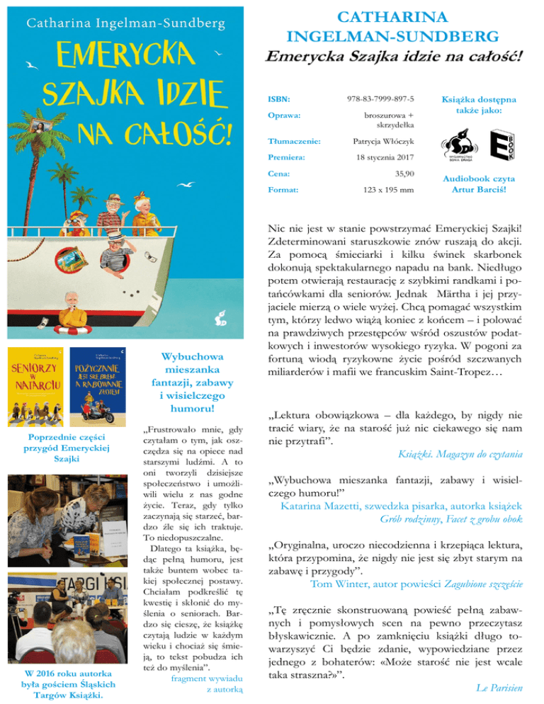 CATHARINA INGELMAN-SUNDBERG Emerycka Szajka idzie na całość! ISBN: Oprawa: Tłumaczenie: Premiera: Cena: Format: Wybuchowa mieszanka fantazji, zabawy i wisielczego humoru! Poprzednie części przygód Emeryckiej Szajki W 2016 roku autorka była gościem Śląskich Targów Książki. „Frustrowało mnie, gdy czytałam o tym, jak oszczędza się na opiece nad starszymi ludźmi. A to oni tworzyli dzisiejsze społeczeństwo i umożliwili wielu z nas godne życie. Teraz, gdy tylko zaczynają się starzeć, bardzo źle się ich traktuje. To niedopuszczalne. Dlatego ta książka, będąc pełną humoru, jest także buntem wobec takiej społecznej postawy. Chciałam podkreślić tę kwestię i skłonić do myślenia o seniorach. Bardzo się cieszę, że książkę czytają ludzie w każdym wieku i chociaż się śmieją, to tekst pobudza ich też do myślenia”. fragment wywiadu z autorką 978-83-7999-897-5 broszurowa + skrzydełka Książka dostępna także jako: Patrycja Włóczyk 18 stycznia 2017 35,90 123 x 195 mm Audiobook czyta Artur Barciś! Nic nie jest w stanie powstrzymać Emeryckiej Szajki! Zdeterminowani staruszkowie znów ruszają do akcji. Za pomocą śmieciarki i kilku świnek skarbonek dokonują spektakularnego napadu na bank. Niedługo potem otwierają restaurację z szybkimi randkami i potańcówkami dla seniorów. Jednak Märtha i jej przyjaciele mierzą o wiele wyżej. Chcą pomagać wszystkim tym, którzy ledwo wiążą koniec z końcem – i polować na prawdziwych przestępców wśród oszustów podatkowych i inwestorów wysokiego ryzyka. W pogoni za fortuną wiodą ryzykowne życie pośród szczwanych miliarderów i mafii we francuskim Saint-Tropez… „Lektura obowiązkowa – dla każdego, by nigdy nie tracić wiary, że na starość już nic ciekawego się nam nie przytrafi”. Książki. Magazyn do czytania „Wybuchowa mieszanka fantazji, zabawy i wisielczego humoru!” Katarina Mazetti, szwedzka pisarka, autorka książek Grób rodzinny, Facet z grobu obok „Oryginalna, uroczo niecodzienna i krzepiąca lektura, która przypomina, że nigdy nie jest się zbyt starym na zabawę i przygody”. Tom Winter, autor powieści Zagubione szczęście „Tę zręcznie skonstruowaną powieść pełną zabawnych i pomysłowych scen na pewno przeczytasz błyskawicznie. A po zamknięciu książki długo towarzyszyć Ci będzie zdanie, wypowiedziane przez jednego z bohaterów: «Może starość nie jest wcale taka straszna?»”. Le Parisien CATHARINA INGELMAN-SUNDBERG Jest archeologiem podwodnym, dziennikarką i pisarką. Przez wiele lat pracowała dla „Svenska Dagbladet”, obecnie całkowicie oddaje się pisaniu. W 1999 roku otrzymała nagrodę literacką imienia Larsa Widdinga. Prawa autorskie do bestsellerowych Seniorów w natarciu sprzedano do 26 krajów, a zabawna opowieść o dziarskich emerytach doczekała się kontynuacji w postaci dwóch kolejnych tomów. Jej książki sprzedały się już w ponad 2 milionach egzemplarzy! Prawa do publikacji powieści sprzedano do: Brazylii Bułgarii Czech Danii Estonii Finlandii Francji Hiszpanii Holandii Islandii Izraela Japonii Kanady Korei krajów arabskich Łotwy Niemiec Norwegii Polski Rumunii Rosji Słowacji Stanów Zjednoczonych Szwecji Turcji Węgier Wielkiej Brytanii Wietnamu Włoch Sonia Draga Sp. z o.o., Pl. Grunwaldzki 8-10, 40-127 Katowice, Tel.: 32 7826477, 7826037, Fax: 032 2537728 Dział handlowy: Danuta Czarnowska, 693420384, [email protected] Promocja: Agnieszka Jedlińska, 695672067, [email protected] Redakcja: [email protected] EMERYCKA SZAJKA to pięcioro uroczych staruszków, którzy wkroczyli na drogę przestępczości zorganizowanej, chcąc odmienić swoje życie w szwedzkim domu opieki. Kiedy w Diamencie, bo tak nazywa się ten dom, zaczyna dziać się coraz gorzej – jedzenie nie ma smaku, pensjonariusze narzekają na nudę i brak ruchu, a personel źle ich traktuje – uznają, że na pewno lepiej byłoby im w więzieniu. Märtha Anderson, lat 79, była nauczycielka WF-u, choć od lat jest na emeryturze, krzewi kulturę fizyczną wśród pensjonariuszy. Pulchniutka, pełna werwy, niezmiennie czarująca. Anna-Greta Bielke, lat 81, była urzędniczka bankowa, kąśliwa, zasadnicza i akuratna. Nigdy niezamężna, starsza pani wzbudzająca zazdrość innych starszych pań. Stina Åkerblom, lat 77, nieśmiała gospodyni domowa latami marząca o pracy bibliotekarki. Teraz nadrabia czytelnicze zaległości, maluje akwarele i kiedy tylko może delektuje się belgijską czekoladą. Bertil „Grabi” Engström, lat 84. Młodość spędził na morzu, a kiedy rzucił pracę na statku, został ogrodnikiem. Teraz wystarcza mu hodowla kwiatów i ziół na balkonie. Czarujący. Oscar „Geniusz” Krupp, lat 78, niegdyś wynalazca posiadający własny warsztat. W domu seniora Diament daje upust swojej kreatywności, wyposażając chodziki w chorągiewki i konstruując czapkę ze świecącą diodą. Niepoprawny optymista zdolny znaleźć rozwiązanie każdego problemu.