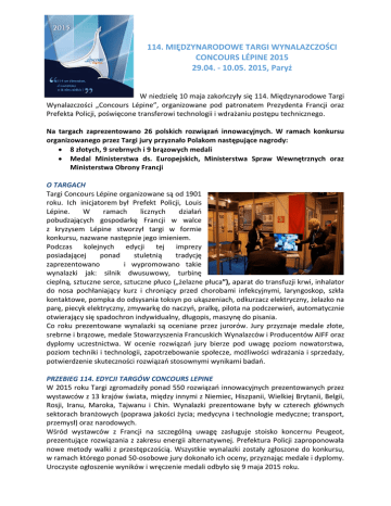 114. MIĘDZYNARODOWE TARGI WYNALAZCZOŚCI CONCOURS LÉPINE 2015 29.04. - 10.05. 2015, Paryż W niedzielę 10 maja zakończyły się 114. Międzynarodowe Targi Wynalazczości „Concours Lépine”, organizowane pod patronatem Prezydenta Francji oraz Prefekta Policji, poświęcone transferowi technologii i wdrażaniu postępu technicznego. Na targach zaprezentowano 26 polskich rozwiązań innowacyjnych. W ramach konkursu organizowanego przez Targi jury przyznało Polakom następujące nagrody: 8 złotych, 9 srebrnych i 9 brązowych medali Medal Ministerstwa ds. Europejskich, Ministerstwa Spraw Wewnętrznych oraz Ministerstwa Obrony Francji O TARGACH Targi Concours Lépine organizowane są od 1901 roku. Ich inicjatorem był Prefekt Policji, Louis Lépine. W ramach licznych działań pobudzających gospodarkę Francji w walce z kryzysem Lépine stworzył targi w formie konkursu, nazwane następnie jego imieniem. Podczas kolejnych edycji tej imprezy posiadającej ponad stuletnią tradycję zaprezentowano i wypromowano takie wynalazki jak: silnik dwusuwowy, turbinę cieplną, sztuczne serce, sztuczne płuco („żelazne płuca”), aparat do transfuzji krwi, inhalator do nosa pochłaniający kurz i chroniący przed chorobami infekcyjnymi, laryngoskop, szkła kontaktowe, pompka do odsysania toksyn po ukąszeniach, odkurzacz elektryczny, żelazko na parę, piecyk elektryczny, zmywarkę do naczyń, pralkę, pilota na podczerwień, automatycznie otwierający się spadochron indywidualny, długopis, maszynę do pisania. Co roku prezentowane wynalazki są oceniane przez jurorów. Jury przyznaje medale złote, srebrne i brązowe, medale Stowarzyszenia Francuskich Wynalazców i Producentów AIFF oraz dyplomy uczestnictwa. W ocenie rozwiązań jury bierze pod uwagę poziom nowatorstwa, poziom techniki i technologii, zapotrzebowanie społecze, możliwości wdrażania i sprzedaży, potwierdzenie skuteczności rozwiązań stosownymi wynikami badań. PRZEBIEG 114. EDYCJI TARGÓW CONCOURS LEPINE W 2015 roku Targi zgromadziły ponad 550 rozwiązań innowacyjnych prezentowanych przez wystawców z 13 krajów świata, między innymi z Niemiec, Hiszpanii, Wielkiej Brytanii, Belgii, Rosji, Iranu, Maroka, Tajwanu i Chin. Wynalazki prezentowane były w czterech głównych sektorach branżowych (poprawa jakości życia; medycyna i technologie medyczne; transport, przemysł) oraz narodowych. Wśród wystawców z Francji na szczególną uwagę zasługuje stoisko koncernu Peugeot, prezentujące rozwiązania z zakresu energii alternatywnej. Prefektura Policji zaproponowała nowe metody walki z przestępczością. Wszystkie wynalazki zostały zgłoszone do konkursu, w ramach którego ponad 50-osobowe jury dokonało ich oceny, przyznając medale i dyplomy. Uroczyste ogłoszenie wyników i wręczenie medali odbyło się 9 maja 2015 roku. W czasie uroczystości przewodniczący jury podkreślił wysoki poziom polskich wynalazków. Wzięło w niej udział wielu gości honorowych reprezentujących między innymi Prezydenta Francji, Ministra Nauki, Ministra Przemysłu, Prefekta Policji oraz Międzynarodową Organizację Własności Intelektualnej OMP. Ze strony Ambasady RP w Paryżu obecna była Pani Katarzyna Krajewska, Pierwszy Sekretarz Wydziału Promocji Handlu i Inwestycji. Targi Concours Lépine są szeroko nagłaśniane w mediach i dzięki swej renomie oraz ponad stuletniej tradycji co roku przyciągają szerokie rzesze zwiedzających, którzy reprezentują świat nauki i biznesu, producentów oraz inwestorów. UDZIAŁ POLSKICH WYSTAWCÓW Od 2003 roku na Targach organizowany jest Pawilon Polski, prezentujący wynalazki polskich instytutów naukowych, wyższych uczelni, przedsiębiorstw, szkół średnich technicznych oraz twórców indywidualnych. W 2015 roku polscy wystawcy przedstawili 26 wynalazków. Rozwiązania te obejmowały zagadnienia z różnych dziedzin: ekologia, medycyna, bezpieczeństwo, metalurgia, włókiennictwo, maszyny i urządzenia, chemia, mechanika, inżynieria, elektronika, energetyka, informatyka i inne. Honorowy patronat nad Pawilonem Polskim objęli: Ambasador RP we Francji oraz Przewodniczący Rady Głównej Instytutów Badawczych. WYNIKI KONKURSU Na ponad 550 prezentowanych wynalazków jury przyznało 213 medali, w tym: 49 medali złotych 71 medali srebrnych 93 medale brązowe oraz 43 medale Stowarzyszenia Francuskich Wynalazców i Producentów AIFF – organizatora Concours Lépine i inne wyróżnieniaspecjalne. Polacy otrzymali 26 medali i 3 nagrody specjalne, w tym: 8 medali złotych 9 medali srebrnych 9 medali brązowych Medal Ministerstwa ds. Europejskich, Ministerstwa Spraw Wewnętrznych oraz Ministerstwa Obrony Francji Sukcesy polskich wystawców to wynik wielu lat pracy oraz ogromnego wysiłku i zaangażowania wielu osób i firm. Na Targach prezentujemy efekty tej pracy – wynalazki bardzo zaawansowane, w końcowym etapie trudnej drogi od pomysłu do przemysłu, po próbach, badaniach, wdrożeniach pilotażowych, jak również gotowe do przemysłowych wdrożeń oraz do szerokiej komercjalizacji. NAGRODY I WYRÓŻNIENIA DLA POLSKICH WYSTAWCÓW Złotym medalem oraz medalem francuskiego Ministerstwa ds. Europejskich został wyróżniony wynalazek Instytutu Mechaniki Precyzyjnej – „Antybakteryjne powłoki kompozytowe z porowatego tlenku glinu ze srebrem na powierzchniach aluminiowych”. Przemysłowy Instytut Motoryzacji został nagrodzony medalem złotym oraz medalem Ministerstwa Spraw Wewnętrznych Francji za „System zwiększający bezpieczeństwo dzieci przewożonych w pojazdach”. Uniwersytet Mikołaja Kopernika w Toruniu wrócił z Targów z dwoma złotymi medalami – za „System wspomagania rozwoju percepcyjno-poznawczego niemowląt i małych dzieci oraz detekcji zaburzeń tego rozwoju i ich leczenia” oraz za „Węgle aktywowane wytwarzane z chityny lub chitozanu, o wysokiej zawartości azotu i wysokim przewodnictwie elektrycznym, do wytwarzania elektrod nie zawierający