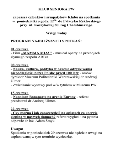 KLUB SENIORA PW zaprasza członków i sympatyków Klubu na spotkania w poniedziałki o godz. 1200 do Pałacyku Rektorskiego przy ul. Koszykowej 80, róg Chałubińskiego. Wstęp wolny PROGRAM NAJBLIŻSZYCH SPOTKAŃ: 01 czerwca - Film „MAMMA MIA! ” - musical oparty na przebojach słynnego zespołu ABBA. 08 czerwca - Nauka, kultura, polityka w okresie odzyskiwania niepodległości przez Polskę przed 100 laty - omówi dyrektor Muzeum Politechniki Warszawskiej dr Andrzej Ulmer. - Zwiedzanie wystawy pod w/w tytułem w Muzeum PW. 15 czerwca - Napoleon Bonaparte na arenie Europy - referat przedstawi dr Andrzej Ulmer. 22 czerwca - Czy można i jak zaoszczędzić na opłatach za energię cieplną w naszych domach? referat wygłosi i na pytania odpowie dr inż. Adam Smyk. Uwaga: Spotkania w poniedziałek 29 czerwca nie będzie z uwagi na zaplanowaną w tym terminie wycieczkę.