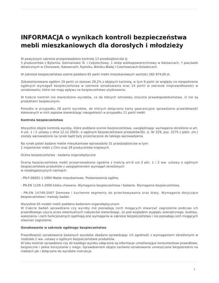 INFORMACJA o wynikach kontroli bezpieczeństwa mebli mieszkaniowych dla dorosłych i młodzieży W powyższym zakresie przeprowadzono kontrolę 13 przedsiębiorców tj: 5 producentów z Bytomia, Siemianowic Śl .i Częstochowy, 1 sklep wielkopowierzchniowy w Katowicach, 7 placówek detalicznych w Chorzowie, Katowicach, Rybniku, Bielsku-Białej i Czechowicach-Dziedzicach. W zakresie bezpieczeństwa ocenie poddano 65 partii mebli mieszkaniowych wartości 282 874,00 zł. Zakwestionowano ogółem 19 partii co stanowi 29,2% z objętych kontrolą, w tym 9 partii ze względu na niespełnienie ogólnych wymagań bezpieczeństwa w zakresie oznakowania oraz 14 partii w zakresie nieprawidłowości w oznakowaniu, które nie mają wpływu na bezpieczeństwo użytkowania. W trakcie kontroli nie stwierdzono wyrobów, co do których istniałoby znaczne prawdopodobieństwo, iż nie są produktami bezpiecznymi. Ponadto w przypadku 28 partii wyrobów, do których dołączono karty gwarancyjne sprawdzono prawidłowość dokonanych w nich zapisów stwierdzając niezgodności w przypadku 11 partii mebli. Kontrola bezpieczeństwa Wszystkie objęte kontrolą wyroby, które poddano ocenie bezpieczeństwa, uwzględniając wymagania określone w art. 4 ust. 1 i 2 ustawy z dnia 12.12.2003r. o ogólnym bezpieczeństwie produktów(Dz. U. Nr 229, poz. 2275 z późn. zm.) zostały wprowadzone na rynek bądź były przeznaczone do takiego wprowadzenia. Na rynek polski badane meble mieszkaniowe wprowadziło 31 przedsiębiorców w tym: 2 importerów mebli z Chin oraz 29 producentów krajowych. Ocena bezpieczeństwa - badania organoleptyczne Ocenę bezpieczeństwa mebli przeprowadzono zgodnie z treścią art.6 ust.3 pkt. 1 i 2 ww. ustawy o ogólnym bezpieczeństwie produktów z uwzględnieniem wymagań określonych w nieobligatoryjnych normach: - PN-F-06001-1:1994 Meble mieszkaniowe. Postanowienia ogólne, - PN-EN 1129-1:2000 Łóżka chowane. Wymagania bezpieczeństwa i badanie. Wymagania bezpieczeństwa, - PN-EN 14749:2007 Domowe i kuchenne segmenty do przechowywania oraz blaty. Wymagania dotyczące bezpieczeństwa i metody badań. Wszystkie 65 modeli mebli poddano badaniom organoleptycznym. W trakcie badań sprawdzano czy wyroby nie posiadają cech mogących stwarzać zagrożenie podczas ich prawidłowego użycia przez ewentualnych nabywców stwierdzając, że pod względem wyglądu zewnętrznego, budowy, wykonania i cech funkcjonalnych spełniają one wymagania w zakresie bezpieczeństwa i nie posiadają cech mogących stwarzać zagrożenie. Oznakowanie w zakresie ogólnego bezpieczeństwa Prawidłowość oznakowania badanych wyrobów zbadano sprawdzając ich zgodność z wymaganiami określonymi w rozdziale 2 ww. ustawy o ogólnym bezpieczeństwie produktów. W toku kontroli sprawdzono czy do każdego wyrobu załączone są informacje umożliwiające konsumentowi prawidłowe, bezpieczne i pełne korzystanie z niego. Sprawdzeniem objęto zarówno oznakowanie umieszczone bezpośrednio na meblach jak i dołączane do wyrobów instrukcje. 1 W przypadku 9 partii mebli stwierdzono brak instrukcji warunkujących bezpieczne użytkowanie tj. informacji, że meble należy użytkować zgodnie z przeznaczeniem, wskazówek dotyczących ustawienia, wypoziomowania i przenoszenia, opisu konserwacji i pielęgnacji). Pozostałe meble zaopatrzone zostały w informacje sporządzone w języku polskim umożliwiające konsumentom prawidłowe, bezpieczne i pełne korzystanie z produktu, zawierające m.in. instrukcje montażu, w przypadku mebli demontowanych, informacje o potencjalnych zagrożeniach, instrukcję dotyczącą użytkowania i konserwacji oraz podstawowe wymiary użytkowe. Wszyscy przedsiębiorcy, którzy oferowali kwestionowane wyroby do sprzedaży dokonali poprawy ich oznaczeń już w trakcie kontroli. Sprawdzenie zgodności oznakowania Wszystkie 65 partii badanych mebli objęto sprawdzeniem prawidłowości oznakowania na zgodność z wymaganiami określonymi w przepisach: - art. 20 ustawy z dnia 2 lipca 2004 r. o swobodzie działalności gospodarczej (tekst jednolity: Dz. U. z 2007r. Nr 155, poz. 1095 ze zm.), - art. 7 i 7a ustawy z dnia 7 października 1999 r. o języku polskim (Dz. U. Nr 90, poz. 999 ze zm.), Nieprawidłowości stwierdzono w przypadku 14 partii wyrobów, dotyczyły one naruszenia wymagań określonych w art. 20 ww. ustawy o swobodzie działalności gospodarczej z uwagi na brak w oznakowaniu: 7 partii - informacji umożliwiających identyfikację towaru oraz określających firmę i adres przedsiębiorcy wprowadzającego wyrób do obrotu na terenie Polski, 7 partii - informacji określających firmę i adres przedsiębiorcy wprowadzającego wyrób do obrotu na terenie Polski. Przedsiębiorców, którzy oferowali kwestionowane wyroby do sprzedaży ukarano mandatami karnymi na łączną kwotę 1300 zł za popełnienie wykroczenia z art. 136§2 KW. Sprzedawcy dokonali poprawy oznaczeń w trakcie kontroli, natomiast do producentów wystosowano wystąpienia pokontrolne. Dołączania do wyrobów kart gwarancyjnych Karty gwarancyjne dołączono do 28 partii mebli. Dokumenty gwarancyjne sprawdzono pod kątem zgodności zawartych zapisów z wymaganiami art. 13 oraz art. 3 ust.1 ustawy z dnia 27 lipca 2002r. o szczególnych warunkach sprzedaży konsumenckiej oraz zmianie Kodeksu cywilnego (Dz. U. Nr 141, poz.1176 ze zm.). Nieprawidłowości stwierdzono w przypadku kart gwarancyjnych wystawionych dla 11 wyrobów i dotyczyły naruszenia wymagań zawartych w art. 13 ust. 4 ww. ustawy z uwagi na brak: -określenia terytorialnego zasięgu ochrony gwarancyjnej oraz stwierdzenia, że: "gwarancja na sprzedany towar konsumpcyjny nie wyłącza, nie ogranicza ani nie zawiesza uprawnień kupującego wynikających z niezgodności towaru z umową" , - pełnej nazwy oraz adresu gwaranta Podsumowując wyniki kontroli należy zauważyć, że rozmiar ujawnionych nieprawidłowości jest analogiczny do ustaleń kontrolnych z 2008 roku. Ide