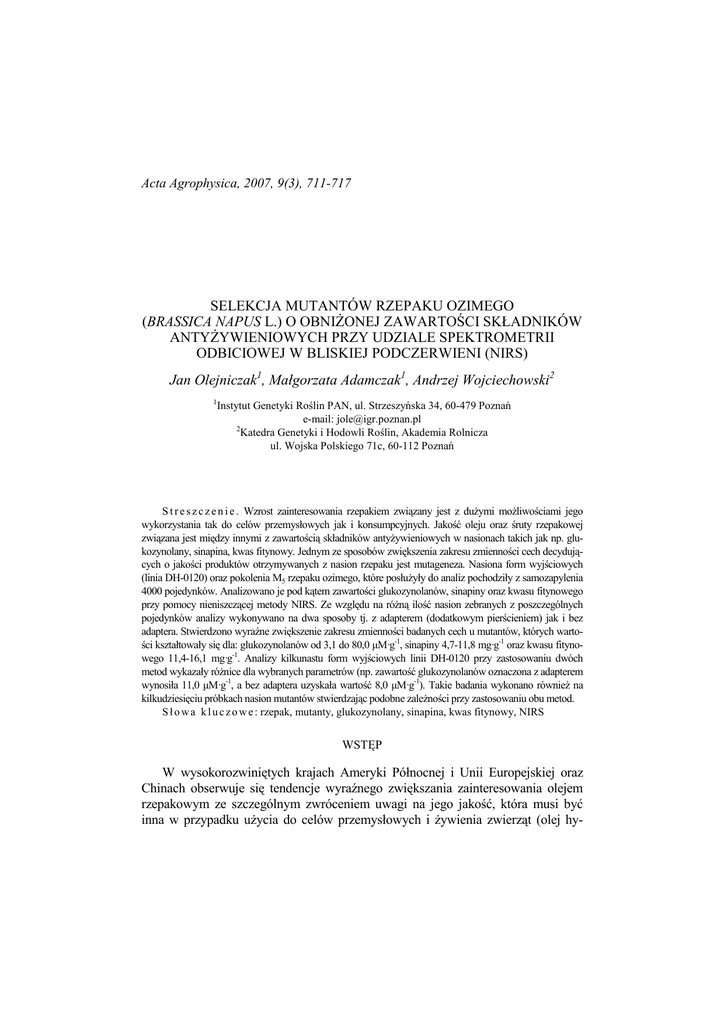 Acta Agrophysica, 2007, 9(3), 711-717 SELEKCJA MUTANTÓW RZEPAKU OZIMEGO (BRASSICA NAPUS L.) O OBNIśONEJ ZAWARTOŚCI SKŁADNIKÓW ANTYśYWIENIOWYCH PRZY UDZIALE SPEKTROMETRII ODBICIOWEJ W BLISKIEJ PODCZERWIENI (NIRS) Jan Olejniczak1, Małgorzata Adamczak1, Andrzej Wojciechowski2 1 Instytut Genetyki Roślin PAN, ul. Strzeszyńska 34, 60-479 Poznań e-mail: [email protected] 2 Katedra Genetyki i Hodowli Roślin, Akademia Rolnicza ul. Wojska Polskiego 71c, 60-112 Poznań S t r e s z c z e n i e . Wzrost zainteresowania rzepakiem związany jest z duŜymi moŜliwościami jego wykorzystania tak do celów przemysłowych jak i konsumpcyjnych. Jakość oleju oraz śruty rzepakowej związana jest między innymi z zawartością składników antyŜywieniowych w nasionach takich jak np. glukozynolany, sinapina, kwas fitynowy. Jednym ze sposobów zwiększenia zakresu zmienności cech decydujących o jakości produktów otrzymywanych z nasion rzepaku jest mutageneza. Nasiona form wyjściowych (linia DH-0120) oraz pokolenia M5 rzepaku ozimego, które posłuŜyły do analiz pochodziły z samozapylenia 4000 pojedynków. Analizowano je pod kątem zawartości glukozynolanów, sinapiny oraz kwasu fitynowego przy pomocy nieniszczącej metody NIRS. Ze względu na róŜną ilość nasion zebranych z poszczególnych pojedynków analizy wykonywano na dwa sposoby tj. z adapterem (dodatkowym pierścieniem) jak i bez adaptera. Stwierdzono wyraźne zwiększenie zakresu zmienności badanych cech u mutantów, których wartości kształtowały się dla: glukozynolanów od 3,1 do 80,0 µM·g-1, sinapiny 4,7-11,8 mg·g-1 oraz kwasu fitynowego 11,4-16,1 mg·g-1. Analizy kilkunastu form wyjściowych linii DH-0120 przy zastosowaniu dwóch metod wykazały róŜnice dla wybranych parametrów (np. zawartość glukozynolanów oznaczona z adapterem wynosiła 11,0 µM·g-1, a bez adaptera uzyskała wartość 8,0 µM·g-1). Takie badania wykonano równieŜ na kilkudziesięciu próbkach nasion mutantów stwierdzając podobne zaleŜności przy zastosowaniu obu metod. S ł o w a k l u c z o w e : rzepak, mutanty, glukozynolany, sinapina, kwas fitynowy, NIRS WSTĘP W wysokorozwiniętych krajach Ameryki Północnej i Unii Europejskiej oraz Chinach obserwuje się tendencje wyraźnego zwiększania zainteresowania olejem rzepakowym ze szczególnym zwróceniem uwagi na jego jakość, która musi być inna w przypadku uŜycia do celów przemysłowych i Ŝywienia zwierząt (olej hy- 712 J. OLEJNICZAK i in. drauliczny, biopaliwo, śruta rzepakowa), a inna do celów konsumpcyjnych (Jourden i in., 1996, Wojciechowski i Olejniczak, 1997). Wartość pokarmowa i przemysłowa nasion rzepaku zaleŜy od zawartości oleju, białka i składników antyŜywieniowych (glukozynolany, sinapina i kwas fitynowy) (Naczk i in.,1998) oraz spektrum kwasów tłuszczowych. Optymalna zawartość glukozynolanów w nasionach, przyjmowana za nieszkodliwą u obecnie uprawianych odmian rzepaku kształtuje się w zakresie od 10-20 µM·g-1. Od kilku lat obserwuje się zwiększenie zainteresowania obniŜaniem zawartości sinapiny (Wojciechowski i in., 1994, Velasco i Möllers, 1998, zum Felde, 2005), która obniŜa wartość paszową śruty rzepakowej. Wraz z przewidywanym w przyszłości zwiększeniem powierzchni uprawy rzepaku ozimego w Polsce nawet do około 1,2-1,5 mln. hektarów głównie dla produkcji proekologicznego źródła energii (biopaliwo), powstanie równieŜ problem zagospodarowania wartościowej śruty rzepakowej, która moŜe być alternatywnym, w stosunku do soi źródłem białka w Ŝywieniu zwierząt. W obrębie rodzaju Brassica istnieje duŜa zmienność zawartości sinapiny a tym samym stwarza to moŜliwość selekcji form o obniŜonej zawartości tego składnika (Syed i in., 1993, zum Felde, 2005). Zmienność tą moŜna jeszcze zwiększyć na drodze mutagenezy, podobnie jak to miało miejsce w przypadku zmiany składu kwasów tłuszczowych (Röbbelen 1990). Skutecznośë mutagenezy w modyfikowaniu zawartości składników antyŜywieniowych jest w literaturze stosunkowo słabo udokumentowana (Olejniczak i in., 2003). Potrzeba obniŜenia zawartości sinapiny w śrucie rzepakowej wiąŜe się przede wszystkim z tym, Ŝe kury znoszące jaja o brązowej barwie skorupy nie posiadają enzymu rozkładającego sinapinę i w przypadku ich skarmiania śrutą tradycyjną skutkuje rybim odorem jaj (Wojciechowski i in. 1994). Kwas fitynowy w nasionach rzepaku wiąŜe makro- i mikroelementy (Ca, K, P Cu Zn, Mn i Fe), które są niezbędne do wzrostu i rozwoju roślin, a szczególnie do kiełkowania nasion. Są jednak niepoŜądane ze względów ekologicznych, poniewaŜ są nieprzyswajalne przez zwierzęta za wyjątkiem przeŜuwaczy i przyczyniają się do zanieczyszczenia środowiska (Lott i in., 2000, Raboy, 2001). W wielu pracach donoszono o moŜliwości obniŜenia zawartości kwasu fitynowego przy udziale mutagenezy u jęczmienia jarego, kukurydzy i ryŜu (Larson i in., 1998, 2000, Raboy i in., 1999). Przy czym uwaŜa się, Ŝe metoda spektrometrii odbiciowej w bliskiej podczerwieni (NIRS) pozwala szybko i sprawnie analizować próbki nasion z duŜych populacji roślin bez ich uszkodzenia. Celem pracy była ocena zawartości składników antyŜywieniowych w nasionach form wyjściowych i mutantów pokolenia M5. Analizy wykonano metodą NIRS z zastosowaniem adaptera i bez adapteru, po róŜnym czasie przechowywania nasion rzepaku. SELEKCJA MUTANTÓW RZEPAKU OZIMEGO 713 MATERIAŁ I METODY Materiał badawczy stanowiła populacja mutantów pokolenia M5 otrzymana w wyniku traktowania linii DH-0120 dwoma mutagenami chemicznymi: N-nitrozoN-metylo-mocznikiem (MNU) i azydkiem sodu (AS) o koncentracji 1,5 i 2,5 mM przez 3 godziny. Linię wyjściową DH 0-120 otrzymano kilkanaście lat temu z Zakładu Roślin Oleistych, IHAR Poznań, na której prowadzono hodowlę zachowawczą. Analizy biochemiczne wykonano przy uŜyciu spektrometru (NIRS, model 6500 NIR Inc., Silversprin