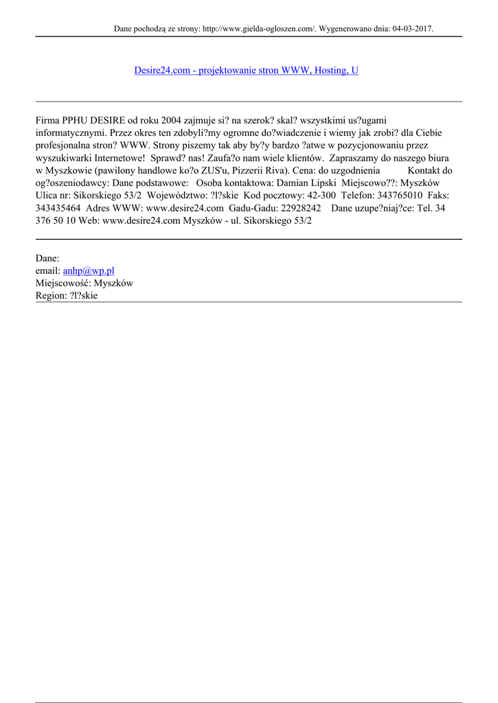 Dane pochodzą ze strony: http://www.gielda-ogloszen.com/. Wygenerowano dnia: 04-03-2017. Desire24.com - projektowanie stron WWW, Hosting, U Firma PPHU DESIRE od roku 2004 zajmuje si? na szerok? skal? wszystkimi us?ugami informatycznymi. Przez okres ten zdobyli?my ogromne do?wiadczenie i wiemy jak zrobi? dla Ciebie profesjonalna stron? WWW. Strony piszemy tak aby by?y bardzo ?atwe w pozycjonowaniu przez wyszukiwarki Internetowe! Sprawd? nas! Zaufa?o nam wiele klientów. Zapraszamy do naszego biura w Myszkowie (pawilony handlowe ko?o ZUS'u, Pizzerii Riva). Cena: do uzgodnienia Kontakt do og?oszeniodawcy: Dane podstawowe: Osoba kontaktowa: Damian Lipski Miejscowo??: Myszków Ulica nr: Sikorskiego 53/2 Województwo: ?l?skie Kod pocztowy: 42-300 Telefon: 343765010 Faks: 343435464 Adres WWW: www.desire24.com Gadu-Gadu: 22928242 Dane uzupe?niaj?ce: Tel. 34 376 50 10 Web: www.desire24.com Myszków - ul. Sikorskiego 53/2 Dane: email: [email protected] Miejscowość: Myszków Region: ?l?skie