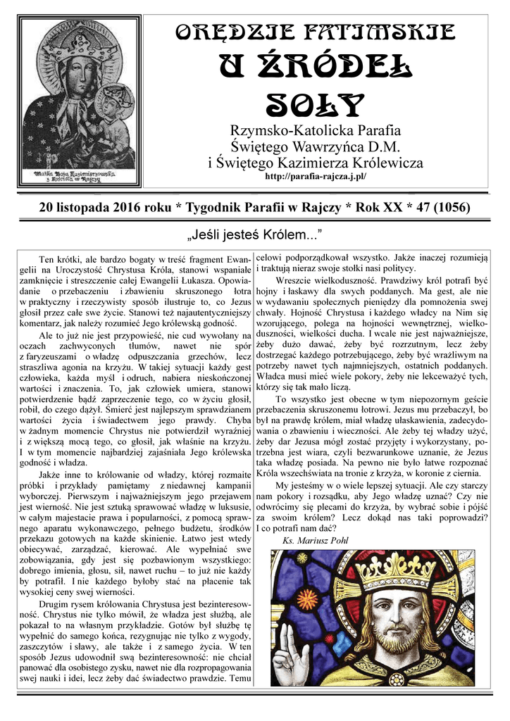 ORĘDZIE FATIMSKIE U ŹRÓDEŁ SOŁY Rzymsko-Katolicka Parafia Świętego Wawrzyńca D.M. i Świętego Kazimierza Królewicza http://parafia-rajcza.j.pl/ 20 listopada 2016 roku * Tygodnik Parafii w Rajczy * Rok XX * 47 (1056) „Jeśli jesteś Królem...” Ten krótki, ale bardzo bogaty w treść fragment Ewangelii na Uroczystość Chrystusa Króla, stanowi wspaniałe zamknięcie i streszczenie całej Ewangelii Łukasza. Opowiadanie o przebaczeniu i zbawieniu skruszonego łotra w praktyczny i rzeczywisty sposób ilustruje to, co Jezus głosił przez całe swe życie. Stanowi też najautentyczniejszy komentarz, jak należy rozumieć Jego królewską godność. Ale to już nie jest przypowieść, nie cud wywołany na oczach zachwyconych tłumów, nawet nie spór z faryzeuszami o władzę odpuszczania grzechów, lecz straszliwa agonia na krzyżu. W takiej sytuacji każdy gest człowieka, każda myśl i odruch, nabiera nieskończonej wartości i znaczenia. To, jak człowiek umiera, stanowi potwierdzenie bądź zaprzeczenie tego, co w życiu głosił, robił, do czego dążył. Śmierć jest najlepszym sprawdzianem wartości życia i świadectwem jego prawdy. Chyba w żadnym momencie Chrystus nie potwierdził wyraźniej i z większą mocą tego, co głosił, jak właśnie na krzyżu. I w tym momencie najbardziej zajaśniała Jego królewska godność i władza. Jakże inne to królowanie od władzy, której rozmaite próbki i przykłady pamiętamy z niedawnej kampanii wyborczej. Pierwszym i najważniejszym jego przejawem jest wierność. Nie jest sztuką sprawować władzę w luksusie, w całym majestacie prawa i popularności, z pomocą sprawnego aparatu wykonawczego, pełnego budżetu, środków przekazu gotowych na każde skinienie. Łatwo jest wtedy obiecywać, zarządzać, kierować. Ale wypełniać swe zobowiązania, gdy jest się pozbawionym wszystkiego: dobrego imienia, głosu, sił, nawet ruchu – to już nie każdy by potrafił. I nie każdego byłoby stać na płacenie tak wysokiej ceny swej wierności. Drugim rysem królowania Chrystusa jest bezinteresowność. Chrystus nie tylko mówił, że władza jest służbą, ale pokazał to na własnym przykładzie. Gotów był służbę tę wypełnić do samego końca, rezygnując nie tylko z wygody, zaszczytów i sławy, ale także i z samego życia. W ten sposób Jezus udowodnił swą bezinteresowność: nie chciał panować dla osobistego zysku, nawet nie dla rozpropagowania swej nauki i idei, lecz żeby dać świadectwo prawdzie. Temu celowi podporządkował wszystko. Jakże inaczej rozumieją i traktują nieraz swoje stołki nasi politycy. Wreszcie wielkoduszność. Prawdziwy król potrafi być hojny i łaskawy dla swych poddanych. Ma gest, ale nie w wydawaniu społecznych pieniędzy dla pomnożenia swej chwały. Hojność Chrystusa i każdego władcy na Nim się wzorującego, polega na hojności wewnętrznej, wielkoduszności, wielkości ducha. I wcale nie jest najważniejsze, żeby dużo dawać, żeby być rozrzutnym, lecz żeby dostrzegać każdego potrzebującego, żeby być wrażliwym na potrzeby nawet tych najmniejszych, ostatnich poddanych. Władca musi mieć wiele pokory, żeby nie lekceważyć tych, którzy się tak mało liczą. To wszystko jest obecne w tym niepozornym geście przebaczenia skruszonemu łotrowi. Jezus mu przebaczył, bo był na prawdę królem, miał władzę ułaskawienia, zadecydowania o zbawieniu i wieczności. Ale żeby tej władzy użyć, żeby dar Jezusa mógł zostać przyjęty i wykorzystany, potrzebna jest wiara, czyli bezwarunkowe uznanie, że Jezus taka władzę posiada. Na pewno nie było łatwe rozpoznać Króla wszechświata na tronie z krzyża, w koronie z ciernia. My jesteśmy w o wiele lepszej sytuacji. Ale czy starczy nam pokory i rozsądku, aby Jego władzę uznać? Czy nie odwrócimy się plecami do krzyża, by wybrać sobie i pójść za swoim królem? Lecz dokąd nas taki poprowadzi? I co potrafi nam dać? Ks. Mariusz Pohl 20 listopada 2016 roku ORĘDZIE FATIMSKIE U ŹRÓDEŁ SOŁY Od kłamstwa do przemocy Kłamstwo przybiera dziś różne postaci, dlatego odnosi się wrażenie, że jest ono obecne wszędzie. Przyjmuje się np., że sama manipulacja jest już „kłamstwem zorganizowanym”. Jednocześnie głoszony jest pogląd, że kłamstwo stało się metodą stosowaną w polityce. Mówi się też coraz powszechniej, że ponieważ kłamstwo bywa coraz bardziej skuteczne, należy stwierdzić, iż możemy mieć do czynienia z „przemysłem zakłamania”. Kłamstwo to więcej niż negacja prawdy Katechizm Kościoła Katolickiego wymienia różnorakie wykroczenia przeciwko prawdzie. Począwszy od krzywoprzysięstwa i dawania fałszywego świadectwa, poprzez wydawanie pochopnych sądów o bliźnich, obmowy i oszczerstwa, a skończywszy na pochlebstwie i chełpliwości. Jednakże szczególnie niebezpieczne są kłamstwa wypowiadane publicznie, np. w radio czy telewizji pod adresem przeciwnika politycznego. Żeby go ośmieszyć i spostponować w oczach opinii publicznej, stosuje się bardzo poważne zarzuty, zwłaszcza natury moralnej. Często mają one charakter pomówień. Papież Franciszek w orędziu na Dzień Środków Społecznego Przekazu w 2014 roku stwierdził, że dwa groźne zjawiska występujące w mediach utrudniają rozwój ich odbiorcy. Są to dezinformacja prowadząca do dezorientacji czytelnika, słuchacza czy telewidza oraz stosowanie manipulacji ludźmi, którą Papież nazwał „brutalną agresją wobec jednostki i społeczeństwa”. Tytuł niniejszego tekstu sugeruje wprost, że kłamstwo może prowadzić do działania opartego na przemocy. Dziś na Zachodzie Europy można znaleźć publikacje mające już w swoim tytule tezę, że pewne postaci kłamstwa prowadzą do przemocy. To niewątpliwie skutki pewnych mechanizmów w psychice człowieka, które są uruchamiane wskutek kłamstwa wypowiadanego i powtarzanego przez jego adwersarza. Mechanizm eskalacji wywoła