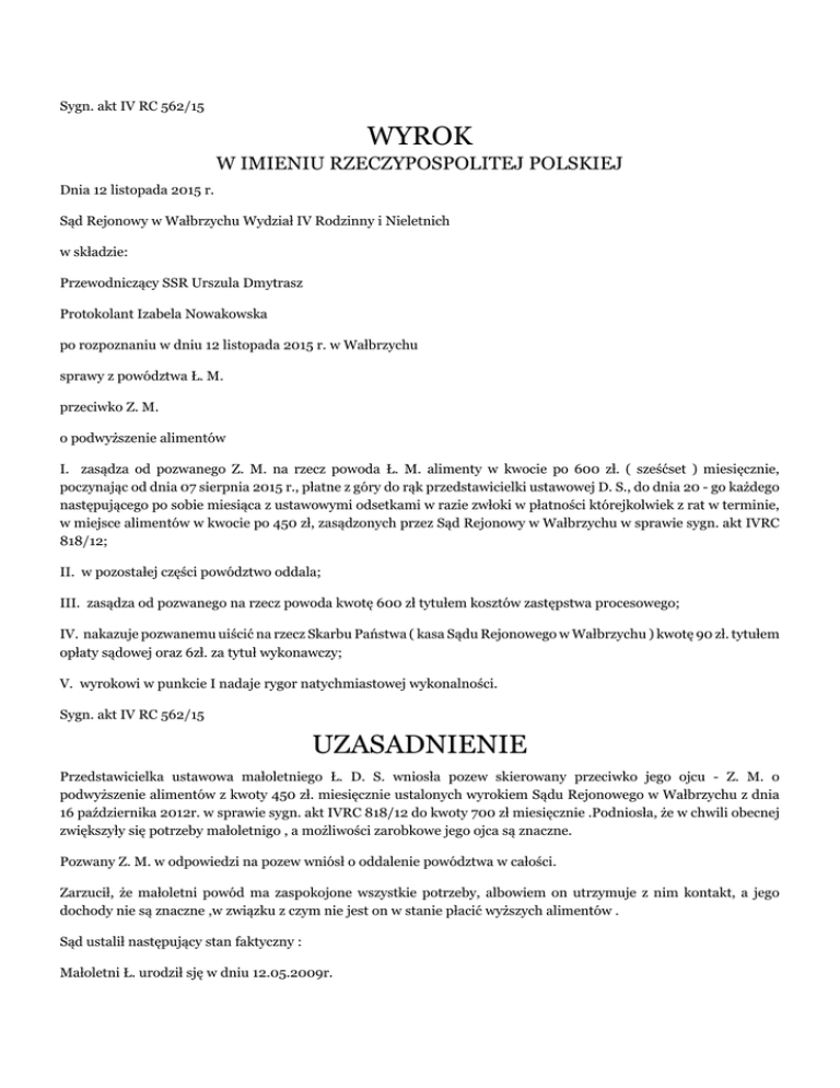 Sygn. akt IV RC 562/15 WYROK W IMIENIU RZECZYPOSPOLITEJ POLSKIEJ Dnia 12 listopada 2015 r. Sąd Rejonowy w Wałbrzychu Wydział IV Rodzinny i Nieletnich w składzie: Przewodniczący SSR Urszula Dmytrasz Protokolant Izabela Nowakowska po rozpoznaniu w dniu 12 listopada 2015 r. w Wałbrzychu sprawy z powództwa Ł. M. przeciwko Z. M. o podwyższenie alimentów I. zasądza od pozwanego Z. M. na rzecz powoda Ł. M. alimenty w kwocie po 600 zł. ( sześćset ) miesięcznie, poczynając od dnia 07 sierpnia 2015 r., płatne z góry do rąk przedstawicielki ustawowej D. S., do dnia 20 - go każdego następującego po sobie miesiąca z ustawowymi odsetkami w razie zwłoki w płatności którejkolwiek z rat w terminie, w miejsce alimentów w kwocie po 450 zł, zasądzonych przez Sąd Rejonowy w Wałbrzychu w sprawie sygn. akt IVRC 818/12; II. w pozostałej części powództwo oddala; III. zasądza od pozwanego na rzecz powoda kwotę 600 zł tytułem kosztów zastępstwa procesowego; IV. nakazuje pozwanemu uiścić na rzecz Skarbu Państwa ( kasa Sądu Rejonowego w Wałbrzychu ) kwotę 90 zł. tytułem opłaty sądowej oraz 6zł. za tytuł wykonawczy; V. wyrokowi w punkcie I nadaje rygor natychmiastowej wykonalności. Sygn. akt IV RC 562/15 UZASADNIENIE Przedstawicielka ustawowa małoletniego Ł. D. S. wniosła pozew skierowany przeciwko jego ojcu - Z. M. o podwyższenie alimentów z kwoty 450 zł. miesięcznie ustalonych wyrokiem Sądu Rejonowego w Wałbrzychu z dnia 16 października 2012r. w sprawie sygn. akt IVRC 818/12 do kwoty 700 zł miesięcznie .Podniosła, że w chwili obecnej zwiększyły się potrzeby małoletnigo , a możliwości zarobkowe jego ojca są znaczne. Pozwany Z. M. w odpowiedzi na pozew wniósł o oddalenie powództwa w całości. Zarzucił, że małoletni powód ma zaspokojone wszystkie potrzeby, albowiem on utrzymuje z nim kontakt, a jego dochody nie są znaczne ,w związku z czym nie jest on w stanie płacić wyższych alimentów . Sąd ustalił następujący stan faktyczny : Małoletni Ł. urodził sję w dniu 12.05.2009r. Wyrokiem z dnia 16 października 2012r. orzeczono alimenty na rzecz małol. Ł. w kwocie 450 zł. miesięcznie. W tym czasie jego matka zarabiała około 950 zł. netto. Pozwany, który jest rolnikiem posiadał gospodarstwo rolne o obszarze 10,8 h przeliczeniowego, z którego osiągał dochód roczny w wysokości około 24000zł. M.. Ł. miał 3,5 roku. Mieszkał z matką i uczęszczał do przedszkola . Dowód :akta Sądu Rejonowego w Wałbrzychu –sygn. IVRC 818/12 Obecnie małoletni powód ma 6 lat .Uczęszcza do klasy O szkoły podstawowej. Mieszka z matką oraz przyrodnim bratem w wieku 19 lat oraz babcią, która wymaga stałego leczenia. Jego matka otrzymała mieszkanie komunalne za który płaci miesięczny czynsz w kwocie 600 zł. Ponadto opłaca media -za energię elektryczną 260 zł. co dwa miesiące, za wodę 370 zł co dwa miesiące. D. S. określiła koszt utrzymania syna na kwotę 700-800 zł. miesięcznie. Zeznała , że pozwany poza alimentami nie przekazuje synowi żadnych dodatkowych pieniędzy. Małoletni Ł. przebywa u ojca 3 dni w miesiącu oraz w czasie wakacji letnich i ferii zimowych. Dowód: zaświadczenia o dochodach matki powoda k.15,35-36 przesłuchanie D. S. k.17-18 zaświadczenia o stanie zdrowia E. R. k.16 Pozwany mieszka z matką. W dalszym ciągu prowadzi gospodarstwo rolne o tym samym areale jak w latach poprzednich, z tym , że w ubiegłym roku osiągnął –jak sam podał-dochód w wysokości 29.081,16 zł. Spłaca kredyt obrotowy. Jest właścicielem budynku mieszkalnego i gospodarczego oraz samochodu marki (...)-rocznik 1992. Mieszka z matką, która otrzymuje rentę w kwocie 800 zł. miesięcznie. Poza małol. Ł. nie ma nikogo na utrzymaniu. W bieżącym roku kupił synowi adidasy. Dowód: zaświadczenia o dochodach pozwanego k. 21,26-28 przesłuchanie pozwanego k.18 Sąd zważył co następuje : Powództwo małol. Ł. M. jest częściowo zasadne i w tej części znajduje oparcie w treści art. 138 krio. Zgodnie z art. 133§1 krio rodzice obowiązani są do świadczeń alimentacyjnych względem dziecka, które nie jest jeszcze w stanie utrzymać się samodzielnie . Zakres świadczeń alimentacyjnych , zgodnie z art. 135§1 krio zależy od usprawiedliwionych potrzeb uprawnionego oraz od zarobkowych i majątkowych możliwości zobowiązanego. Od czasu ustalenia alimentów w poprzedniej wysokości upłynęło kilka lat. Powszechnie wiadomo ,że w tym czasie wzrosły ceny artykułów rynkowych. Tak więc zwiększyły się koszty utrzymania powoda. Ponadto podjęcie przez niego nauki w szkole podstawowej również związane jest z dodatkowymi kosztami - takimi jak zakup wyprawki szkolnej, dodatkowej odzieży , zapewnienie posiłków w szkole itd… Z doświadczenia życiowego Sądowi wiadomo ,że kwota podana przez matkę powoda dotycząca miesięcznych kosztów jego utrzymania nie jest wygórowana . Pozwany utrzymuje kontakty z synem. Jednakże dotyczą one wakacji letnich i zimowych oraz 3 dni w miesiącu. Ponadto nie uczestniczy w kosztach utrzymania syna ponad kwotę ustaloną poprzednim wyrokiem. Dlatego też należy uznać, że w chwili obecnej w większości trud wychowania, a biorąc pod uwagę wysokość dotychczasowych alimentów, także utrzymania spoczywa na matce małoletniego powoda . Zapewnia ona również małoletniemu synowi lokal mieszkalny ,ponosząc stale rosnące koszty jego utrzymania. Tym bardziej , że jej zarobki nie są na tyle wysokie , że mogłyby pokryć usprawiedliwione potrzeby małoletniego syna. Z. M. obecnie osiągnął wyższy dochód . Jest właścicielem gospodarstwa rolnego i samochodu. Poza małoletnim powodem nie ma nikogo na utrzymaniu. Natomiast jego zobowiązania pieniężne w stosunku do osób trzecich nie mogą przesądzać o ustaleniu wysokości alimentów na rzecz powoda. Z przyczyn wyżej wskazanych uznał Sąd, iż Z. M. powinien łożyć na utrzymanie syna alimenty 