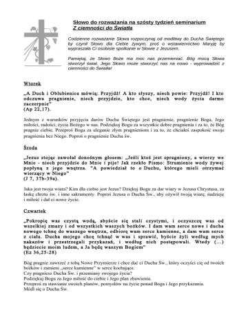 Słowo do rozważania na szósty tydzień seminarium Z ciemności do Światła Codzienne rozważanie Słowa rozpoczynaj od modlitwy do Ducha Świętego by czynił Słowo dla Ciebie żywym, proś o wstawiennictwo Maryję by wypraszała Ci osobiste spotkanie w Słowie z Jezusem. Pamiętaj, że Słowo Boże ma moc nas przemieniać. Bóg mocą Słowa stworzył świat. Jego Słowo może stworzyć nas na nowo - wyprowadzić z ciemności do Światła! Wtorek „A Duch i Oblubienica mówią: Przyjdź! A kto słyszy, niech powie: Przyjdź! I kto odczuwa pragnienie, niech przyjdzie, kto chce, niech wody życia darmo zaczerpnie” (Ap 22,17). Jednym z warunków przyjęcia darów Ducha Świętego jest pragnienie, pragnienie Boga, Jego miłości, radości, życia Bożego w nas. Podziękuj Bogu za wszystkie dobre pragnienia i za to, że Bóg pragnie ciebie. Przeproś Boga za uleganie złym pragnieniom i za to, że chciałeś zaspokoić swoje pragnienia bez Niego. Poproś o pragnienie Ducha św. Środa „Jezus stojąc zawołał donośnym głosem: „Jeśli ktoś jest spragniony, a wierzy we Mnie - niech przyjdzie do Mnie i pije! Jak rzekło Pismo: Strumienie wody żywej popłyną z jego wnętrza. ”A powiedział to o Duchu, którego mieli otrzymać wierzący w Niego” (J 7, 37b-39a). Jaka jest twoja wiara? Kim dla ciebie jest Jezus? Dziękuj Bogu za dar wiary w Jezusa Chrystusa, za łaskę chrztu św. i inne sakramenty. Poproś Jezusa o Ducha Św., aby ożywił twoją wiarę, nadzieję i miłość i dał ci nowe życie. Czwartek „Pokropię was czystą wodą, abyście się stali czystymi, i oczyszczę was od wszelkiej zmazy i od wszystkich waszych bożków. I dam wam serce nowe i ducha nowego tchnę do waszego wnętrza, odbiorę wam serce kamienne, a dam wam serce z ciała. Ducha mojego chcę tchnąć w was i sprawić, byście żyli według mych nakazów i przestrzegali przykazań, i według nich postępowali. Wtedy (…) będziecie moim ludem, a Ja będę waszym Bogiem” (Ez 36,25-28) Bóg pragnie zawrzeć z tobą Nowe Przymierze i chce dać ci Ducha Św., który oczyści cię od twoich bożków i zamieni „serce kamienne” w serce kochające. Czy pragniesz Ducha Św. i przemiany swojego życia? Podziękuj Bogu za Jego miłość do ciebie i Jego plan zbawienia. Przeproś za stawianie swoich planów, pomysłów na życie ponad Boga i Jego przykazania. Módl się o Ducha Św. Piątek „Zaprawdę, zaprawdę powiadam ci, jeśli się ktoś nie narodzi z wody i z Ducha nie może wejść do królestwa Bożego. To, co się z ciała narodziło, jest ciałem, a to, co się z Ducha narodziło, jest Duchem. Nie dziw się, że powiedziałem ci: Trzeba wam się powtórnie narodzić” (J3, 5-7) „A ci, którzy należą do Chrystusa Jezusa, ukrzyżowali ciało swoje z jego namiętnościami i pożądaniami. Mając życie od Ducha, do Ducha się też stosujmy. Nie szukajmy próżnej chwały, jedni drugich drażniąc i wzajemnie sobie zazdroszcząc”. (Ga 5,24-26) Uwielbiaj Jezusa w tajemnicy Jego męki, śmierci i zmartwychwstania. Poproś, aby Duch Św. dał ci moc przezwyciężania swoich wad; poproś o dar nowego życia w duchu miłości. Sobota „Lecz wy starajcie się o większe dary: a ja wam wskaże drogę jeszcze doskonalszą. Gdybym mówił językami ludzi i aniołów, a miłości bym nie miał, stałbym się jak miedź brzęcząca albo cymbał brzmiący.Gdybym też miał dar prorokowania i znał wszystkie tajemnice, i posiadał wszelką wiedzę, i wszelką wiarę, tak iżbym góry przenosił, a miłości bym nie miał, byłbym niczym. I gdybym rozdał na jałmużnę całą majętność moją, a ciało wystawił na spalenie, lecz miłości bym nie miał, nic bym nie zyskał. Miłość cierpliwa jest, łaskawa jest. Miłość nie zazdrości, nie szuka poklasku, nie unosi się pychą; nie dopuszcza się bezwstydu, nie szuka swego, nie unosi się gniewem, nie pamięta złego; nie cieszy się z niesprawiedliwości, lecz współweseli się z prawdą. Wszystko znosi, wszystkiemu wierzy, we wszystkim pokłada nadzieję, wszystko przetrzyma. Miłość nigdy nie ustaje (…) (1 Kor 12,31- 13,8a) Módl się o Ducha Świętego- Ducha Miłości Niedziela „Oto Ja ześlę na was obietnicę Ojca. Wy zaś pozostańcie w mieście, aż będziecie uzbrojeni mocą z wysoka” (Łk 24,49) „Wy wkrótce zostaniecie ochrzczeni Duchem Świętym” (Dz 1,5). „ Wszyscy oni trwali jednomyślnie na modlitwie razem z niewiastami, Maryją, Matką Jezusa, i braćmi Jego” (Dz 1,14) Podziękuj Bogu za dar Kościoła, zaproś Maryję- Matkę Jezusa i Oblubienicę Ducha Św., aby razem z tobą modliła się o dar Ducha Św. Poproś Ducha Św., aby był twoim Nauczycielem modlitwy, aby wprowadził cię we wspólnotę wierzących w Chrystusa. Poniedziałek „Kiedy nadszedł wreszcie dzień Pięćdziesiątnicy, znajdowali się wszyscy razem na tym samym miejscu. Nagle dał się słyszeć z nieba szum, jakby uderzenie Seminarium Wiary Z ciemności do Światła 13 stycznia – 3 marca 2014. Wspólnota Krzew Winny przy kościele O.O. Kapucynów, Kraków ul. Loretańska 11 gwałtownego wiatru, i napełnił cały dom, w którym przebywali. Ukazały się im też języki jakby z ognia, które się rozdzieliły, i na każdym z nich spoczął jeden. I wszyscy zostali napełnieni Duchem Świętym, i zaczęli mówić obcymi językami, tak jak im Duch pozwalał mówić.” (Dz 2, 1-4) Pascha Chrystusa wypełnia się przez wylanie Ducha Św., który zostaje objawiony, dany i udzielony jako Osoba Boska (KKK 731). Dzisiaj uwielbiaj Ducha Św. i pragnij otworzyć się na Jego obecność, na Jego sposób przychodzenia, na Jego niespodzianki. Effata! Proś o wiarę i wdzięczność serce za tak wielki dar- dar Ducha Św. Seminarium Wiary Z ciemności do Światła 13 stycznia – 3 marca 2014. Wspólnota Krzew Winny przy kościele O.O. Kapucynów, Kraków ul. Loretańska 11
