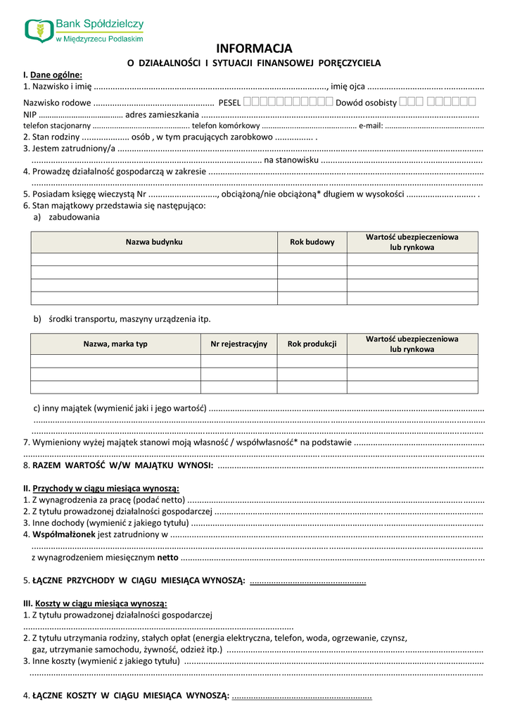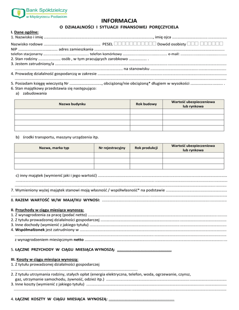 INFORMACJA O DZIAŁALNOŚCI I SYTUACJI FINANSOWEJ PORĘCZYCIELA I. Dane ogólne: 1. Nazwisko i imię .................................................................................................., imię ojca ................................................. Nazwisko rodowe ................................................... PESEL Dowód osobisty NIP ………………………………… adres zamieszkania ..................................................................................................................... telefon stacjonarny ............................................. telefon komórkowy ............................................ e-mail: .............................................. 2. Stan rodziny .................... osób , w tym pracujących zarobkowo ................ . 3. Jestem zatrudniony/a .......................................................................................................................................................... ................................................................................................. na stanowisku .................................................................... 4. Prowadzę działalność gospodarczą w zakresie .................................................................................................................... .............................................................................................................................................................................................. 5. Posiadam księgę wieczystą Nr ............................., obciążoną/nie obciążoną* długiem w wysokości ............................. . 6. Stan majątkowy przedstawia się następująco: a) zabudowania Nazwa budynku Rok budowy Wartość ubezpieczeniowa lub rynkowa Rok produkcji Wartość ubezpieczeniowa lub rynkowa b) środki transportu, maszyny urządzenia itp. Nazwa, marka typ Nr rejestracyjny c) inny majątek (wymienić jaki i jego wartość) .................................................................................................................... .............................................................................................................................................................................................. .............................................................................................................................................................................................. 7. Wymieniony wyżej majątek stanowi moją własność / współwłasność* na podstawie ....................................................... .................................................................................................................................................................................................. 8. RAZEM WARTOŚĆ W/W MAJĄTKU WYNOSI: ................................................................................................................ II. Przychody w ciągu miesiąca wynoszą: 1. Z wynagrodzenia za pracę (podać netto) ............................................................................................................................. 2. Z tytułu prowadzonej działalności gospodarczej ................................................................................................................. 3. Inne dochody (wymienić z jakiego tytułu) ........................................................................................................................... 4. Współmałżonek jest zatrudniony w .................................................................................................................................... .............................................................................................................................................................................................. z wynagrodzeniem miesięcznym netto ................................................................................................................................ 5. ŁĄCZNE PRZYCHODY W CIĄGU MIESIĄCA WYNOSZĄ: ................................................. III. Koszty w ciągu miesiąca wynoszą: 1. Z tytułu prowadzonej działalności gospodarczej .................................................................................................................. 2. Z tytułu utrzymania rodziny, stałych opłat (energia elektryczna, telefon, woda, ogrzewanie, czynsz, gaz, utrzymanie samochodu, żywność, odzież itp.) ............................................................................................................ 3. Inne koszty (wymienić z jakiego tytułu) .............................................................................................................................. ............................................................................................................................................................................................... 4. ŁĄCZNE KOSZTY W CIĄGU MIESIĄCA WYNOSZĄ: ........................................................... IV. Dochód netto wynosi ( łączne przychody minus łączne koszty ) = V. Dane o posiadanym zadłużeniu i zobowiązaniach: 1. Posiadam - nie posiadam* zadłużenie z tytułu zaciągniętych kredytów (podać nazwę banku, wysokość zadłużenia, termin spłaty) .................................................................................................................................................. ............................................................................................................................................................................................. ............................................................................................................................................................................................. 2. Posiadam – nie posiadam* zobowiązań wobec Urzędu Skarbowego, ZUS, Urzędu Gminy (
