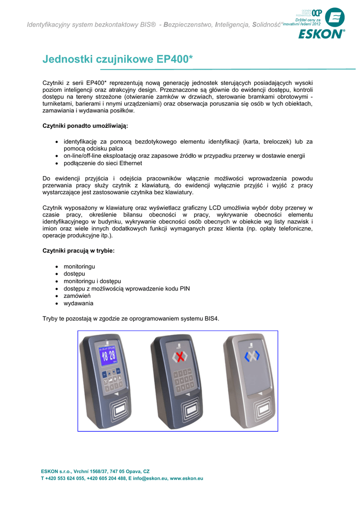 Identyfikacyjny system bezkontaktowy BIS® - Bezpieczenstwo, Inteligencja, Solidność“ Jednostki czujnikowe EP400* Czytniki z serii EP400* reprezentują nową generację jednostek sterujących posiadających wysoki poziom inteligencji oraz atrakcyjny design. Przeznaczone są głównie do ewidencji dostępu, kontroli dostępu na tereny strzeżone (otwieranie zamków w drzwiach, sterowanie bramkami obrotowymi turniketami, barierami i nnymi urządzeniami) oraz obserwacja poruszania się osób w tych obiektach, zamawiania i wydawania posiłków. Czytniki ponadto umożliwiają: identyfikację za pomocą bezdotykowego elementu identyfikacji (karta, breloczek) lub za pomocą odcisku palca on-line/off-line eksploatację oraz zapasowe źródło w przypadku przerwy w dostawie energii podłączenie do sieci Ethernet Do ewidencji przyjścia i odejścia pracowników włącznie możliwości wprowadzenia powodu przerwania pracy służy czytnik z klawiaturą, do ewidencji wyłącznie przyjść i wyjść z pracy wystarczające jest zastosowanie czytnika bez klawiatury. Czytnik wyposażony w klawiaturę oraz wyświetlacz graficzny LCD umożliwia wybór doby przerwy w czasie pracy, określenie bilansu obecności w pracy, wykrywanie obecności elementu identyfikacyjnego w budynku, wykrywanie obecności osób obecnych w obiekcie wg listy nazwisk i imion oraz wiele innych dodatkowych funkcji wymaganych przez klienta (np. opłaty telefoniczne, operacje produkcyjne itp.). Czytniki pracują w trybie: monitoringu dostępu monitoringu i dostępu dostępu z możliwością wprowadzenie kodu PIN zamówień wydawania Tryby te pozostają w zgodzie ze oprogramowaniem systemu BIS4. ESKON s.r.o., Vrchní 1568/37, 747 05 Opava, CZ T +420 553 624 055, +420 605 204 488, E [email protected], www.eskon.eu Identyfikacyjny system bezkontaktowy BIS® - Bezpieczenstwo, Inteligencja, Solidność“ Jednostki czujnikowe EP400* Parametry techniczne: Właściwości Napięcie zasilania Zabezpieczenie Wymiary Zakres temperatury eksploatacyjnej Identyfikacja Wartość techniczna 13,7V=/maks.370mA IP 40 (na żądanie IP 43) 215 x 125 x 75mm -25°C - +55°C UNIQUE, MIFARE, DESFIRE (HITAG1 i 2, I-Code, MOTOROLA, HID, LEGIC ,Biometria – nie wchodzi w skład standardowej dostawy) 125kHz, 13.56MHz wg zastosowanej technologii RS485, RS232, TCP/IP 2-15cm wg zastosowanej technologii Niebieski graficzny LCD 128 x 64 punkty, podświetlany do 1MB rozszerzona przez RAM do archiwizacji danych Częstotliwość Komunikacja Zakres Wyświetlacz Pojemność pamięci Doba archiwizacji danych 6 miesięcy RAM Stabilność zegara 100ppm przy +20°C wewnętrznego Maks. 5 x przekaźnik i maks. 3 x kolektor otwarty(maks. 24V, 50mA, Ilość wyjść 0.25W) 250V~/8A otwarty/zamknięty bez potencjału/z potencjałem Kontakt przekaźnika 1 12V=/maks.400mA Kontakt przekaźnika 2-5 100V~/1A Otwarty/zamknięty bez potencjału Ilość wejść maks. 3, 3 x oddzielone galwanicznie numer karty wg normy WIEGAND dla Elektronicznych Systemu Alternatywne wyjście Bezpieczeństwa możliwość podłączenie elementu Elektronicznych Systemu Alternatywne wejście Bezpieczeństwa ESKON s.r.o., Vrchní 1568/37, 747 05 Opava, CZ T +420 553 624 055, +420 605 204 488, E [email protected], www.eskon.eu