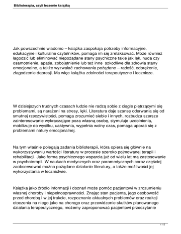 Biblioterapia, czyli leczenie książką Jak powszechnie wiadomo – książka zaspokaja potrzeby informacyjne, edukacyjne i kulturalne czytelników, pomaga im się zrelaksować. Może również łagodzić lub eliminować niepożądane stany psychiczne takie jak lęk, nuda czy osamotnienie, apatia, zobojętnienie lub też inne szkodliwe dla zdrowia stany emocjonalne, a także wyzwalać zachowania pożądane – radość, odprężenie, złagodzenie depresji. Ma więc książka zdolności terapeutyczne i lecznicze. W dzisiejszych trudnych czasach ludzie nie radzą sobie z ciągle piętrzącymi się problemami, są narażeni na stresy, lęki. Literatura daje szansę oderwania się od smutnej rzeczywistości, pomaga zrozumieć siebie i innych, rozbudza szersze zainteresowanie wykraczające poza własną osobę, stymuluje uzdolnienia, mobilizuje do wysiłku, uaktywnia, wypełnia wolny czas, pomaga uporać się z problemami natury emocjonalnej. Na tym właśnie polegają zadania biblioterapii, która opiera się głównie na wykorzystywaniu wartości literatury w procesie szeroko pojmowanej terapii i rehabilitacji. Jako forma psychicznego wsparcia już od wielu lat ma zastosowanie w psychoterapii. W naukach medycznych oraz paramedycznych coraz częściej zaobserwować można pożądane działanie literatury, a także możliwości jej wykorzystania w lecznictwie. Książka jako źródło informacji i doznań może pomóc pacjentowi w zrozumieniu własnej choroby i niepełnosprawności. Znając stan pacjenta, jego osobowość przed chorobą i w jej trakcie, rozpoznanie aktualnych problemów oraz reakcji otoczenia na niego jako na chorego oraz przewidzenie skutków planowanego działania terapeutycznego, możemy zaproponować pacjentowi przeczytanie 1/5 Biblioterapia, czyli leczenie książką utworu ściśle związanego z daną sytuacją terapeutyczną, który to utwór może pomóc choremu w rozwiązaniu jego obecnej trudnej sytuacji, zmianie samopoczucia, a także uzyskaniu odpowiedniego nastawienia do choroby. Poznanie pacjenta, jego sytuacji życiowej i wynikających z tego psychologicznych konsekwencji, a także ocenienie stanu zdrowia pozwala terapeucie zajęciowemu dobrać odpowiednią lekturę i formę biblioterapii. Książki wykorzystywane w procesie biblioterapeutycznym pełnią różne funkcje. Można tu wymienić: - materiały uspokajające, do których zalicza się m.in. książki przygodowe, tak zwane młodzieżowe, baśnie, fantasy, literaturę humorystyczną, - materiały pobudzające - książki o tematyce awanturniczo-przygodowej, wojenne, podróżnicze, popularnonaukowe, - materiały refleksyjne, czyli powieści obyczajowe, biograficzne, książki zawierające wątek romansowy, psychologiczne i socjologiczne, - materiały religijne, które w czytelniku wzbudzają nie tylko silne wzruszenia natury religijnej, ale i takie, które powodują, że czytelnik w trakcie czytania dokonuje jakiegoś ważnego dla siebie odkrycia, pozwala łączyć się duchowo z Istotą Wyższą, przeżywać stan religijnej ekstazy. 2/5 Biblioterapia, czyli leczenie książką Książka stanowi swoiste źródło, z którego można czerpać wzory działania, odbiorca identyfikuje się z bohaterem literackim lub sytuacją. Książka jest pewnego rodzaju bazą doświadczenia, obrazem reakcji w określonych sytuacjach. Chory czytając nie tylko dowiaduje się o czymś, ale także przeżywa i snuje refleksje. One to stanowią wyjście do oddziaływań terapeutycznych. W ramach biblioterapii oddziaływania te mogą przyjąć różne formy. Książka może, po pierwsze, wypełnić czas wolny. Forma ta najczęściej stosowana jest w szpitalach, gdzie rola terapeuty będzie ograniczać się do wypożyczenia książki. Należy pamiętać, że musi to być wypożyczenie celowe, czyli zgodne z zamierzeniami terapeutycznymi. W tym wypadku zadaniem książki jest np. odwrócenie uwagi pacjenta od choroby. Drugą formę stanowi czytanie głośne trwające maksymalnie 30 minut, które połączone jest z dyskusją. Celem dyskusji jest przerzucenie środka ciężkości z problemów występujących w utworze na problemy chorego. Następną formę stanowią kółka zainteresowań. Tutaj pacjenci sami poszukują materiałów, spotkań zgodnych z ich zainteresowaniami. Spotkania służą oderwaniu uwagi pacjenta od choroby przez uaktywnienie go. Własna twórczość literacka pacjenta to czwarta forma biblioterapii. Traktuje się ją jako możliwość uzewnętrzniania się. Pozwala pacjentowi się odreagować. Właściwe postępowanie terapeutyczno - wychowawcze, 3/5 Biblioterapia, czyli leczenie książką umiejętna praca z pacjentem dzięki sztuce jaką jest oddziaływanie poprzez słowo, pozwala choremu na regenerację systemu nerwowego i jest jednym z czynników wzbogacających motywację leczenia i rehabilitacji. Powyższa analiza biblioterapii dowodzi, że książka jako czynnik przeżyć ludzkich, źródło wiedzy o człowieku stanowi „arsenał żywych leków psychicznych”, powoduje zmiany w postawach i zachowaniu oraz działa aktywizująco lub uspokajająco na wszystkie sfery życia psychicznego chorego. Opracowali: Irena Zaręba-Wolf – kierownik Biblioteki beletrystycznej 4/5 Biblioterapia, czyli leczenie książką Bartłomiej Wrębiak – psychoterapeuta Oddziału Psychiatrii 5/5