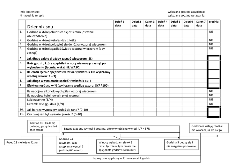 Imię i nazwisko: Nr tygodnia terapii: wskazana godzina zasypiania: wskazana godzina wstawania: Dzień 1 data Dziennik snu 1. 2. 3. 4. 5. 6. 7. 8. 9. Dzień 2 data Dzień 3 data Dzień 4 data Dzień 5 data Dzień 6 data średnia NIE Godzina o której obudziłeś się dziś rano (ostatnie obudzedzenie) Godzina o której wstałeś dziś z łóżka Godzina o której położyłeś się do łóżka wczoraj wieczorem Godzina o której zgasiłeś światło wczoraj wieczorem (aby zasnąć) NIE NIE NIE Jak długo zajęło ci ażeby zasnąć wieczorem (SL) Ilość godzin, które spędziłeś w nocy nie mogąc zasnąć po wybudzeniu (łącznie, wskaźnik WASO) Ile czasu łącznie spędziłeś w łóżku? (wskaźnik TIB wyliczamy według wzoru: 2 – 3) Jak długo w tym czasie spałeś? (wskaźnik TST) Efektywność snu w % (wyliczamy według wzoru: 8/7 *100) NIE NIE NIE NIE Ile napojów alkoholowych piłeś wczoraj wieczorem Ile napojów kofeinowych piłeś wczoraj Leki nasenne (T/N) Drzemki w ciągu dnia (T/N) 10. 11. Dzień 7 data Jak bardzo wypoczęty czułeś się rano? (0-10) Czy twój sen był wysokiej jakości? (0-10) Godzina 23 – kładę się do łóżka, gaszę światło i chce zasnąć Przed 23 nie leżę w łóżku Łączny czas snu wynosi 4 godziny, efektywność snu wynosi 4/7 = 57% Godzina 24 zasypiam, czas zasypiania wynosi 1 godzinę (60 minut) W nocy wybudzam się ok 3 razy i łącznie w tym czasie nie śpię około godziny (60 minut) Łączny czas spędzony w łóżku wynosi 7 godzin Godzina 6 wstaję z łóżka i nie wracam już do niego Godzina 5 budzę się i nie zasypiam ponownie
