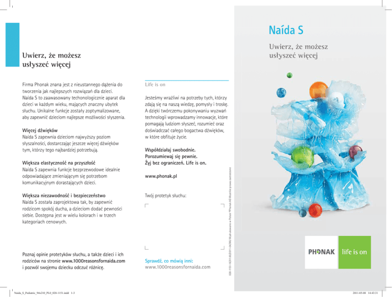 Uwierz, że możesz usłyszeć więcej Uwierz, że możesz usłyszeć więcej Więcej dźwięków Naída S zapewnia dzieciom najwyższy poziom słyszalności, dostarczając jeszcze więcej dźwięków tym, którzy tego najbardziej potrzebują. Większa elastyczność na przyszłość Naída S zapewnia funkcje bezprzewodowe idealnie odpowiadające zmieniającym się potrzebom komunikacyjnym dorastających dzieci. Większa niezawodność i bezpieczeństwo Naída S została zaprojektowa tak, by zapewnić rodzicom spokój ducha, a dzieciom dodać pewności siebie. Dostępna jest w wielu kolorach i w trzech kategoriach cenowych. Poznaj opinie protetyków słuchu, a także dzieci i ich rodziców na stronie www.1000reasonsfornaida.com i pozwól swojemu dziecku odczuć różnicę. Naida_S_Pediatric_94x210_PL0_028-1151.indd 1-3 Life is on Jesteśmy wrażliwi na potrzeby tych, którzy zdają się na naszą wiedzę, pomysły i troskę. A dzięki twórczemu pokonywaniu wyzwań technologii wprowadzamy innowacje, które pomagają ludziom słyszeć, rozumieć oraz doświadczać całego bogactwa dźwięków, w które obfituje życie. Współdziałaj swobodnie. Porozumiewaj się pewnie. Żyj bez ograniczeń. Life is on. www.phonak.pl Twój protetyk słuchu: Sprawdź, co mówią inni: www.1000reasonsfornaida.com 028-1151-16/V1.00/2011-04/WU Wydrukowano w Polsce ©Phonak AG Wszelkie prawa zastrzeżone Firma Phonak znana jest z nieustannego dążenia do tworzenia jak najlepszych rozwiązań dla dzieci. Naída S to zaawasowany techonologicznie aparat dla dzieci w każdym wieku, mających znaczny ubytek słuchu. Unikalne funkcje zostały zoptymalizowane, aby zapewnić dzieciom najlepsze możliwości słyszenia. 2011-05-08 14:43:31 Więcej dźwięków Dzieci powinny mieć możliwość poznania wszystkich dźwięków współtworzących ich świat. Dwiema funkcjami najskuteczniej zapewniającymi słyszalność i wspomagającymi rozwój dziecka są SoundRecover i WhistleBlock. Przełom w słyszalności Znaczny ubytek słuchu wiąże się często z trudnościami w słyszeniu wysokich częstotliwości. Unikalny układ SoundRecover poprawia słyszalność wszystkich tak istotnych dla rozwoju dziecka dźwięków o wysokich częstotliwościach – takich jak mowa, śpiew ptaków czy dzwonek u drzwi – których nie można usłyszeć przy zastosowaniu tradycyjnego wzmocnienia. Brak sprzężenia, więcej dźwięków Funkcja WhistleBlock efektywnie eliminuje sprzężenie, pozwalając dzieciom na korzystanie ze zwiększonego wzmocnienia, niezależnie do tego, gdzie są i co robią. Zaprojektowany z myślą o przyszłości Możliwości aparatów Naída S rosną razem z potrzebami dziecka. Aparaty wyposażone są w zaawansowane technologie, takie jak mikrofony kierunkowe, zapewniające lepszą słyszalność w hałasie oraz automatykę, która odpowiednio dostosowuje parametry aparatu do zmieniających się warunków słyszenia. Naida_S_Pediatric_94x210_PL0_028-1151.indd 4-6 Łatwiejszy dostęp do świata komunikacji bezprzewodowej Większa niezawodność i bezpieczeństwo Czerpanie pełnej radości z życia jest ściśle powiązane ze swobodnym dostępem do świata komunikacji. Naída S, dzięki rozwiązaniom bezprzewodowym, odkrywa przed dziećmi nowe możliwości. Aparaty słuchowe powinny być wytrzymałe i niezawodne, żeby dzieci mogły aktywnie i bez ograniczeń uczestniczyć w przeróżnych zabawach. System Dynamic FM pokonuje dystans System Dynamic FM zapewnia wyjątkową wyrazistość dźwięków podczas porozumiewania się na odległość, w głośnym otoczeniu i tam, gdzie występuje pogłos. Idealny w codziennym życiu: sprawdza się w domu, w szkole i w samochodzie. Otwarty świat komunikacji bezprzewodowej Urządzenie iCom to idealny towarzysz dziecka w świecie komunikacji bezprzewodowej. Łączy się w techonologii Bluetooth z wieloma urządzeniami mulitmedialnymi, takimi jak telefony, komputery czy odtwarzacze MP3. Wodoodporny Najbardziej miarodajnym testem niezawodności aparatów jest ich codzienne użytkowanie. Właśnie wtedy wytrzymała i odporna na wilgoć i zanieczyszczenia obudowa Naídy S pokazuje swoją przewagę. Bezpieczeństwo na pierwszym miejscu Specjalne zabezpieczenie sprawia, że bateria jest niedostępna dla dziecka. Phonak TVLink Dzieci uwielbiają telewizję, a Phonak TVLink to idealne rozwiązanie zapewniające niezwykłe doznania słuchowe. Dzięki Phonak TVLink i łącza Bluetooth, połączenie aparatów i TV jest wyjątkowo proste, a unikalna transmisja StereoSound zapewnia znakomitą jakość dźwięku. 2011-05-08 14:43:53