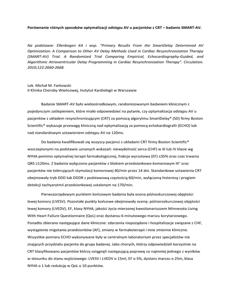 Porównanie różnych sposobów optymalizacji odstępu AV u pacjentów z CRT – badanie SMART-AV. Na podstawie: Ellenbogen KA i wsp. “Primary Results From the SmartDelay Determined AV Optimization: A Comparison to Other AV Delay Methods Used in Cardiac Resynchronization Therapy (SMART-AV) Trial. A Randomized Trial Comparing Empirical, Echocardiography-Guided, and Algorithmic Atrioventricular Delay Programming in Cardiac Resynchronization Therapy”. Circulation. 2010;122:2660-2668. Lek. Michał M. Farkowski II Klinika Choroby Wieńcowej, Instytut Kardiologii w Warszawie Badanie SMART-AV było wieloośrodkowym, randomizowanym badaniem klinicznym z pojedynczym zaślepieniem, które miało odpowiedzieć na pytanie, czy optymalizacja odstępu AV u pacjentów z układem resynchronizującym (CRT) za pomocą algorytmu SmartDelay® (SD) firmy Boston Scientific® wykazuje przewagę kliniczną nad optymalizacją za pomocą echokardiografii (ECHO) lub nad standardowym ustawieniem odstępu AV na 120ms. Do badania kwalifikowali się wszyscy pacjenci z układami CRT firmy Boston Scientific® wszczepionymi na podstawie uznanych wskazań: niewydolność serca (CHF) w III lub IV klasie wg NYHA pomimo optymalnej terapii farmakologicznej, frakcja wyrzutowa (EF) ≤35% oraz czas trwania QRS ≥120ms. Z badania wyłączono pacjentów z blokiem przedsionkowo-komorowym III° oraz pacjentów nie tolerujących stymulacji komorowej 40/min przez 14 dni. Standardowe ustawienia CRT obejmowały tryb DDD lub DDDR z podstawową częstością 60/min, wyłączoną histerezą i progiem detekcji tachyarytmii przedsionkowej ustalonym na 170/min. Pierwszorzędowym punktem końcowym badania była ocena późnoskurczowej objętości lewej komory (LVESV). Pozostałe punkty końcowe obejmowały ocenę: późnorozkurczowej objętości lewej komory (LVEDV), EF, klasy NYHA, jakości życia mierzonej kwestionariuszem Minnesota Living With Heart Failure Questionnaire (QoL) oraz dystansu 6 minutowego marszu korytarzowego. Ponadto zbierano następujące dane kliniczne: zdarzenia niepożądane i hospitalizacje związane z CHF, wystąpienie migotania przedsionków (AF), zmiany w farmakoterapii i inne zmienne kliniczne. Wszystkie pomiary ECHO wykonywane były w centralnym laboratorium przez specjalistów nie znających przydziału pacjenta do grupy badanej. Jako chorych, którzy odpowiedzieli korzystnie na CRT klasyfikowano pacjentów którzy osiągnęli następującą poprawę co najmniej jednego z wyników w stosunku do stanu wyjściowego: LVESV i LVEDV o 15ml, EF o 5%, dystans marszu o 25m, klasa NYHA o 1 lub redukcję w QoL o 10 punktów. Analiza statystyczna została zaprojektowana aby wykazać przewagę (superiority) optymalizacji AV (bez rozróżnienia na SD i ECHO) nad stałym odstępem AV 120ms w zakresie LVESD o klinicznie istotną wartość 15ml (SD 60ml). Przyjmując błąd alfa 0,05 i moc testu 80%, wyliczono docelową liczebność każdej z grup na 253 pacjentów (razem 759 pacjentów). Analizy statystyczne ustalono stopniowo (gate-keeping): dopiero po ustaleniu przewagi SD nad stałym AV można było przeprowadzać testy statystyczne dla kolejnych porównań, w tym dla porównań z ECHO oraz drugorzędowych punktów końcowych. Obserwacja trwała 6 miesięcy, z dodatkową wizytą kontrolną po 3 miesiącach od wszczepienia, w trakcie której wykonywano dodatkową optymalizację algorytmu SD. Z 1060 pacjentów, którzy podpisali formularz świadomej zgody, do analizy włączono dane 980. Charakterystyki pacjentów były porównywalne w grupach badanych. Średni czas obserwacji wyniósł 5,8±1,6 miesiąca. Ok. 80% urządzeń zaprogramowano jako DDD, pozostałe jako DDDR. Ok. 75% pacjentów miało <30% stymulacji przedsionkowej, mediana stymulacji prawej komory wyniosła 97,8% a lewej 98,2%. W zakresie klasy NYHA, 75% pacjentów sklasyfikowano jako odpowiadających na CRT; w zakresie pozostałych wskaźników - 48-61% pacjentów. W zakresie pierwszorzędowego punktu końcowego, nie wykazano istotnej statystycznie różnicy w LVESV pomiędzy grupami z optymalizacją i stałym AV (p=0,52). Około 14% randomizowanych pacjentów nie poddano ocenie pierwszorzędowego punktu końcowego. W analizie eksploratywnej, w zakresie drugorzędowych punktów końcowych, nie wykazano istotnych różnic pomiędzy grupami z optymalizacją i stałym AV. W zakresie klinicznych punktów końcowych, w tym śmiertelności, nie wykazano istotnych różnic pomiędzy grupami z optymalizacją i stałym AV. W porównaniu do stałego odstępu AV 120ms, u 69% pacjentów w grupie SD® i 57% w grupie ECHO ustawiono odstęp AV dłuższy o >30ms od kontrolnego. Podsumowując, randomizowane badanie kliniczne SMART-AV nie udowodniło przewagi optymalizacji odstępu AV za pomocą algorytmu SD® lub ECHO w porównaniu do stałego AV 120ms w zakresie LVESD. Eksploratywna analiza pozostałych punktów końcowych również nie wykazała istotnych różnic pomiędzy sposobami optymalizacji odstępu AV. Pomimo relatywnie dużej utraty pacjentów z badania (ok. 14%), wyniki we wszystkich analizach były zbieżne i wydają się wiarygodne. Badanie nie wyklucza jednak, że u wybranych pacjentów optymalizacja odstępu AV może przynieść wymierne korzyści. Badanie zostało sfinansowane przez firmę Boston Scientific®.