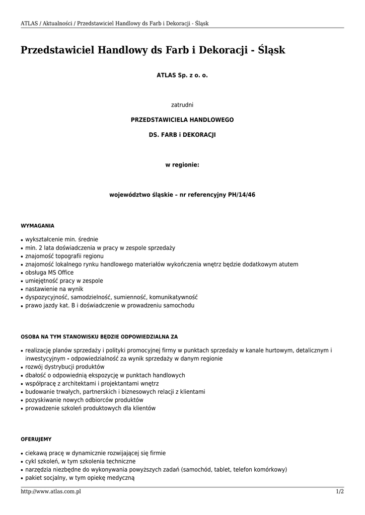 ATLAS / Aktualności / Przedstawiciel Handlowy ds Farb i Dekoracji - Śląsk Przedstawiciel Handlowy ds Farb i Dekoracji - Śląsk ATLAS Sp. z o. o. zatrudni PRZEDSTAWICIELA HANDLOWEGO DS. FARB i DEKORACJI w regionie: województwo śląskie – nr referencyjny PH/14/46 WYMAGANIA ● ● ● ● ● ● ● ● ● wykształcenie min. średnie min. 2 lata doświadczenia w pracy w zespole sprzedaży znajomość topografii regionu znajomość lokalnego rynku handlowego materiałów wykończenia wnętrz będzie dodatkowym atutem obsługa MS Office umiejętność pracy w zespole nastawienie na wynik dyspozycyjność, samodzielność, sumienność, komunikatywność prawo jazdy kat. B i doświadczenie w prowadzeniu samochodu OSOBA NA TYM STANOWISKU BĘDZIE ODPOWIEDZIALNA ZA ● ● ● ● ● ● ● realizację planów sprzedaży i polityki promocyjnej firmy w punktach sprzedaży w kanale hurtowym, detalicznym i inwestycyjnym - odpowiedzialność za wynik sprzedaży w danym regionie rozwój dystrybucji produktów dbałość o odpowiednią ekspozycję w punktach handlowych współpracę z architektami i projektantami wnętrz budowanie trwałych, partnerskich i biznesowych relacji z klientami pozyskiwanie nowych odbiorców produktów prowadzenie szkoleń produktowych dla klientów OFERUJEMY ● ● ● ● ciekawą pracę w dynamicznie rozwijającej się firmie cykl szkoleń, w tym szkolenia techniczne narzędzia niezbędne do wykonywania powyższych zadań (samochód, tablet, telefon komórkowy) pakiet socjalny, w tym opiekę medyczną http://www.atlas.com.pl 1/2 ATLAS / Aktualności / Przedstawiciel Handlowy ds Farb i Dekoracji - Śląsk Zainteresowane osoby prosimy o przesyłanie ofert z dopiskiem: „Wyrażam zgodę na przechowywanie i przetwarzanie moich danych osobowych dla potrzeb niezbędnych do realizacji procesu rekrutacji zgodnie z ustawą z dn.29.08.1997r. o Ochronie Danych Osobowych Dz. Ust. nr 133 poz. 883” na adres: [email protected] W temacie wiadomości prosimy podać numer referencyjny! Osoby, których oferty wzbudzą zainteresowanie firmy zostaną telefonicznie poinformowane o terminie spotkania. http://www.atlas.com.pl 2/2