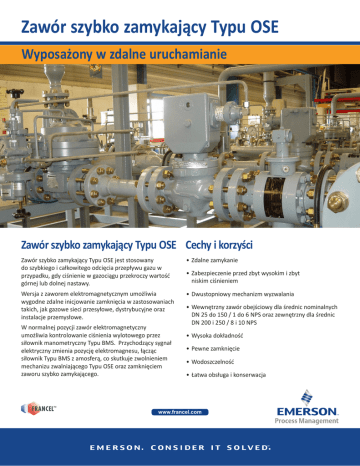Zawór szybko zamykający Typu OSE Wyposażony w zdalne uruchamianie Zawór szybko zamykający Typu OSE Cechy i korzyści Zawór szybko zamykający Typu OSE jest stosowany do szybkiego i całkowitego odcięcia przepływu gazu w przypadku, gdy ciśnienie w gazociągu przekroczy wartość górnej lub dolnej nastawy. •Zdalne zamykanie Wersja z zaworem elektromagnetycznym umożliwia wygodne zdalne inicjowanie zamknięcia w zastosowaniach takich, jak gazowe sieci przesyłowe, dystrybucyjne oraz instalacje przemysłowe. •Dwustopniowy mechanizm wyzwalania W normalnej pozycji zawór elektromagnetyczny umożliwia kontrolowanie ciśnienia wylotowego przez siłownik manometryczny Typu BMS. Przychodzący sygnał elektryczny zmienia pozycję elektromagnesu, łącząc siłownik Typu BMS z amosferą, co skutkuje zwolnieniem mechanizu zwalniającego Typu OSE oraz zamknięciem zaworu szybko zamykającego. •Zabezpieczenie przed zbyt wysokim i zbyt niskim ciśnieniem •Wewnętrzny zawór obejściowy dla średnic nominalnych DN 25 do 150 / 1 do 6 NPS oraz zewnętrzny dla średnic DN 200 i 250 / 8 i 10 NPS •Wysoka dokładność •Pewne zamknięcie •Wodoszczelność •Łatwa obsługa i konserwacja TM www.francel.com Zawór szybko zamykający Typu OSE Schemat działania Elektrozawór CIŚNIENIE WLOTOWE CIŚNIENIE WYLOTOWE CIŚNIENIE ATMOSFERYCZNE Specyfikacja zaworu Typu OSE Rozmiary korpusów oraz przyłącza: Stal WCC DN 25, 50, 80, 100, i 150 / 1 i 2 NPT; NPS 1, 2, 3, 4, i 6 CL150 RF, CL300 RF, lub CL600 RF Stal LCC DN 200 i 250 / NPS 8 i 10 CL150 RF, CL300 RF, lub CL600 RF Żeliwo DN 25, 50, 80, 100, i 150 / 1 i 2 NPT; NPS 1, 2, 3, 4, i 6 CL125 FF lub CL250 RF Maksymalna nastawa ciśnienia 100 bar / 1450 psig Maksymalne ciśnienia wlotowe: 100 bar / 1450 psig Przyłącze odpowietrznika: 1/4 NPT Emerson Process Management Regulator Technologies, Inc. Americas - Worldwide Headquarters Europe 310 East University Drive T: +39 051 4190606 McKinney, Texas 75069-1872, USA T: +1 800 558 5853 T: +1 972 548 3574 F: +1 972 542 6433 www.emersonprocess.com/regulators Minimalna nastawa ciśnienia: 10 mbar / 4,02 cali w.c. Zakres temperatur: -30 do 71°C / -22 do 160°F Impuls ciśnienia: Zewnętrzny Asia Pacific T: +65 6770 8337 Middle East and Africa T: +011 971 4811 8100 D352012XPL2 © 2012 Emerson Process Management Regulator Technologies, Inc.; Wszelkie prawa zastrzeżone. 09/13. Fisher, Emerson Process Management oraz logo Emerson Process Management są znakami jednej z firm grupy Emerson Process Management. Wszystkie inne znaki towarowe są własnością ich prawowitych właścicieli. TM