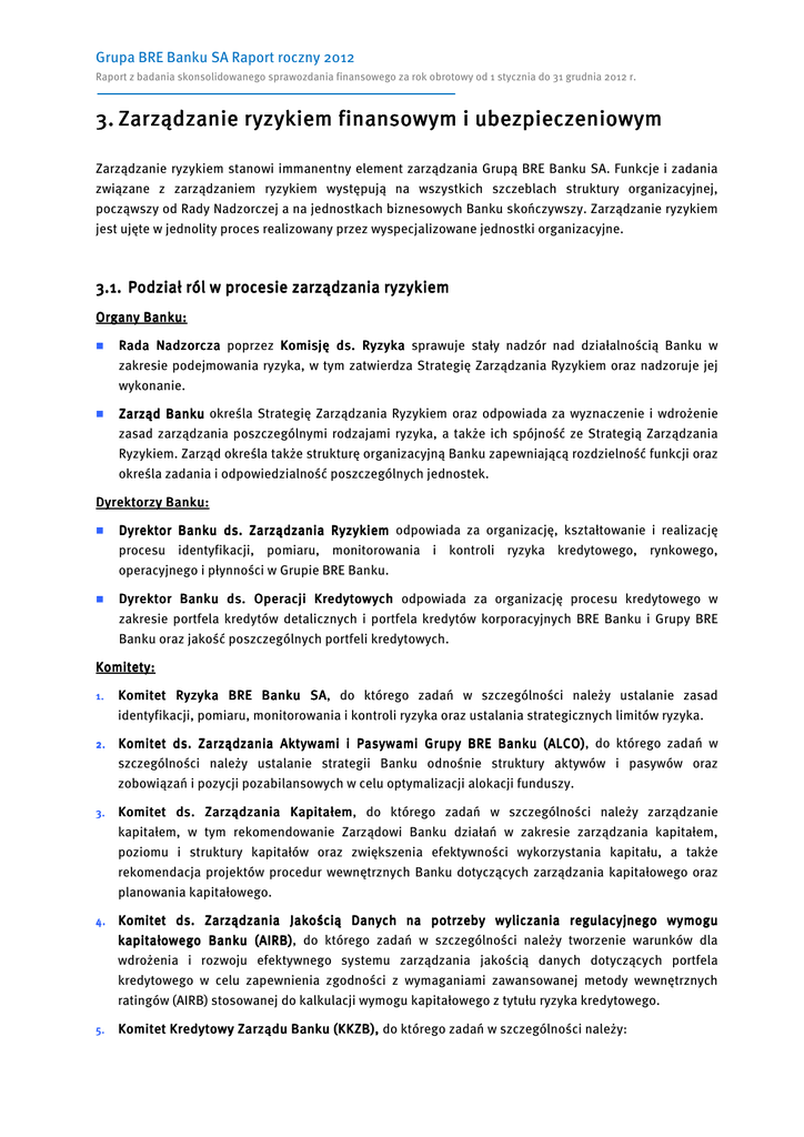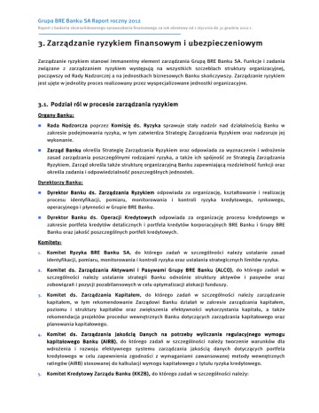 Grupa BRE Banku SA Raport roczny 2012 Raport z badania skonsolidowanego sprawozdania finansowego za rok obrotowy od 1 stycznia do 31 grudnia 2012 r. 3. Zarządzanie Zarządzanie ryzykiem finansowym i ubezpieczeniowym Zarządzanie ryzykiem stanowi immanentny element zarządzania Grupą BRE Banku SA. Funkcje i zadania związane z zarządzaniem ryzykiem występują na wszystkich szczeblach struktury organizacyjnej, począwszy od Rady Nadzorczej a na jednostkach biznesowych Banku skończywszy. Zarządzanie ryzykiem jest ujęte w jednolity proces realizowany przez wyspecjalizowane jednostki organizacyjne. 3.1. Podział ról w procesie zarządzania ryzykiem Organy Banku: Rada Nadzorcza poprzez Komisję Komisję ds. Ryzyka sprawuje stały nadzór nad działalnością Banku w zakresie podejmowania ryzyka, w tym zatwierdza Strategię Zarządzania Ryzykiem oraz nadzoruje jej wykonanie. Zarząd Banku określa Strategię Zarządzania Ryzykiem oraz odpowiada za wyznaczenie i wdrożenie zasad zarządzania poszczególnymi rodzajami ryzyka, a także ich spójność ze Strategią Zarządzania Ryzykiem. Zarząd określa także strukturę organizacyjną Banku zapewniającą rozdzielność funkcji oraz określa zadania i odpowiedzialność poszczególnych jednostek. Dyrektorzy Banku: Dyrektor Banku ds. Zarządzania Ryzykiem odpowiada za organizację, kształtowanie i realizację procesu identyfikacji, pomiaru, monitorowania i kontroli ryzyka kredytowego, rynkowego, operacyjnego i płynności w Grupie BRE Banku. Dyrektor Dyrektor Banku ds. Operacji Kredytowych odpowiada za organizację procesu kredytowego w zakresie portfela kredytów detalicznych i portfela kredytów korporacyjnych BRE Banku i Grupy BRE Banku oraz jakość poszczególnych portfeli kredytowych. Komitety: 1. Komitet Ryzyka Ryzyka BRE Banku SA, SA do którego zadań w szczególności należy ustalanie zasad identyfikacji, pomiaru, monitorowania i kontroli ryzyka oraz ustalania strategicznych limitów ryzyka. 2. Komitet ds. Zarządzania Aktywami i Pasywami Grupy BRE Banku (ALCO), (ALCO) do którego zadań w szczególności należy ustalanie strategii Banku odnośnie struktury aktywów i pasywów oraz zobowiązań i pozycji pozabilansowych w celu optymalizacji alokacji funduszy. 3. Komitet ds. Zarządzania Kapitałem, Kapitałem do którego zadań w szczególności należy zarządzanie kapitałem, w tym rekomendowanie Zarządowi Banku działań w zakresie zarządzania kapitałem, poziomu i struktury kapitałów oraz zwiększenia efektywności wykorzystania kapitału, a także rekomendacja projektów procedur wewnętrznych Banku dotyczących zarządzania kapitałowego oraz planowania kapitałowego. 4. Komitet ds. Zarządzania Jakością Danych na potrzeby wyliczania regulacyjnego wymogu kapitałowego Banku (AIRB), (AIRB) do którego zadań w szczególności należy tworzenie warunków dla wdrożenia i rozwoju efektywnego systemu zarządzania jakością danych dotyczących portfela kredytowego w celu zapewnienia zgodności z wymaganiami zawansowanej metody wewnętrznych ratingów (AIRB) stosowanej do kalkulacji wymogu kapitałowego z tytułu ryzyka kredytowego. 5. Komitet Kredytowy Zarządu Za rządu Banku (KKZB), do którego zadań w szczególności należy: Grupa BRE Banku SA Raport roczny 2012 Raport z badania skonsolidowanego sprawozdania finansowego za rok obrotowy od 1 stycznia do 31 grudnia 2012 r. podejmowanie decyzji kredytowych w odniesieniu do przedsiębiorstw zgodnie z macierzą decyzyjną uzależnioną od ratingu i kwoty zaangażowania, podejmowanie decyzji dotyczących konwersji długu na udziały, akcje, itp., podejmowanie decyzji dotyczących przejęcia nieruchomości w zamian za dług, podejmowanie wszelkich innych decyzji wykraczających poza kompetencje organów decyzyjnych niższych szczebli. 6. Komitet Polityki Kredytowej Bankowości Detalicznej (KPK), (KPK) do którego zadań w szczególności należy: zatwierdzanie lub zmiana metodyki decyzyjnej dotyczącej przyznawania produktów kredytowych bankowości detalicznej, podejmowanie decyzji o dopuszczeniu lub zaprzestaniu sprzedaży produktu kredytowego, monitorowanie jakości i rentowności portfela produktów kredytowych oraz podejmowanie decyzji dotyczących działań w przypadku zaistnienia negatywnych zjawisk związanych z jakością i rentownością tego portfela. 7. którego tórego zadań w szczególności należy: Komitet Kredytowy Bankowości Detalicznej (KKD), do k podejmowanie jednostkowych decyzji kredytowych w odniesieniu do klientów detalicznych w sytuacji, gdy łączne zaangażowanie wobec klienta, kwota transakcji lub ustalone dla klienta/transakcji wartości parametrów ryzyka AIRB (PD/LGD/EL) osiągają określony poziom zarezerwowany dla tego szczebla decyzyjnego, podejmowanie decyzji o przyznaniu, zmianie lub odebraniu kompetencji do podejmowania decyzji dla poszczególnych pracowników Banku. Ponadto w 2012 roku Bank podjął decyzję o powołaniu Komitetu Ryzyka Operacyjnego (KRO), (KRO) do którego zadań będzie należeć m.in.: monitorowanie poziomu ryzyka operacyjnego w Grupie BRE Banku na podstawie regularnych raportów otrzymywanych w ramach systemu kontroli ryzyka operacyjnego, analiza obszarów istotnych z punktu widzenia ryzyka operacyjnego, w tym struktury strat operacyjnych i profilu ryzyka operacyjnego Banku i Grupy BRE Banku, akceptacja i monitorowanie planów naprawczych (follow-up) dla najbardziej istotnych komponentów ryzyka operacyjnego, podejmowanie decyzji i koordynacja działań mających na celu ograniczanie i zarządzanie ryzykiem operacyjnym obejmujących cały Bank oraz monitorowanie sytuacji w tym względzie w spółkach Grupy BRE Banku, nadzór nad przebiegiem oraz analiza wyników metod kontroli i zarządzania ryzykiem operacyjnym stosowanych w Banku, akceptacja metod kontroli i zarządzania ryzykiem operacyjnym stosowanych w Banku i Grupie BRE Banku. Pozostałe jednostki: 1. Jednostki organizacyjne Obszaru Ryzyka Funkcja zarz
